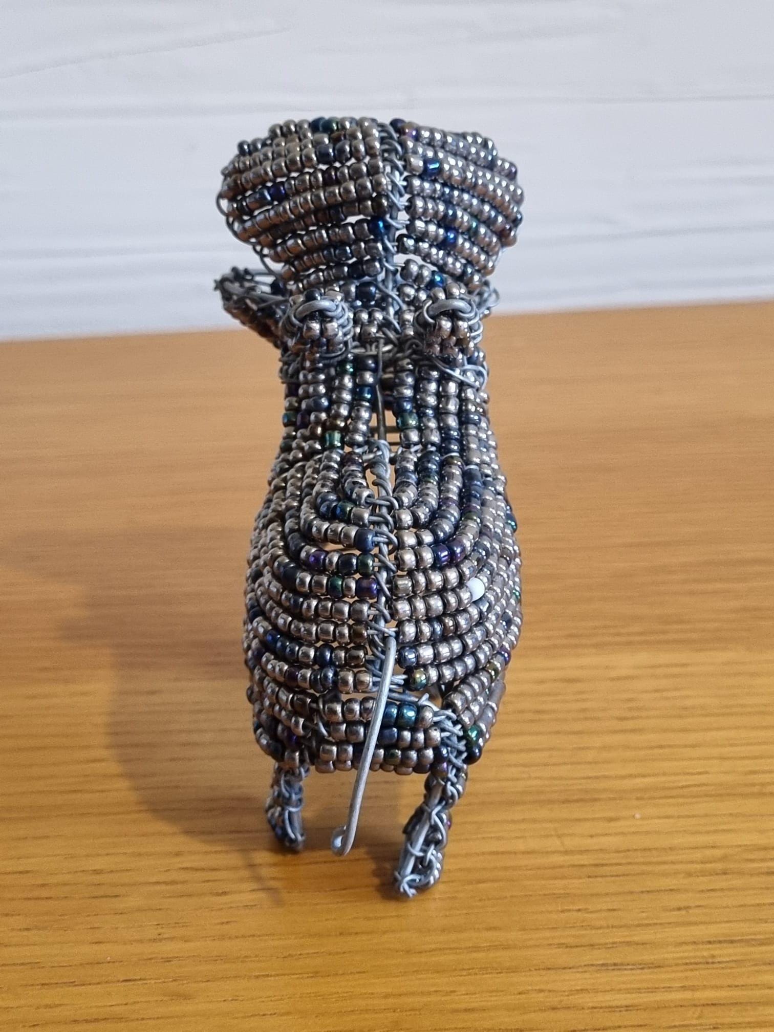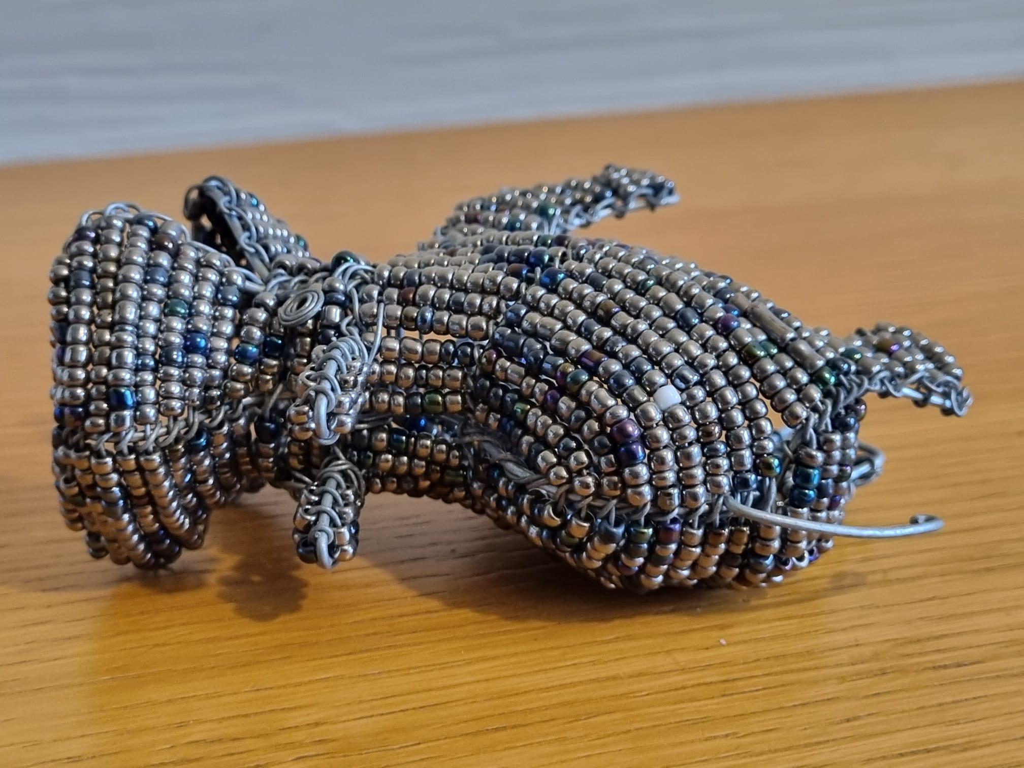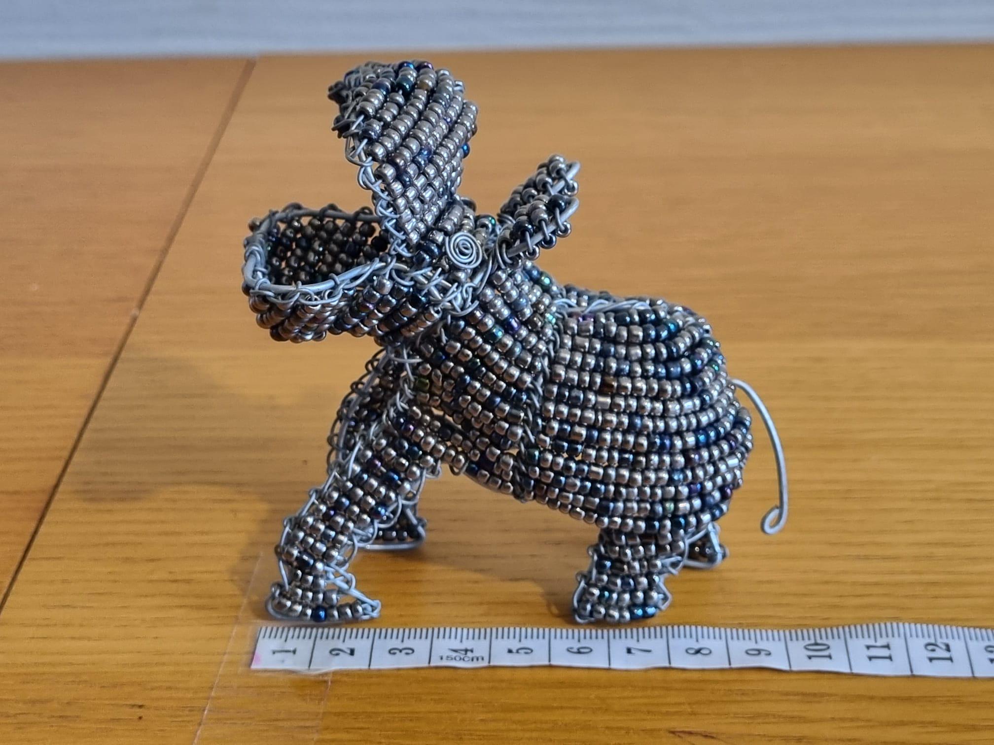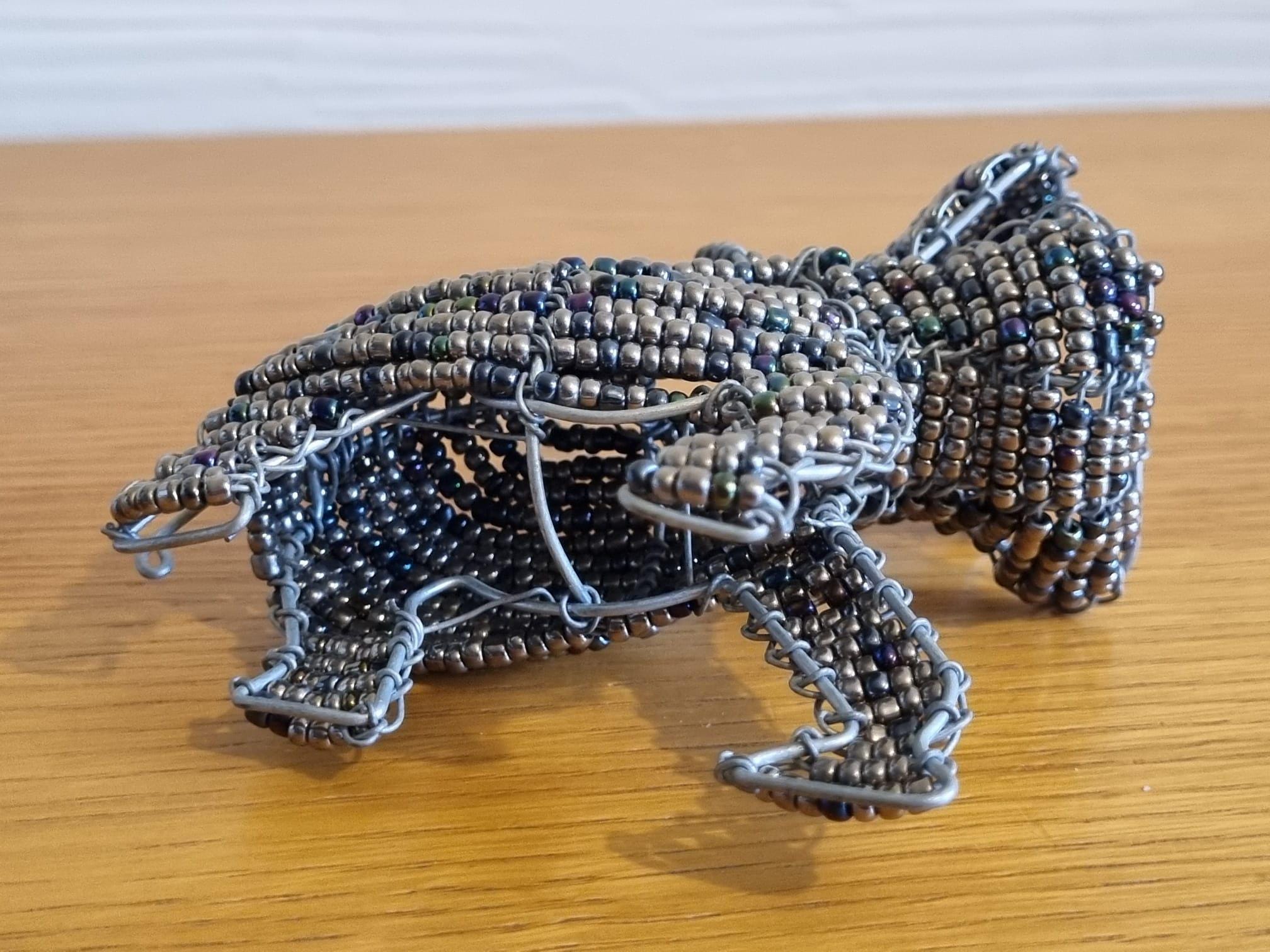 Discover the captivating charm of this handcrafted African hippo figurine, a remarkable piece of art created with meticulous attention to detail using delicate beaded wire. Measuring approximately 10cm from mouth to tail, this majestic figurine will elevate any animal collection with its striking presence. The hippo stands tall and proud, showcasing intricate detailing on its skin that truly brings it to life.