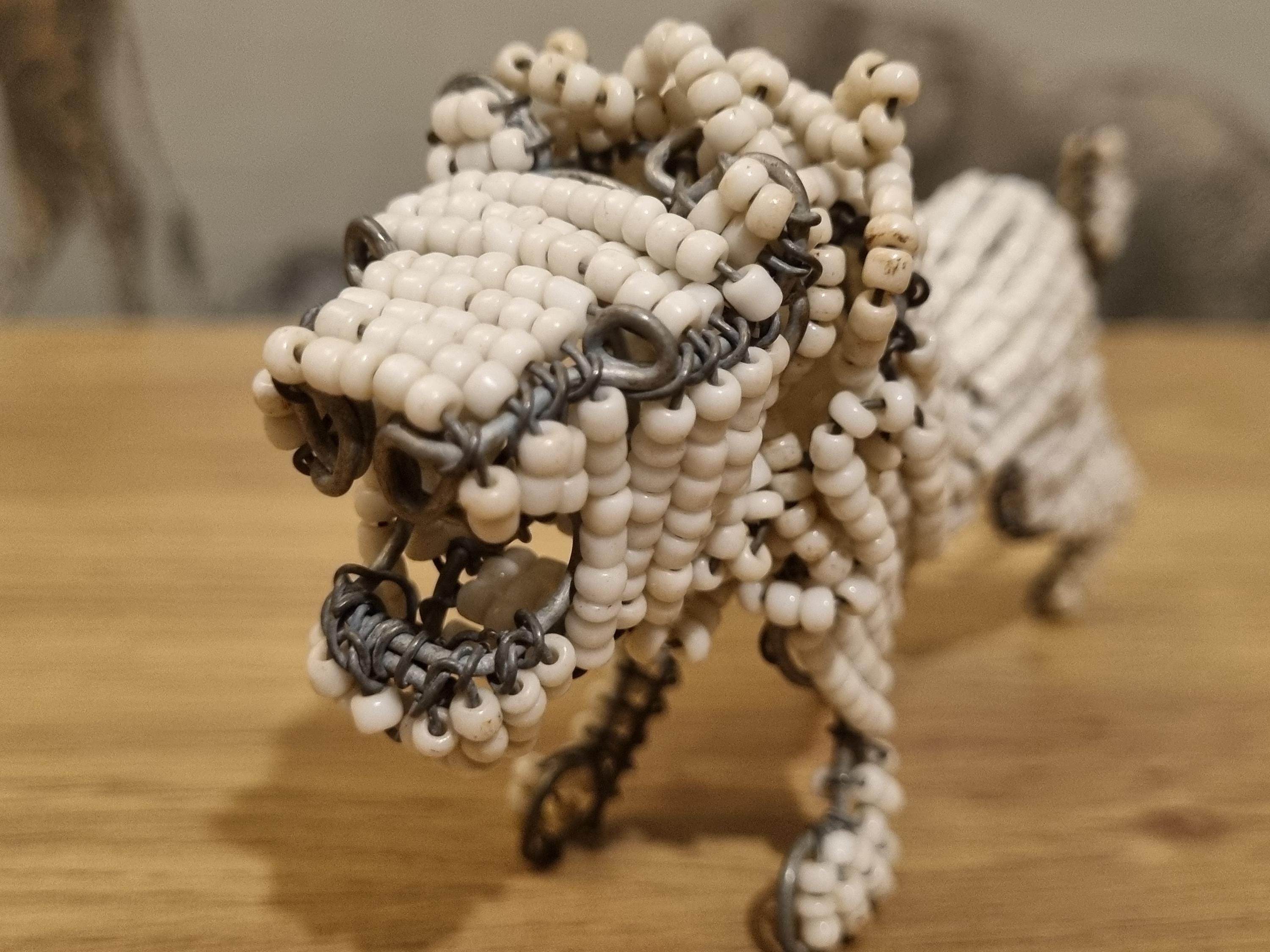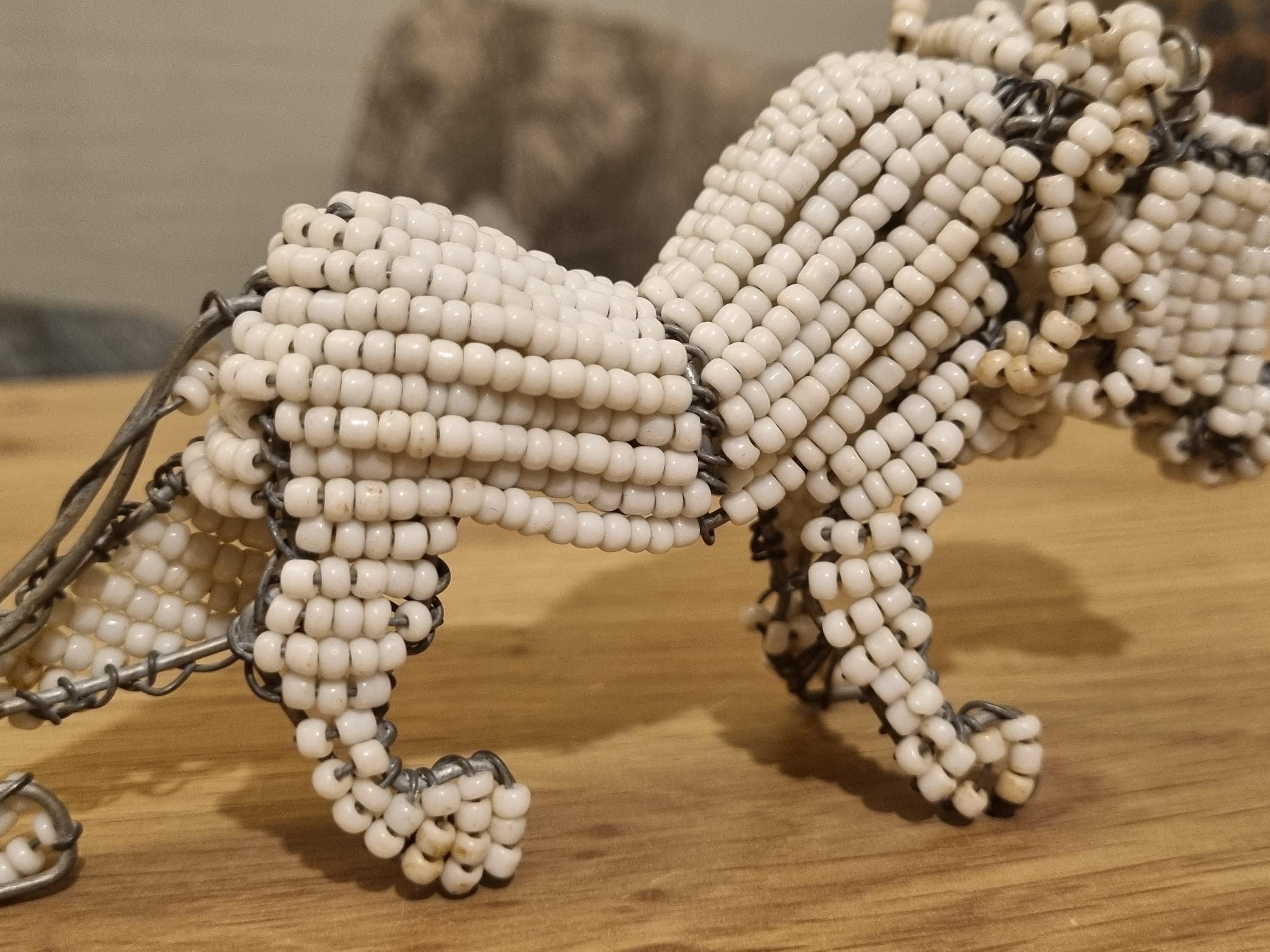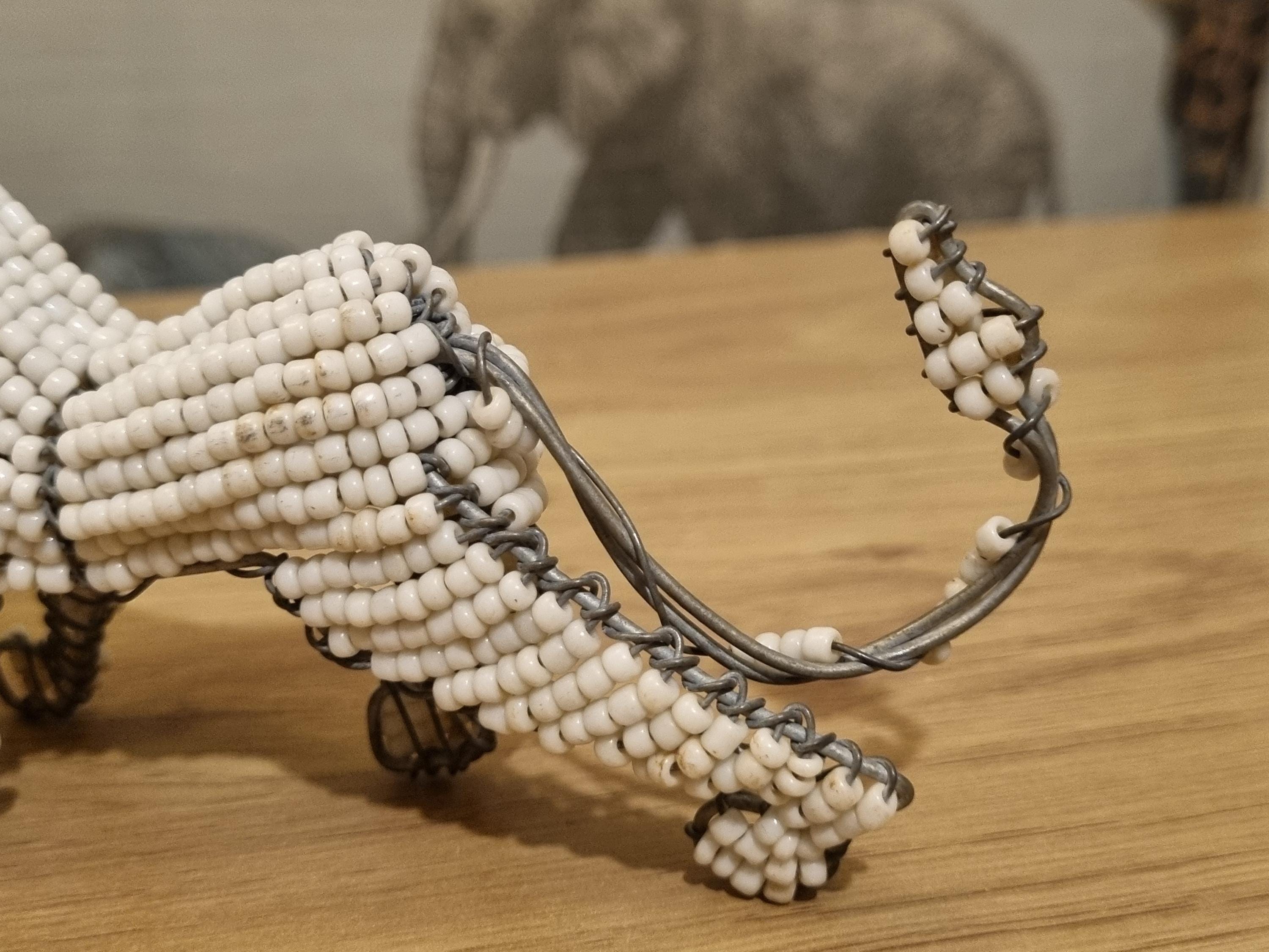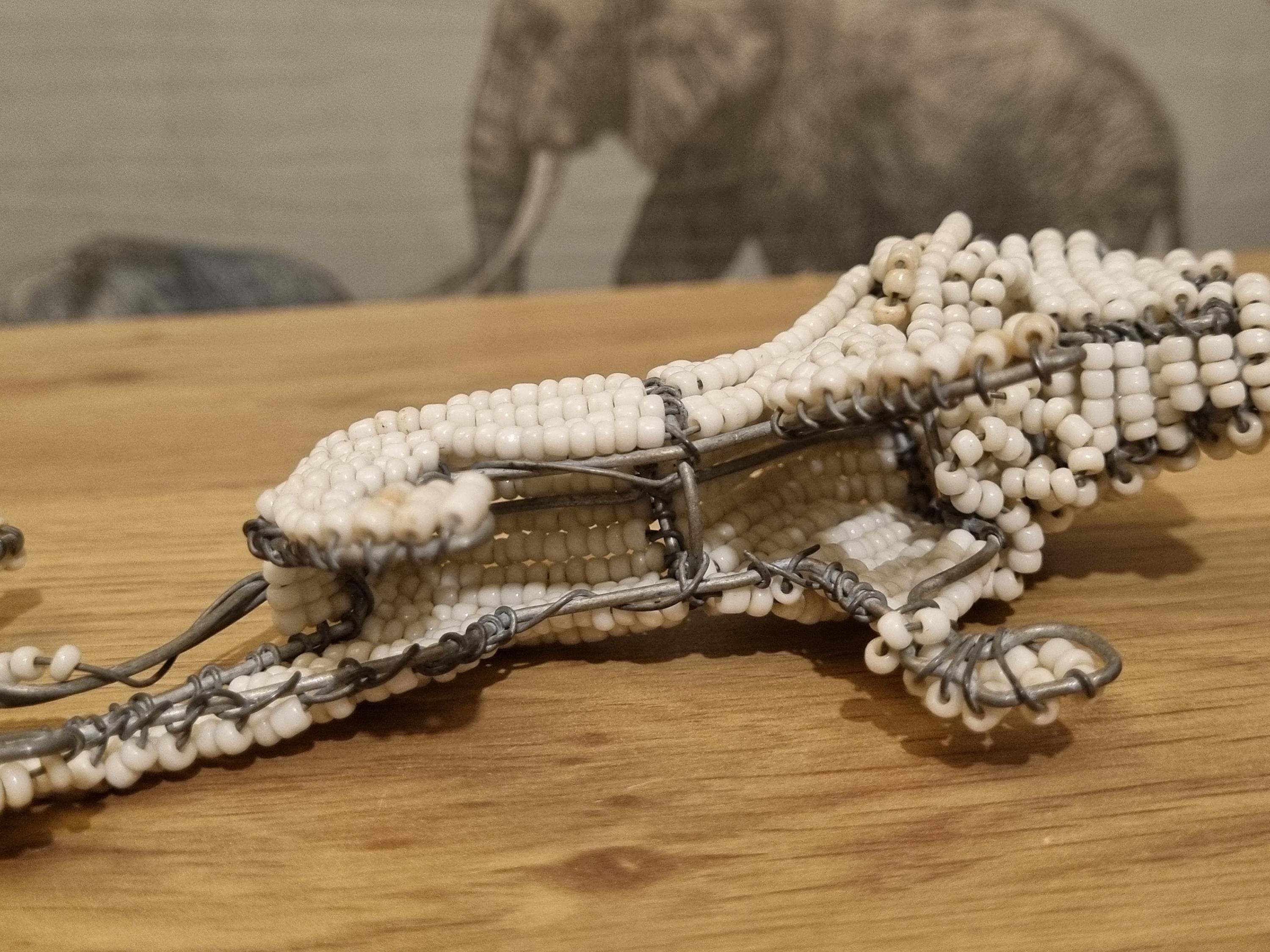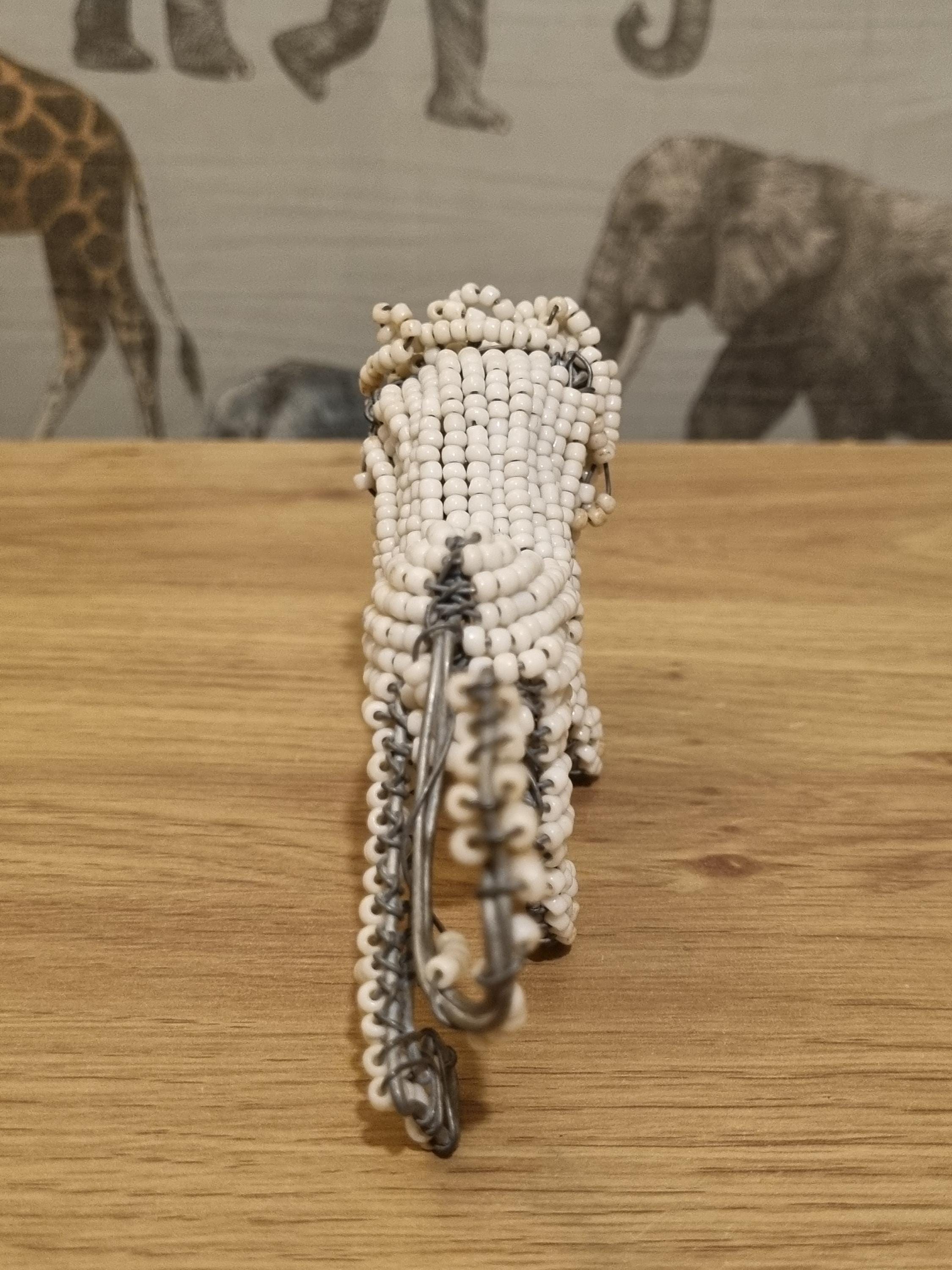 Measuring approximately 19cm in length, this small but impactful sculpture makes a unique shelf ornament, meaningful gift, or part of a growing collection of African beaded animals. Its monochrome design adds a modern touch to any interior style while preserving the authenticity of traditional beadwork.