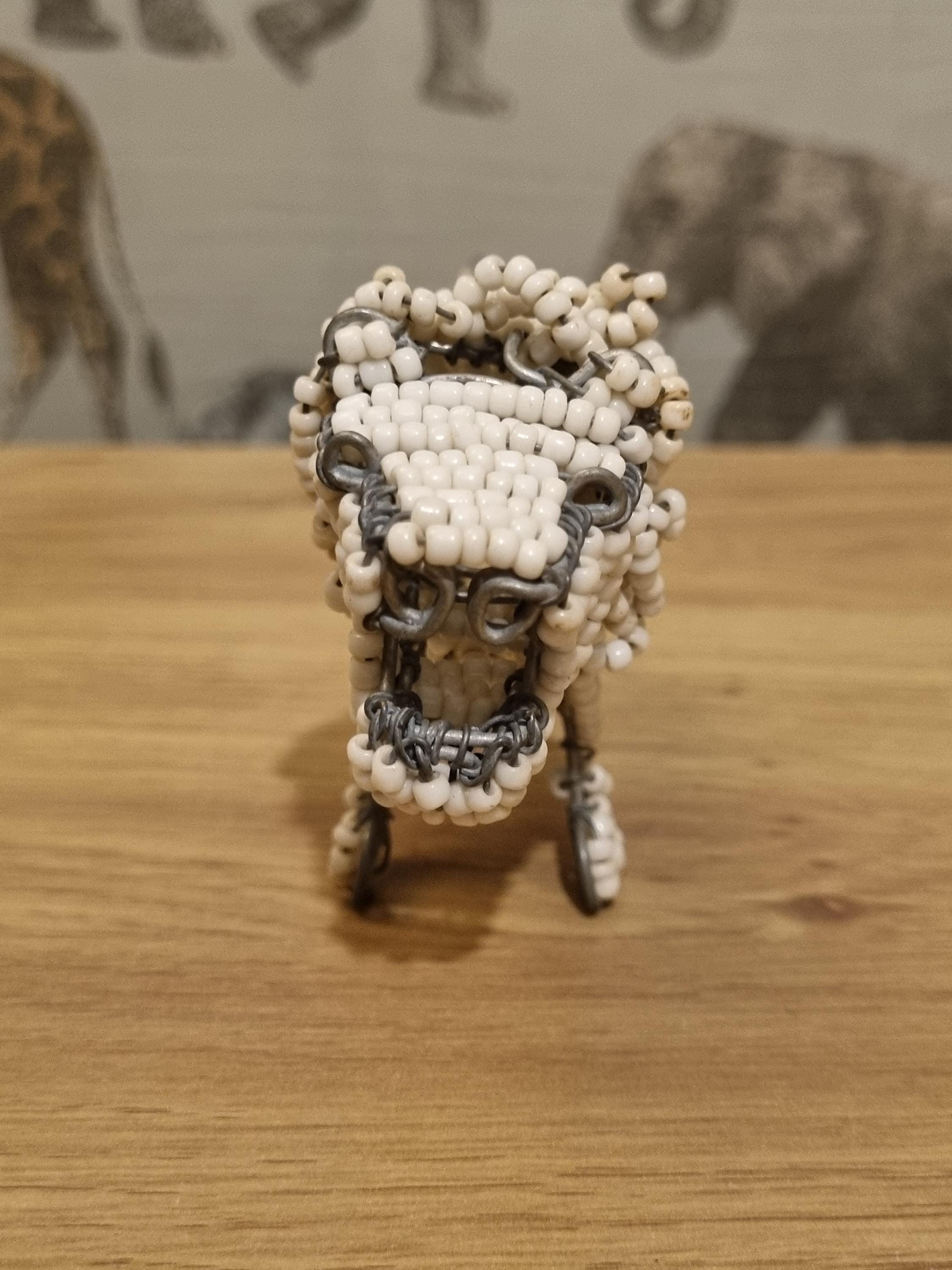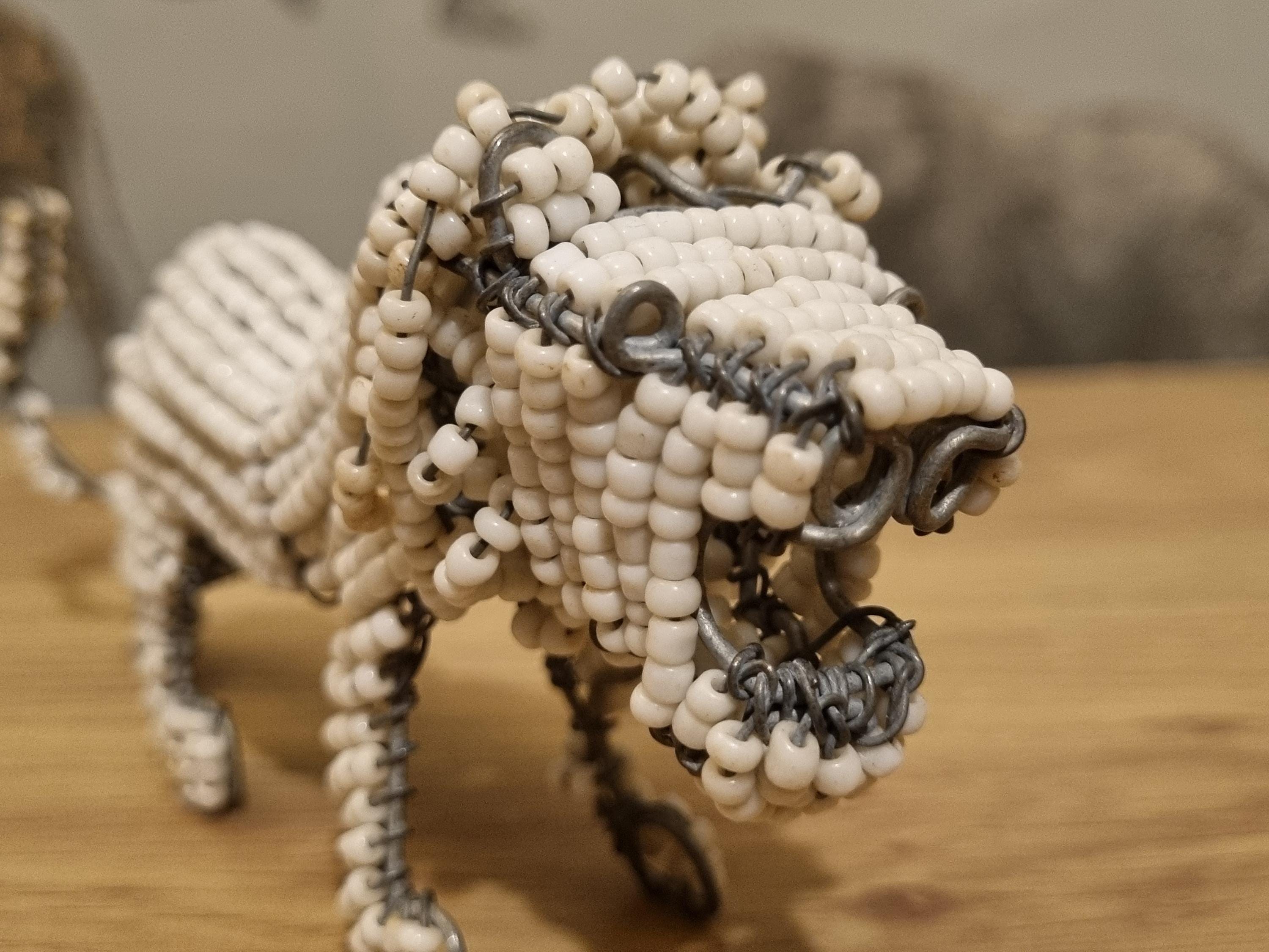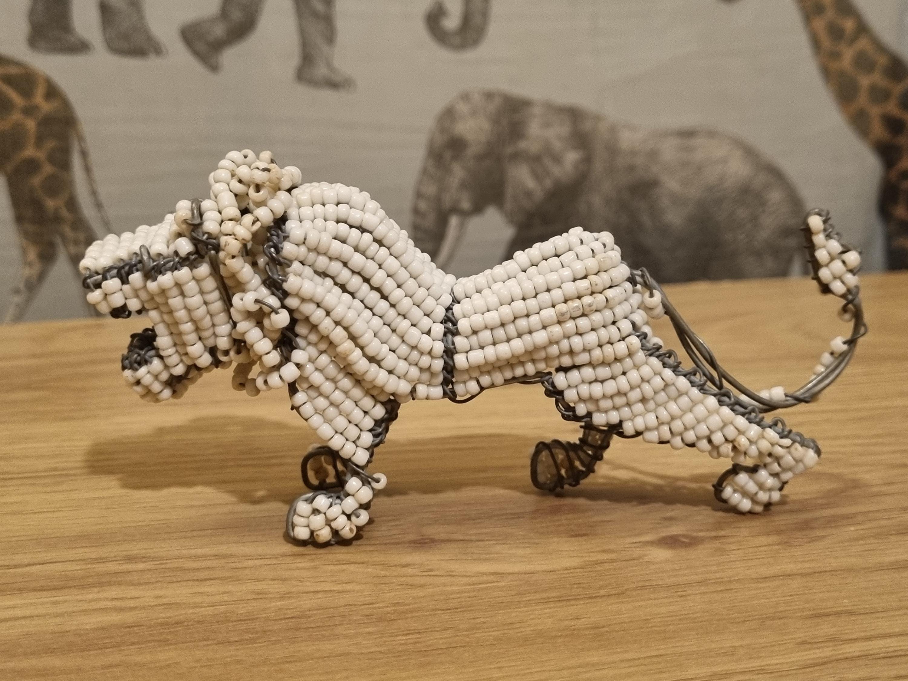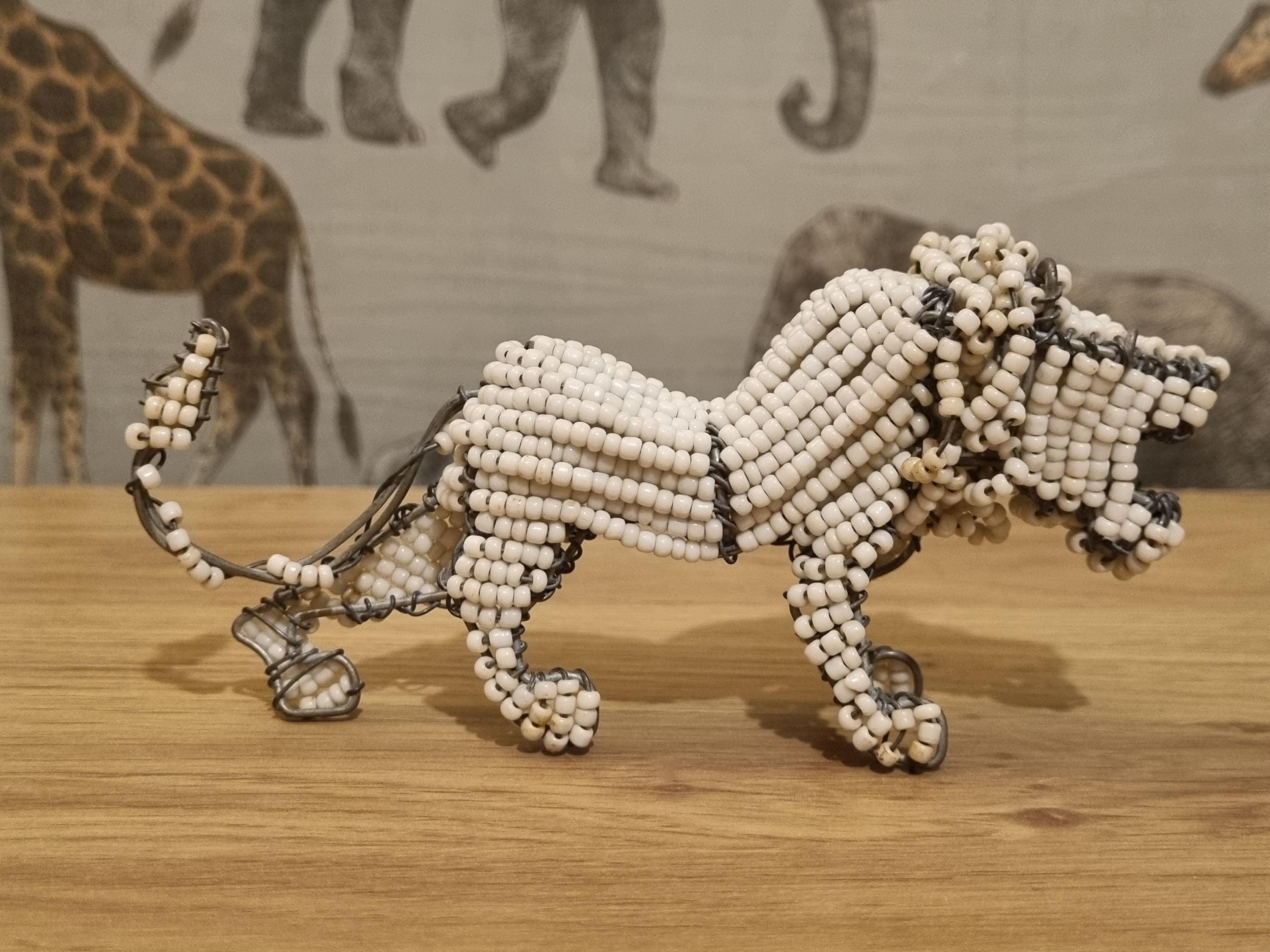 Meet the majestic White Beaded Lion, a striking handmade miniature crafted with exquisite detail by skilled artisans in South Africa. This elegant figure is created from recycled wire and shimmering white and clear glass beads, offering a minimalist yet powerful interpretation of one of nature’s most iconic creatures.