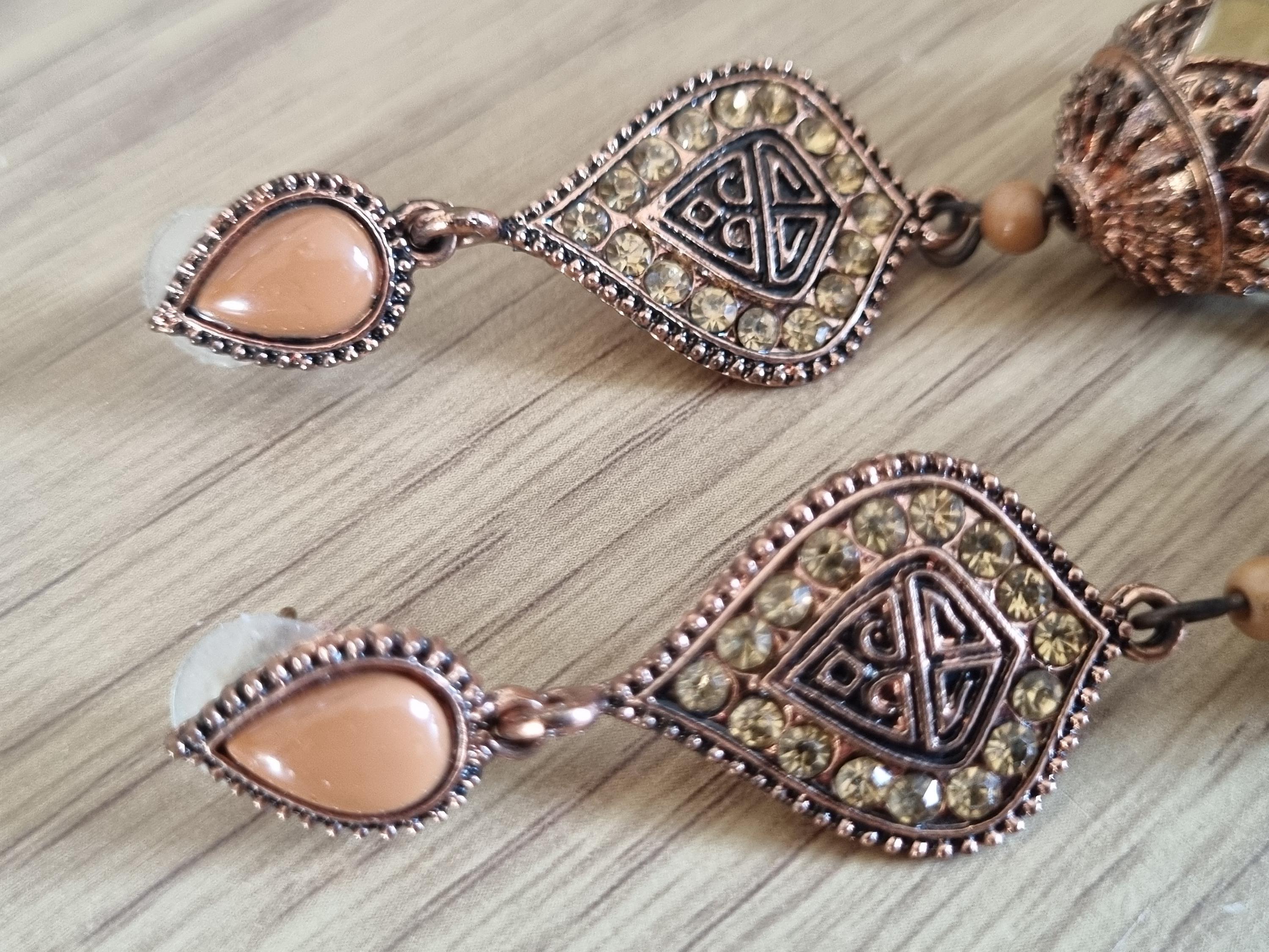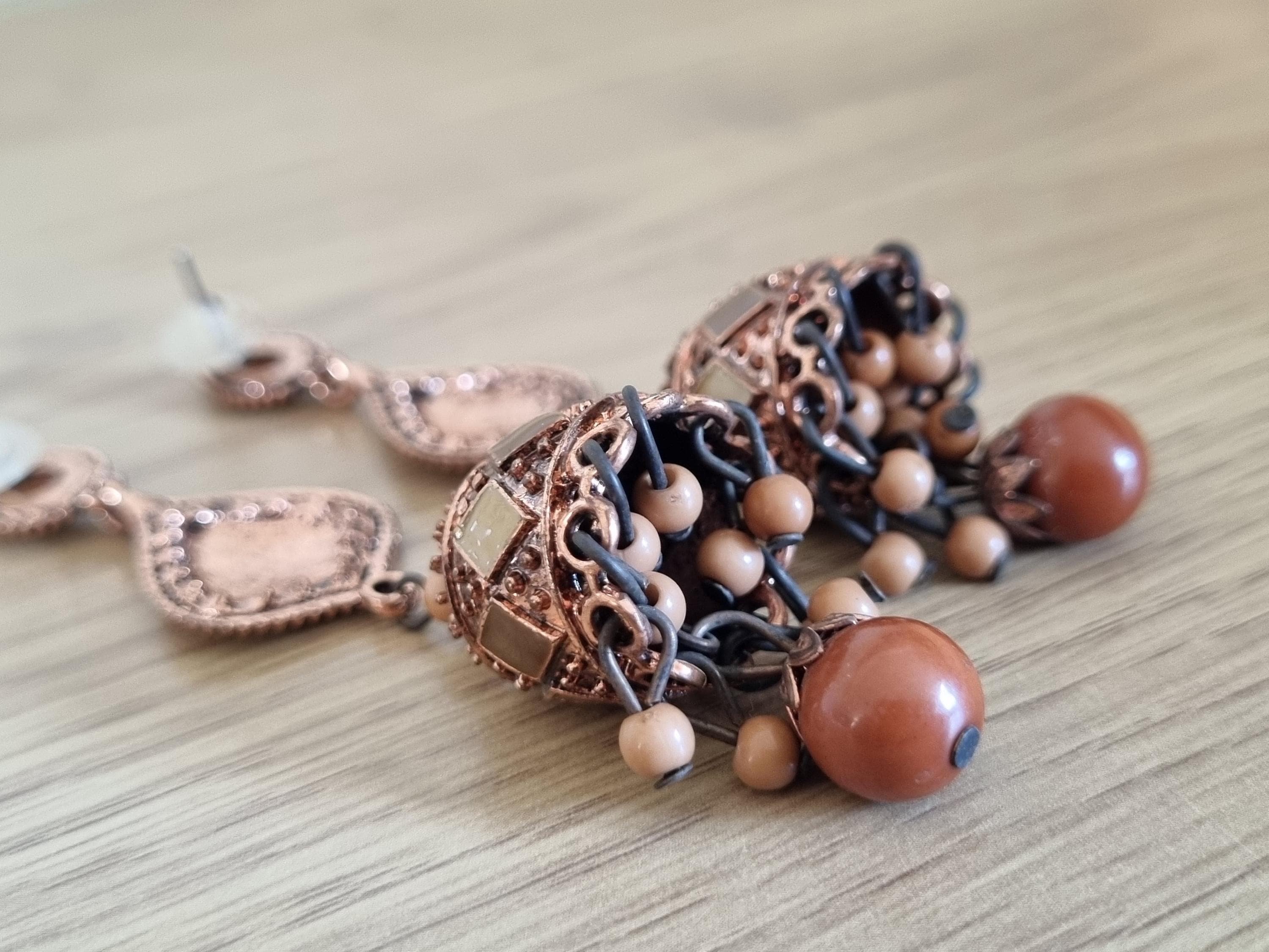 Make a bold statement with these intricately designed drop earrings featuring warm earth tones and antique bronze-style metalwork. With an elegant 8.5cm length, they offer beautiful movement and eye-catching detail, perfect for dressing up casual outfits or completing a bohemian evening look.