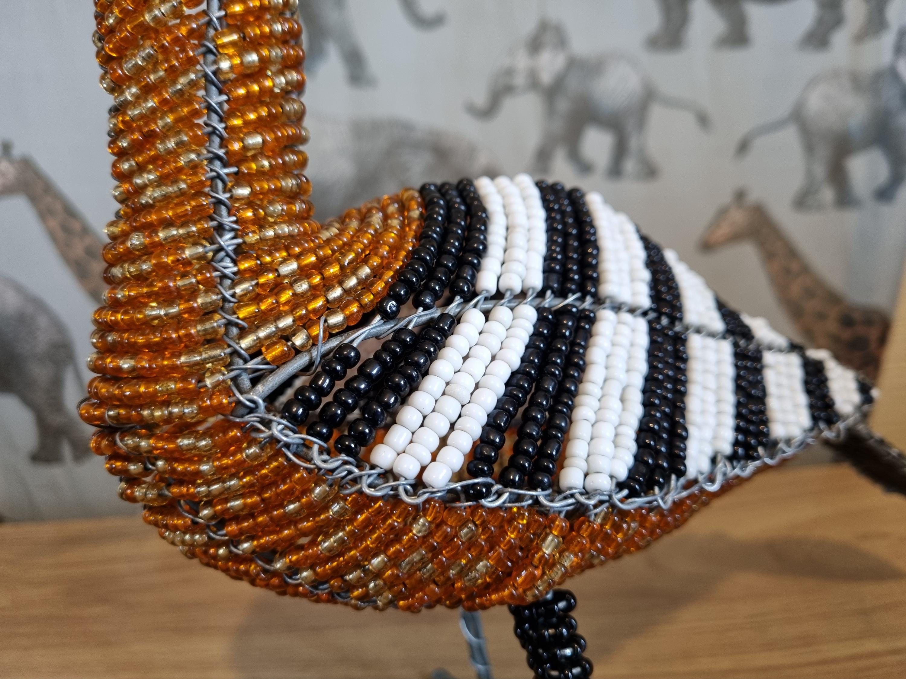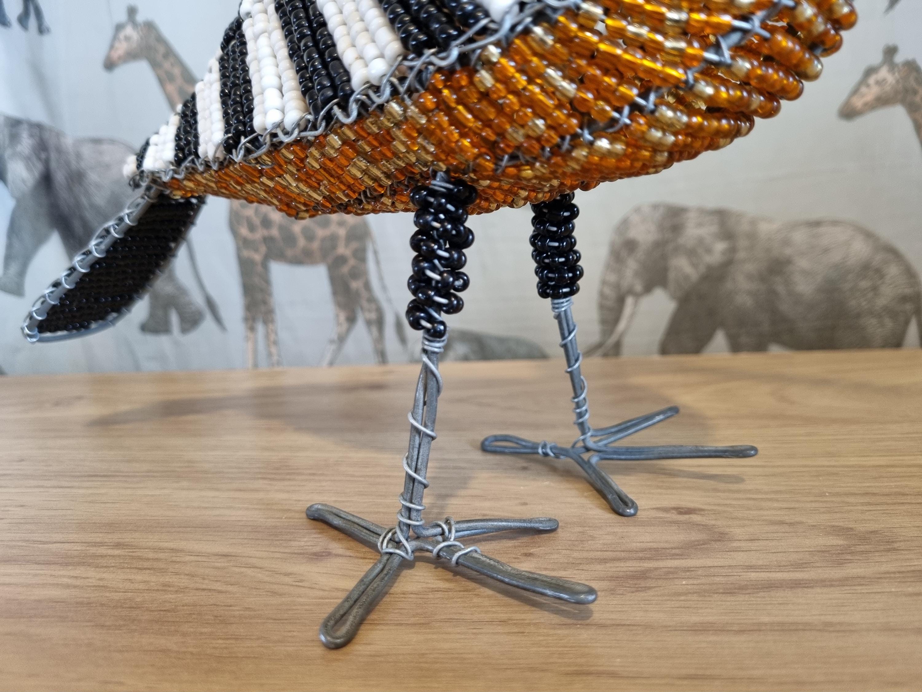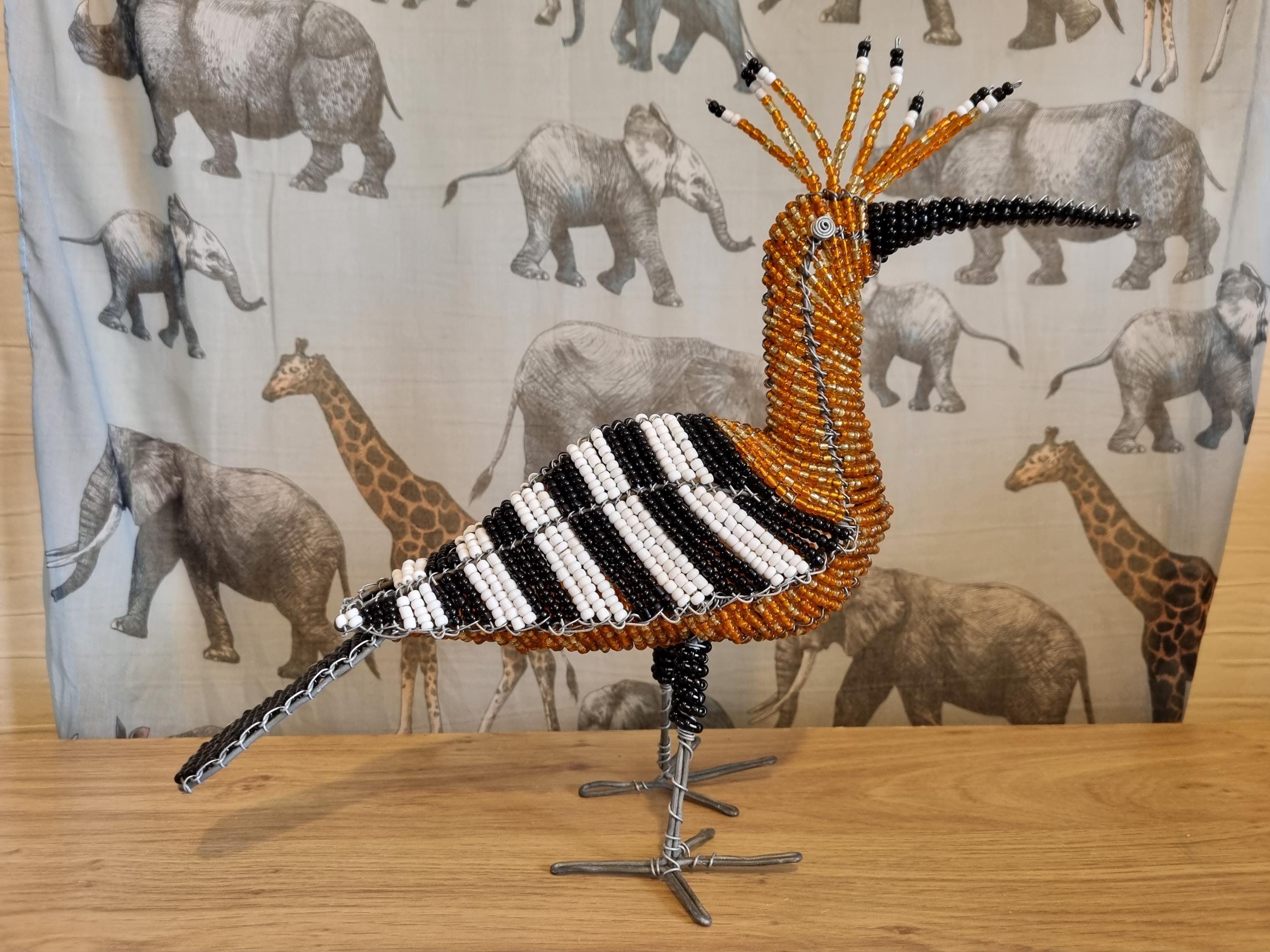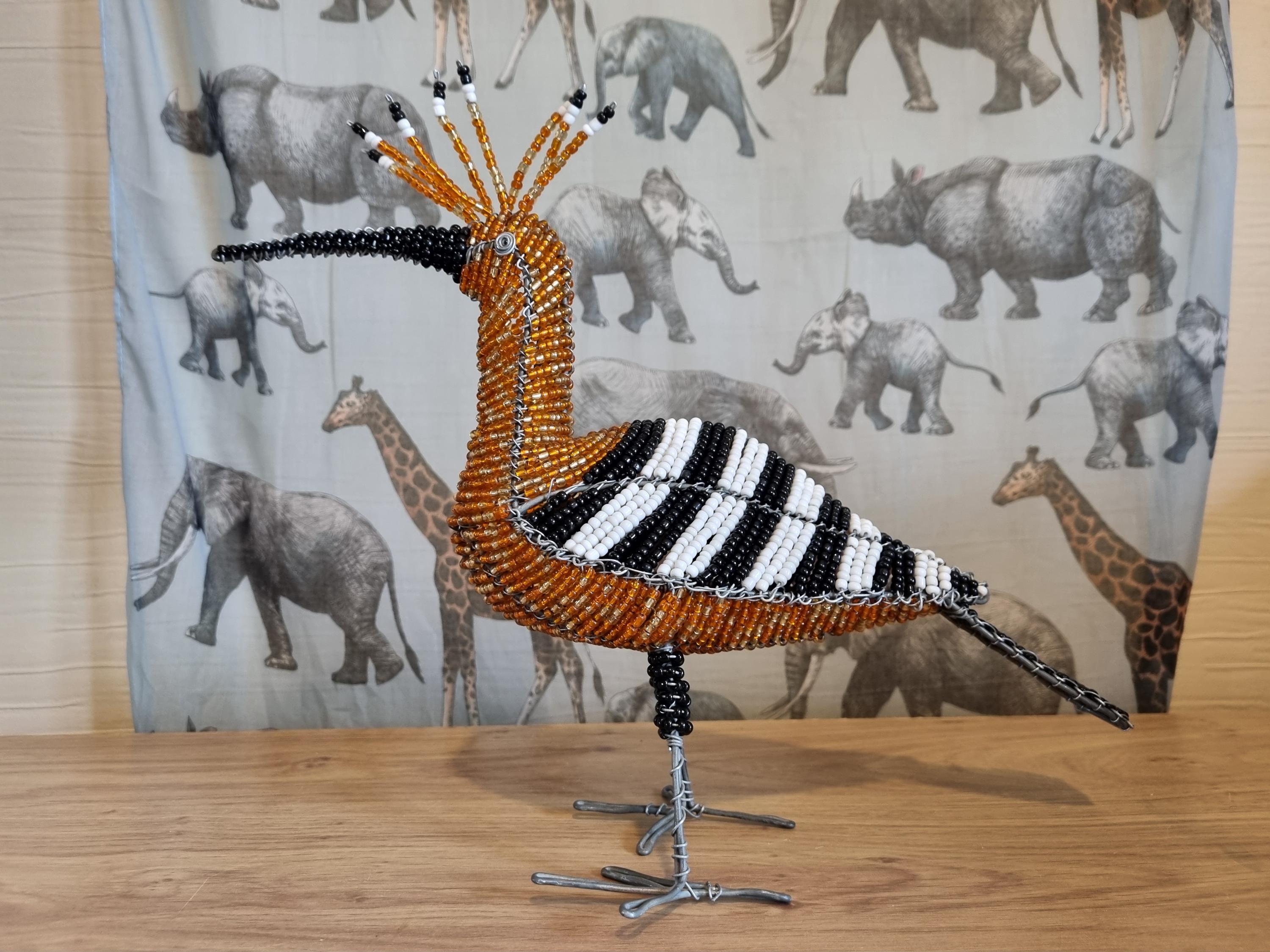 Add a splash of color and culture to your space with this striking handcrafted hoopoe bird sculpture. Featuring a distinctive crown of feathers and bold striped wings, it’s beautifully crafted from glass seed beads and wire — a tribute to African beadwork traditions.