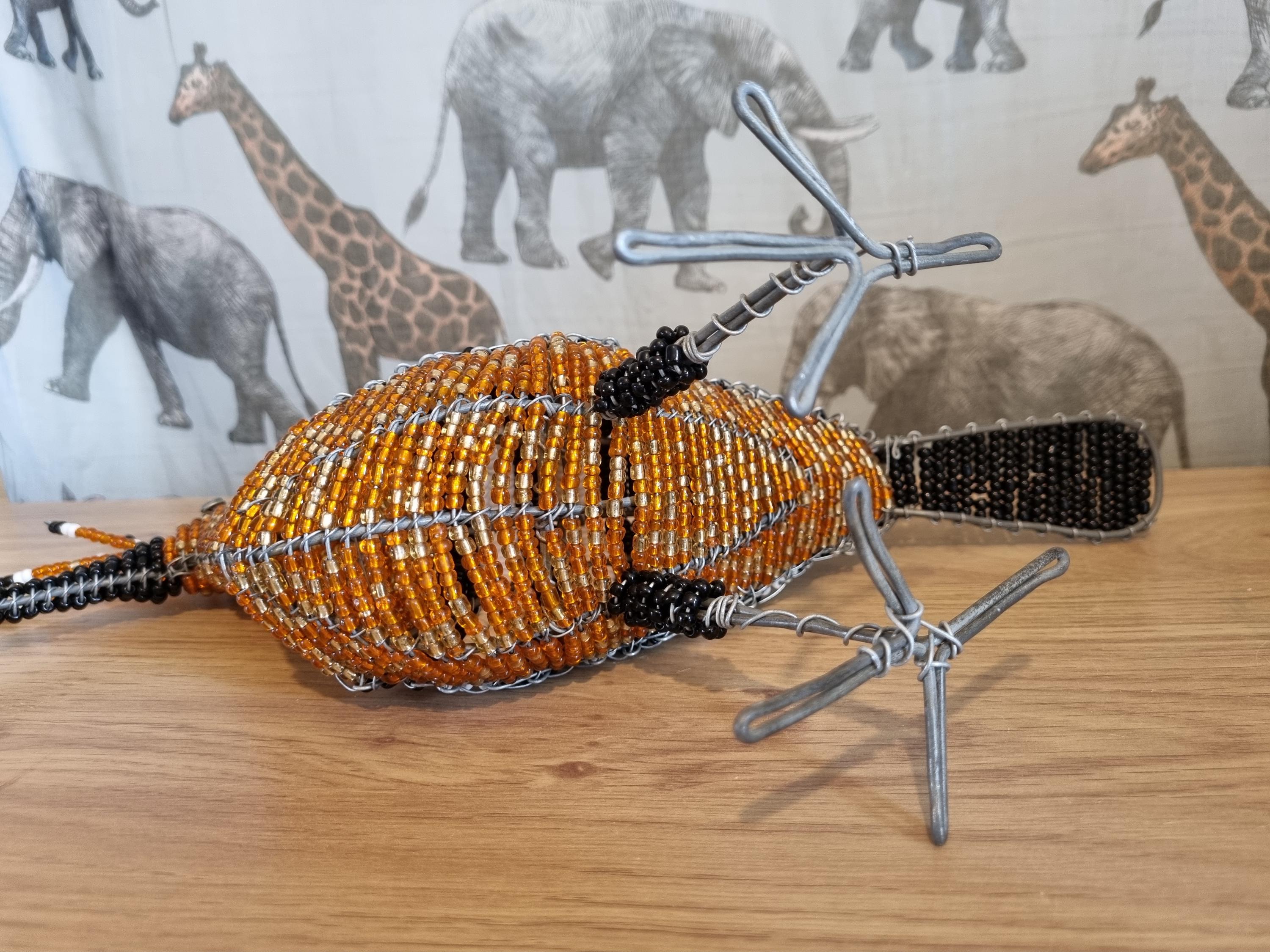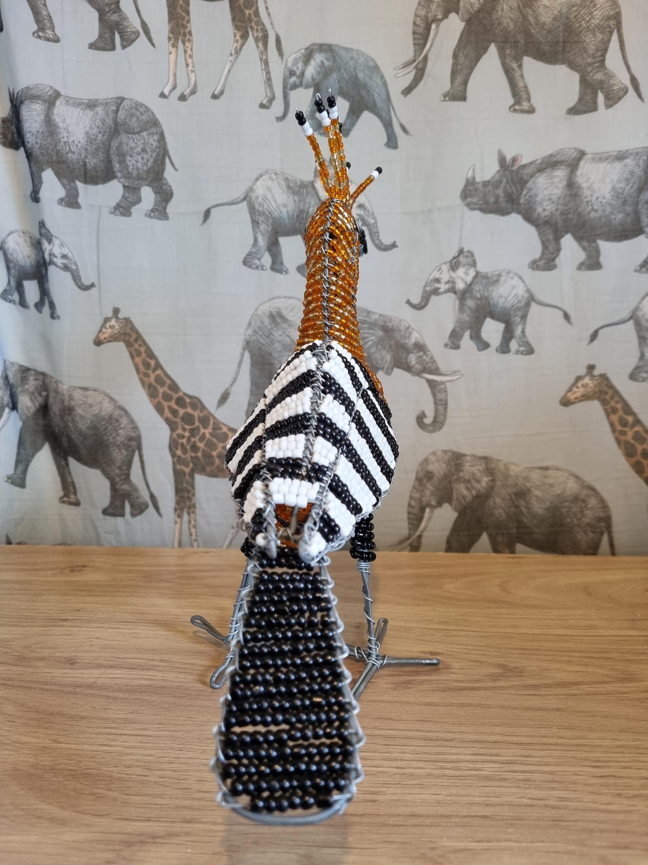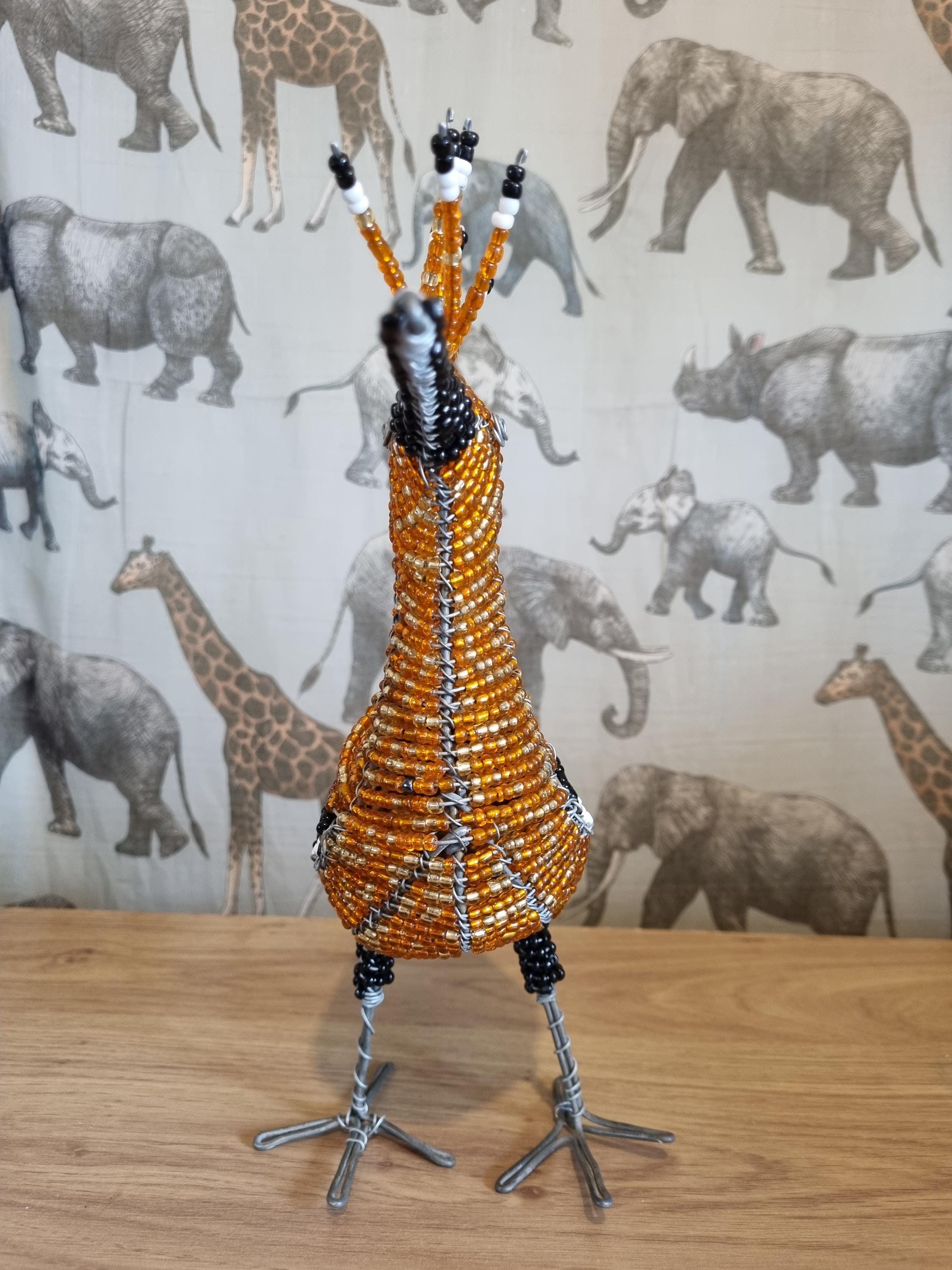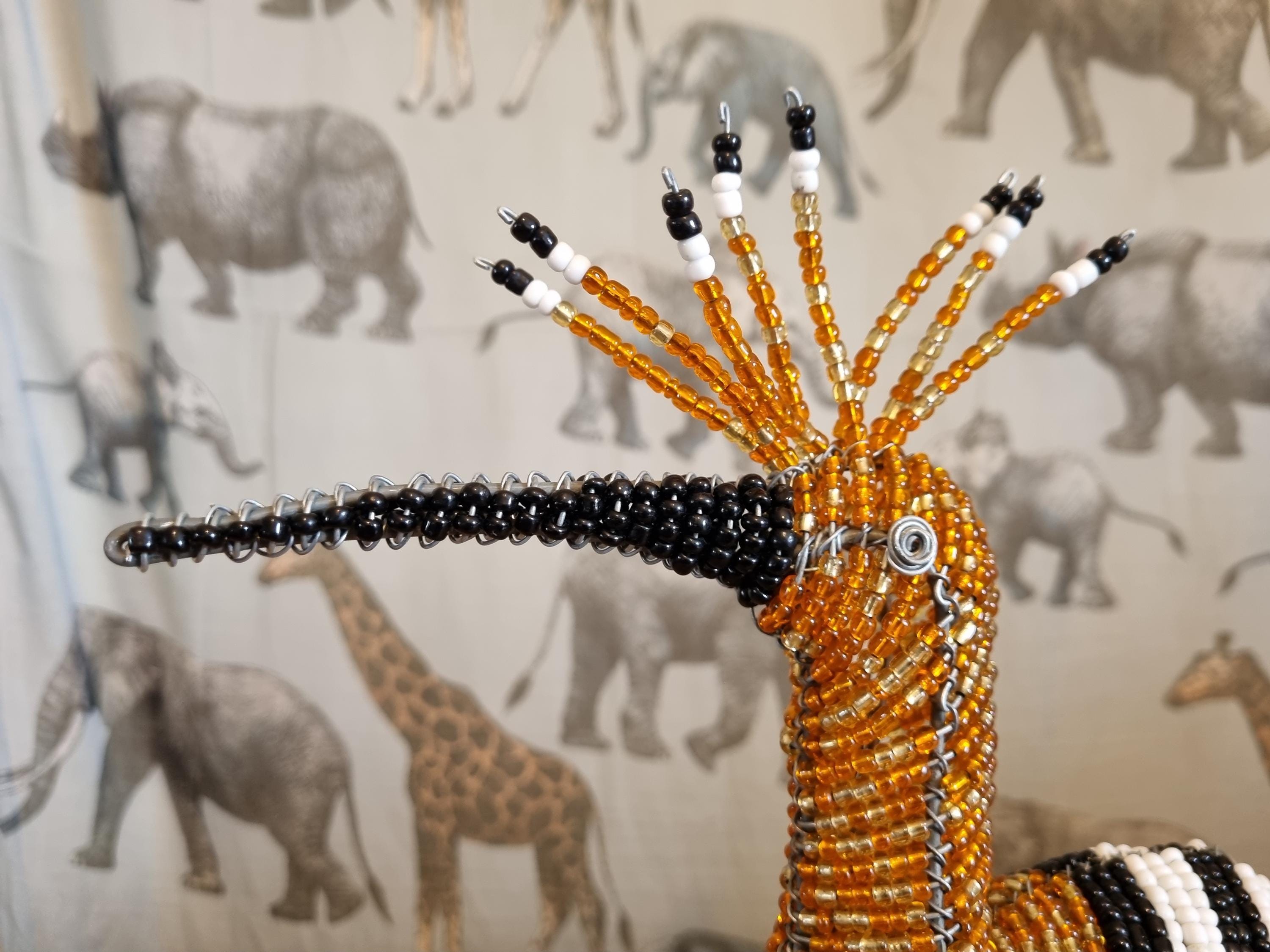 Add a splash of color and culture to your space with this striking handcrafted hoopoe bird sculpture. Featuring a distinctive crown of feathers and bold striped wings, it’s beautifully crafted from glass seed beads and wire — a tribute to African beadwork traditions.