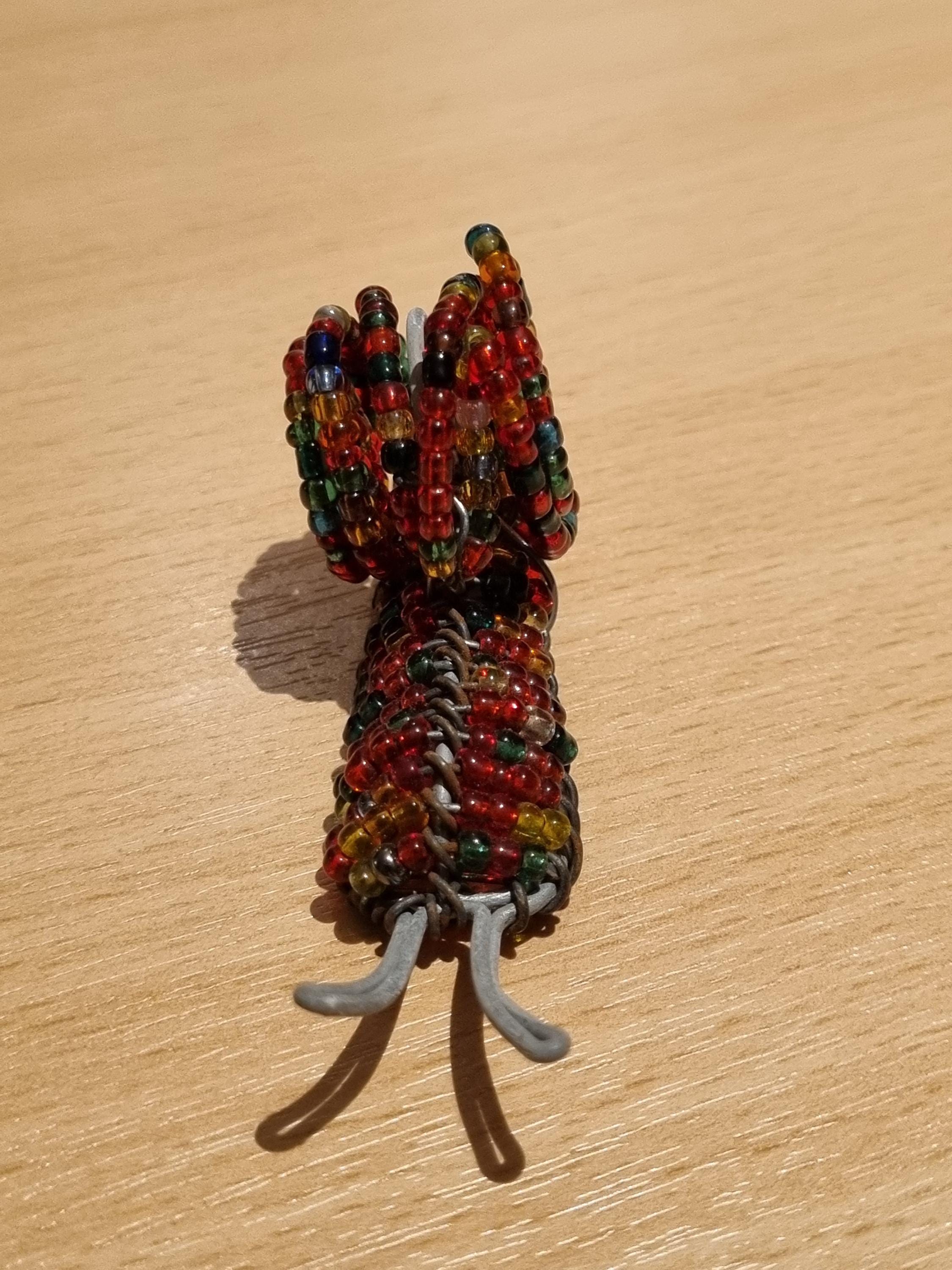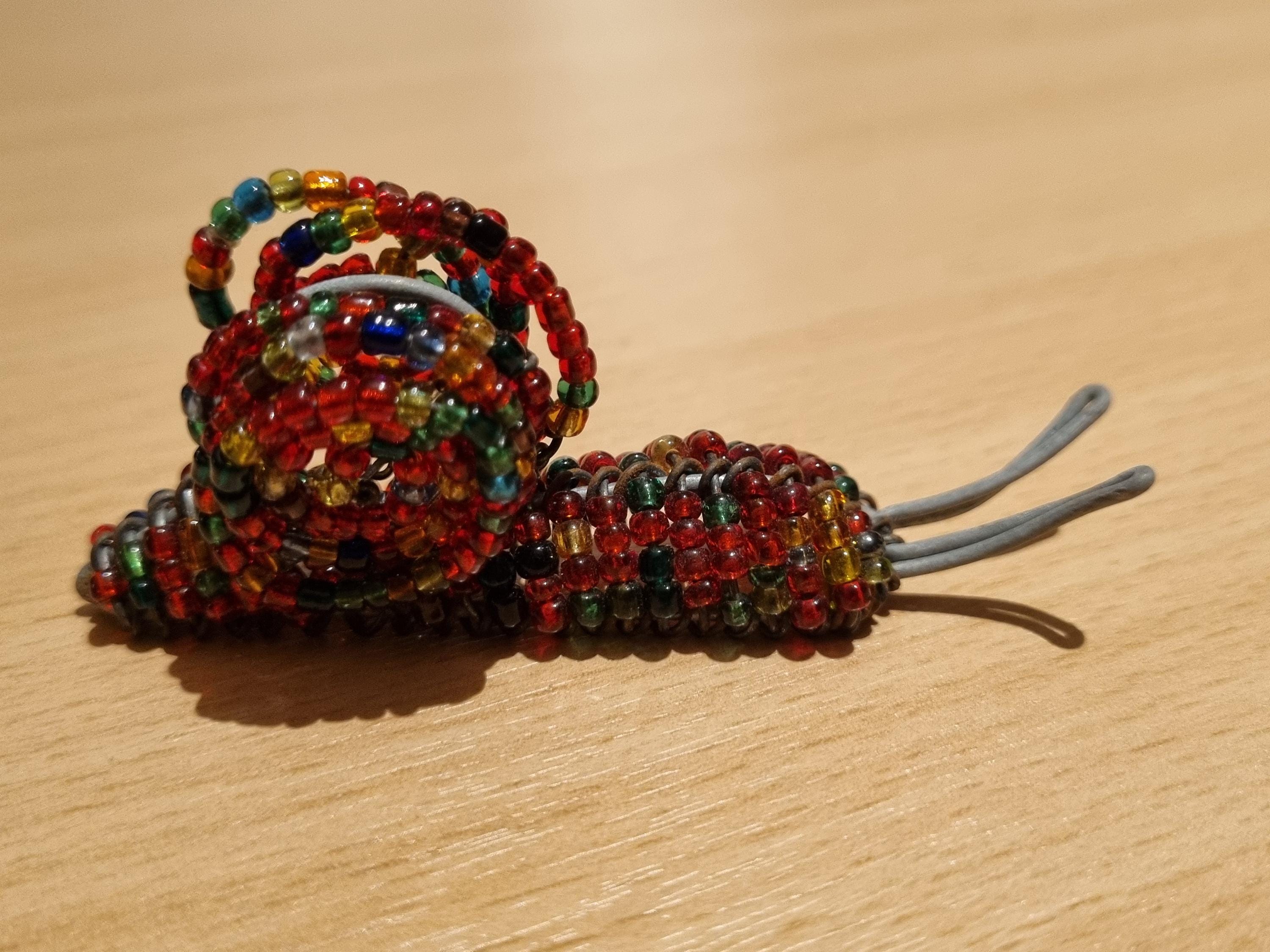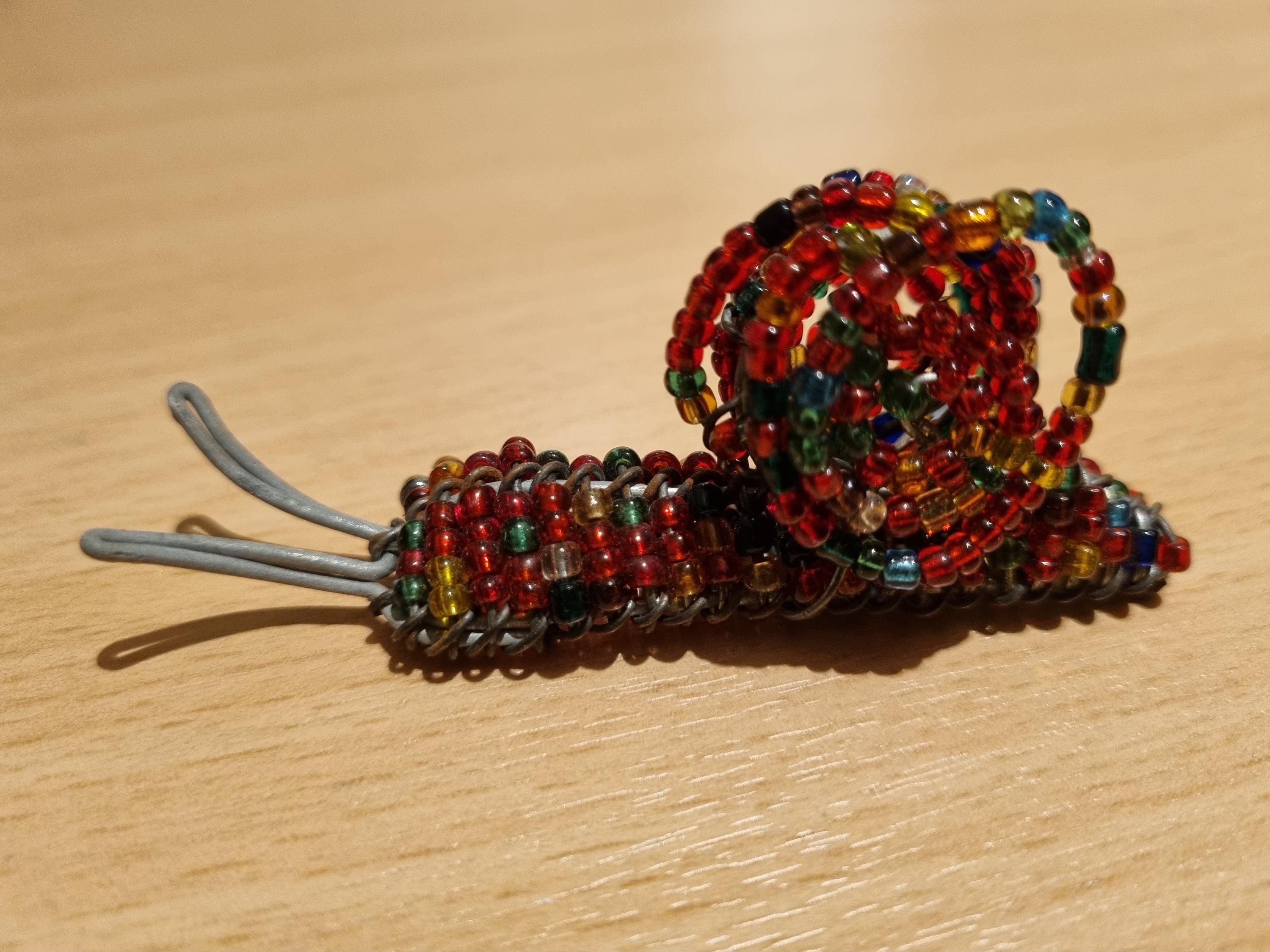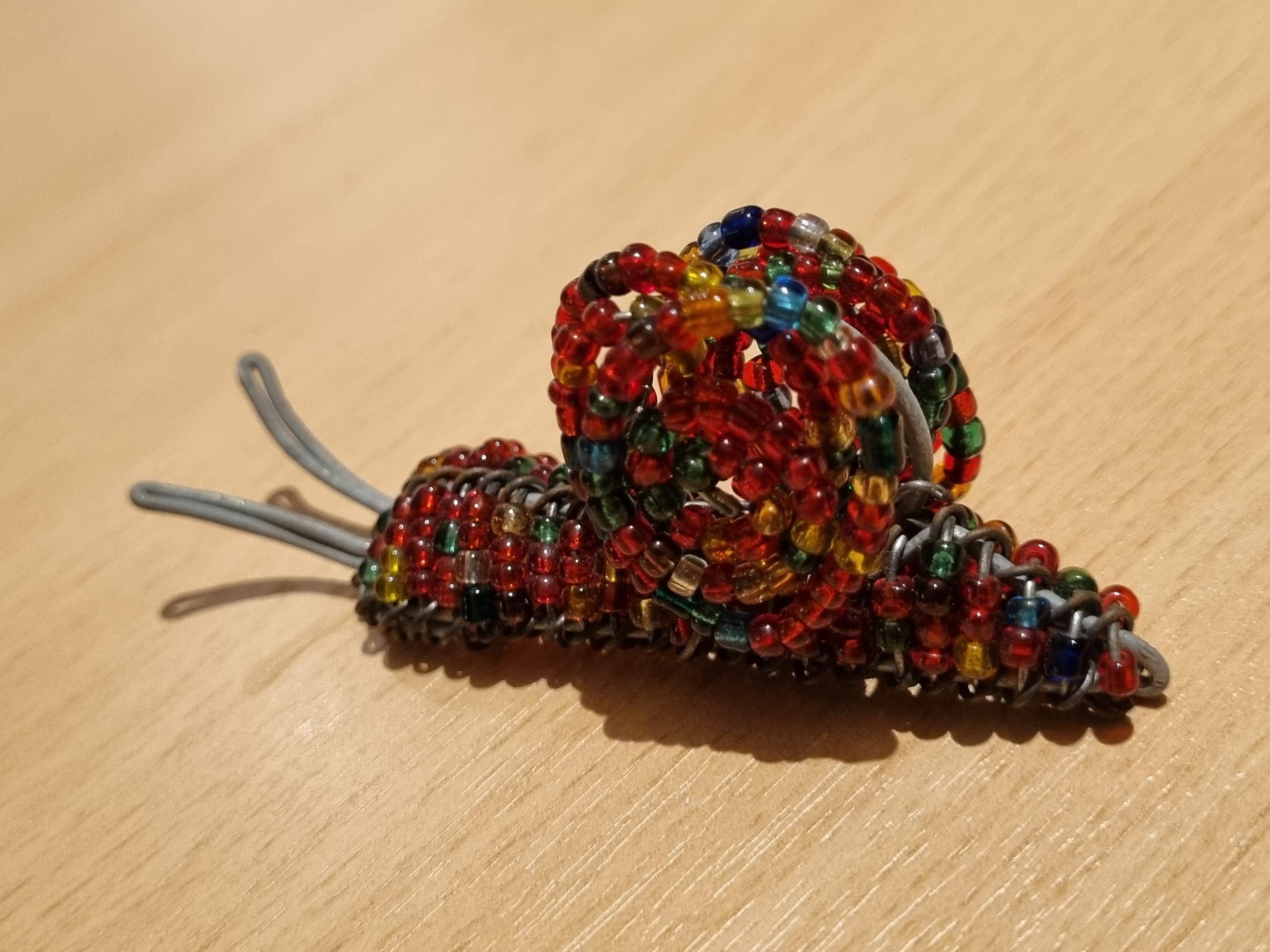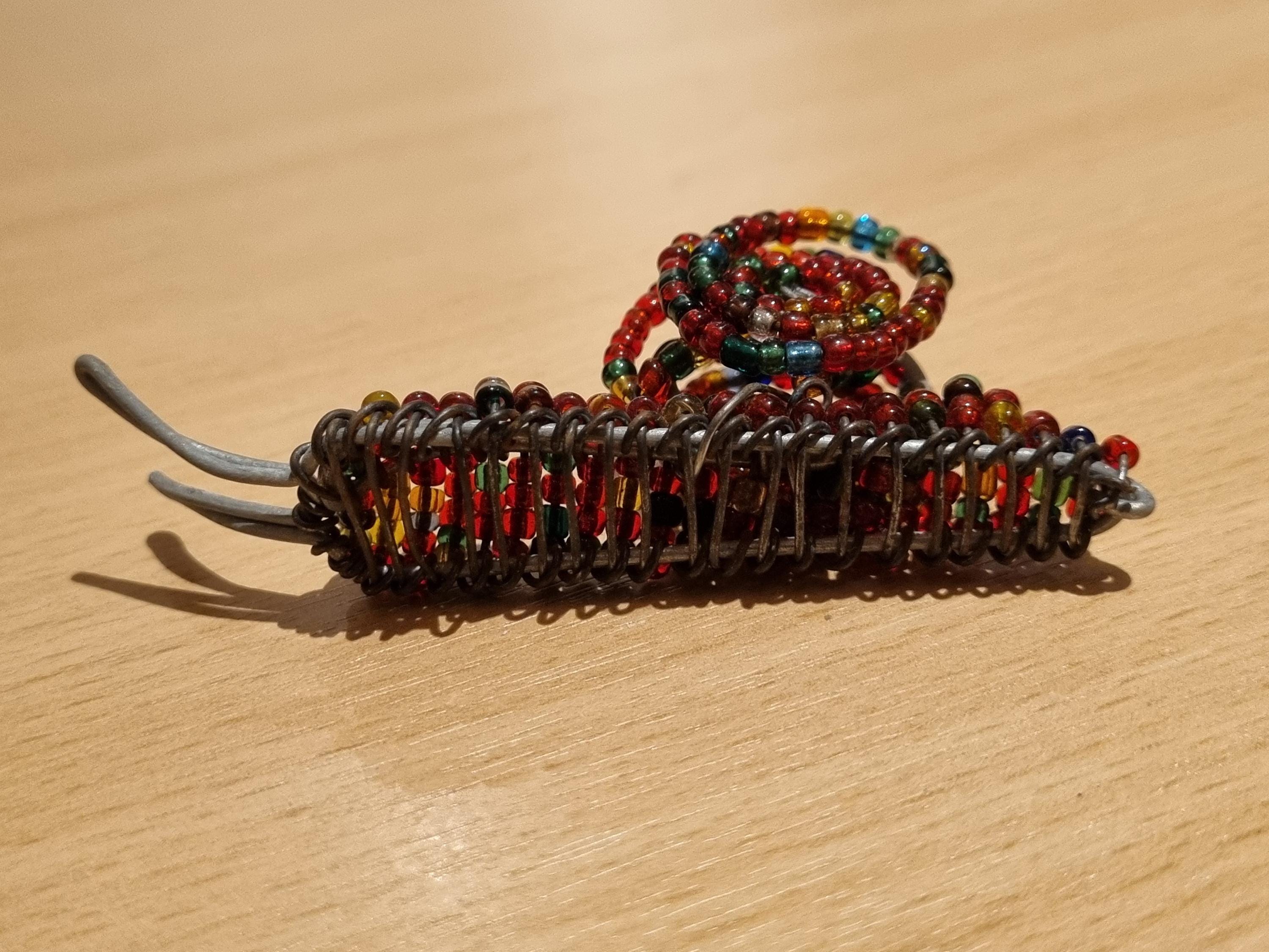 Bring charm and colour to your space with this handmade beaded snail, intricately crafted from bright, multicoloured glass beads woven around a strong metal wire frame. This miniature sculpture adds a playful touch to desks, bookshelves, or gift boxes β ideal for snail lovers, collectors, or fans of unique African-inspired crafts.