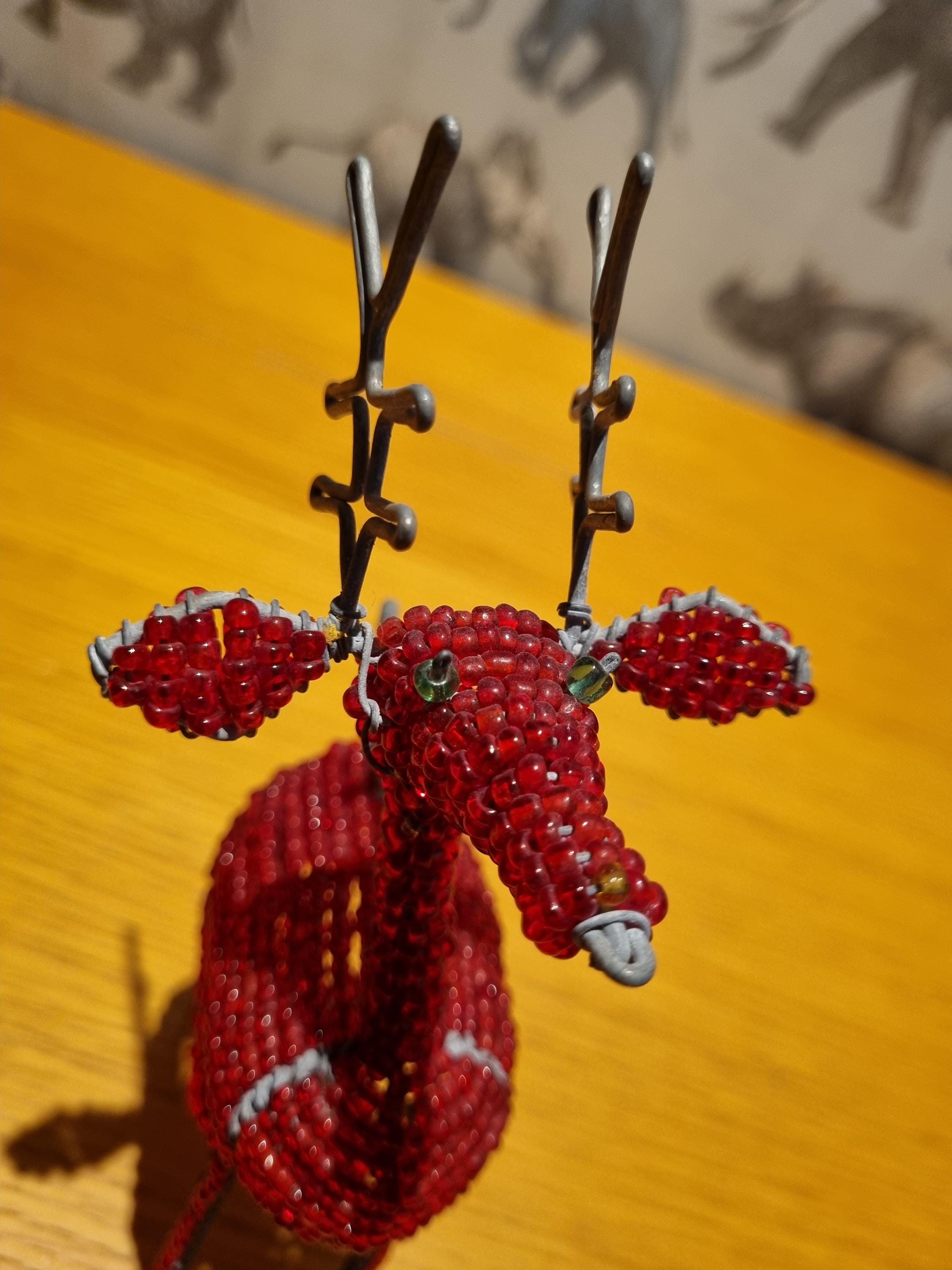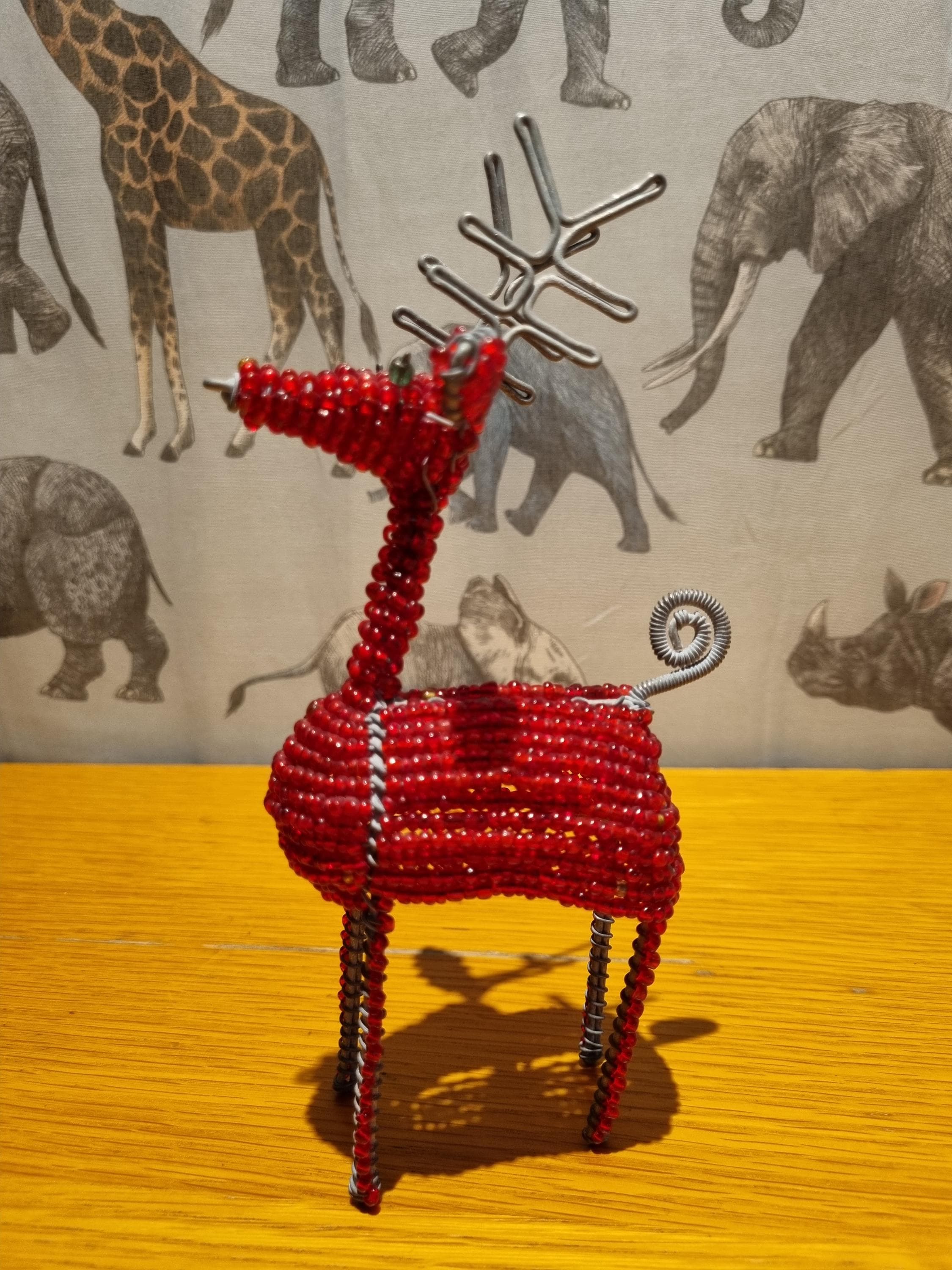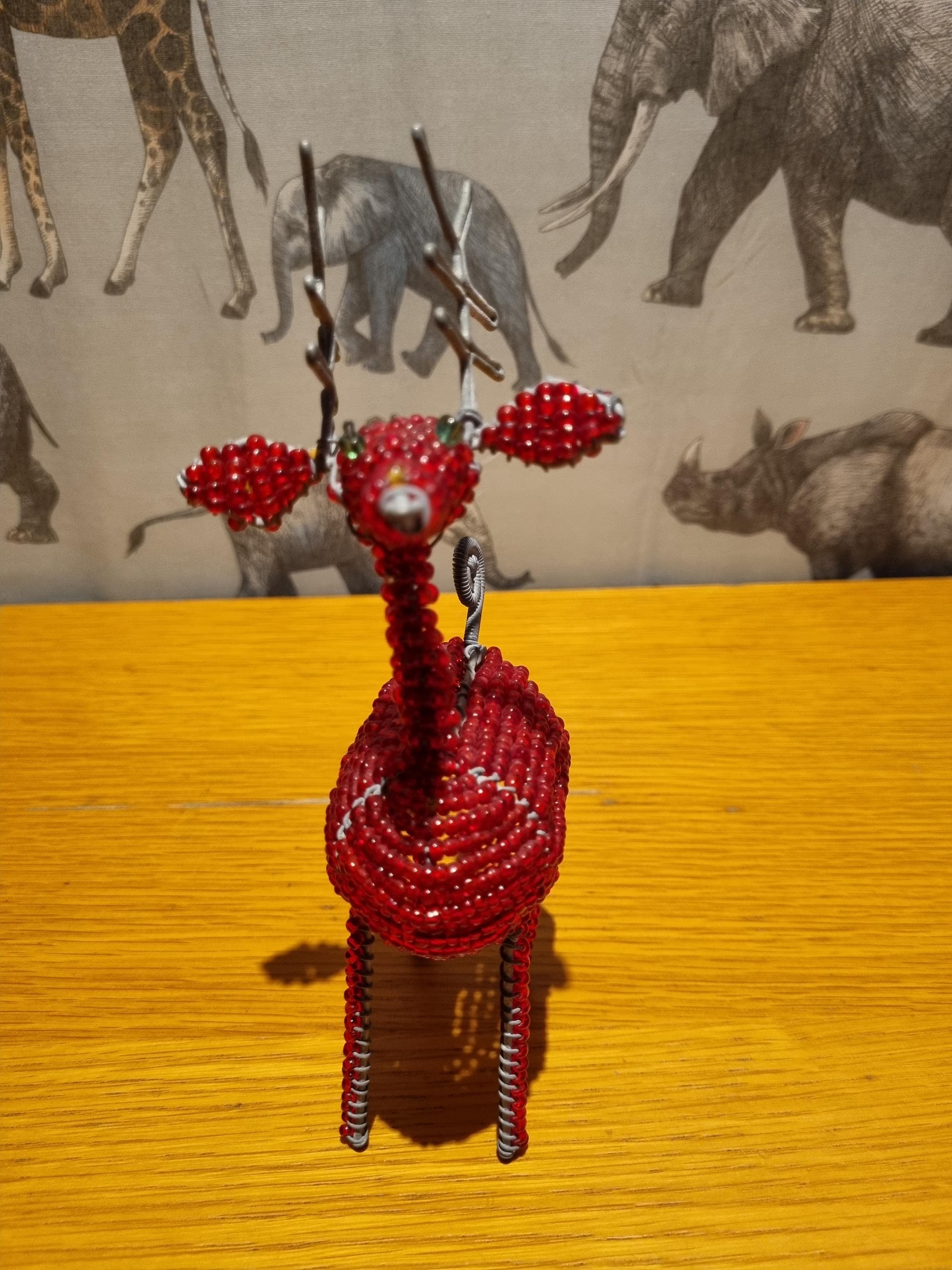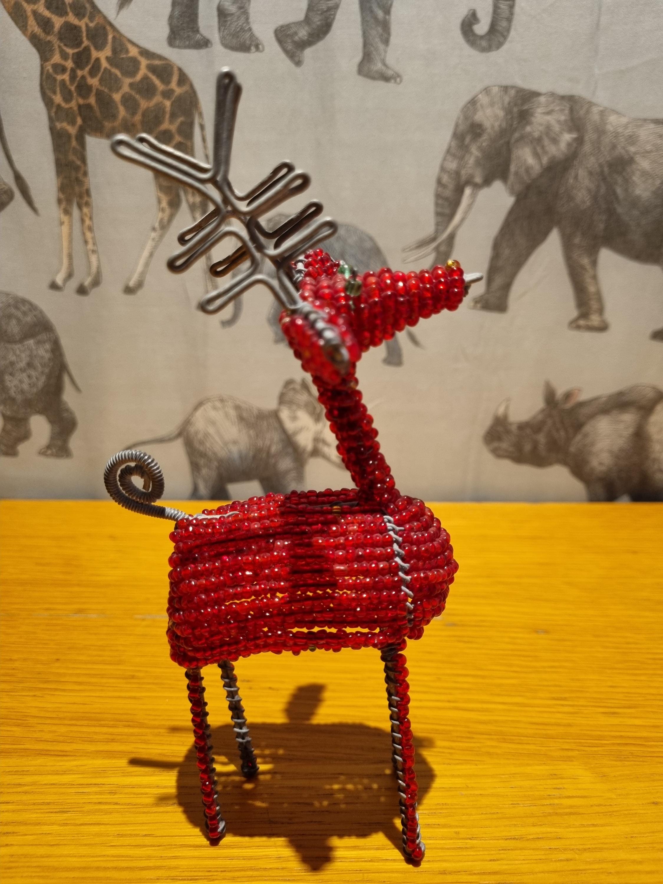 Add a touch of festive magic to your Christmas with this vibrant handmade beaded reindeer. Crafted by skilled artisans in South Africa using traditional wirework and rich red glass beads, each piece is a miniature celebration of creativity and craftsmanship.