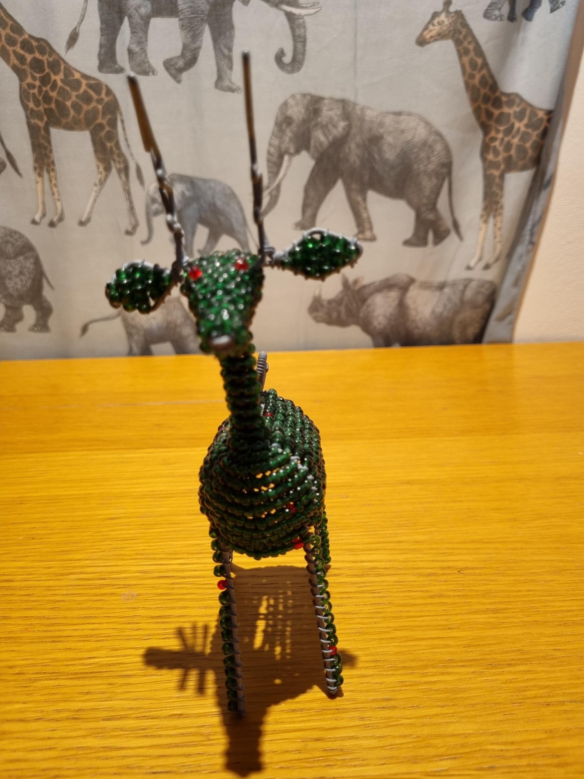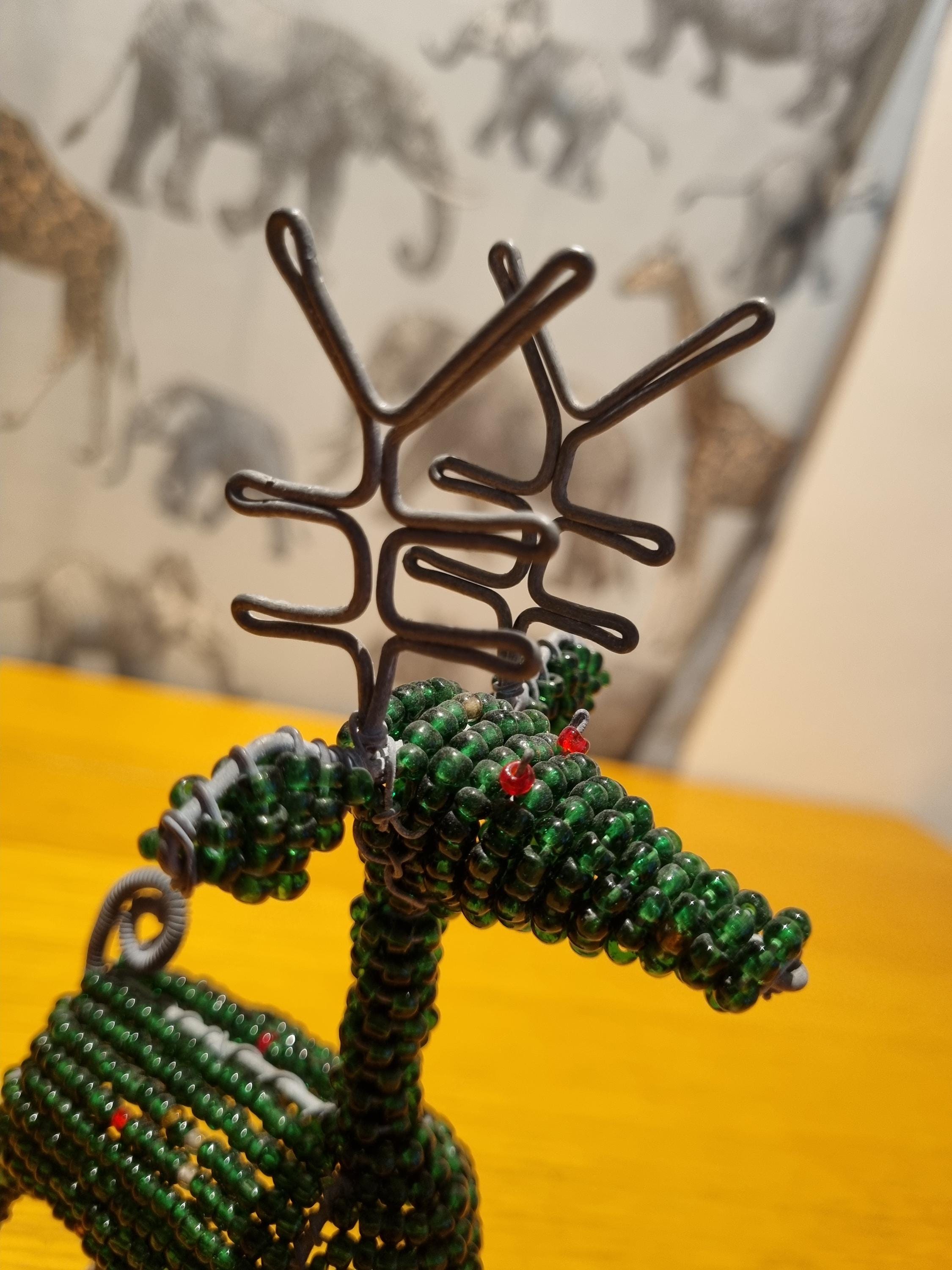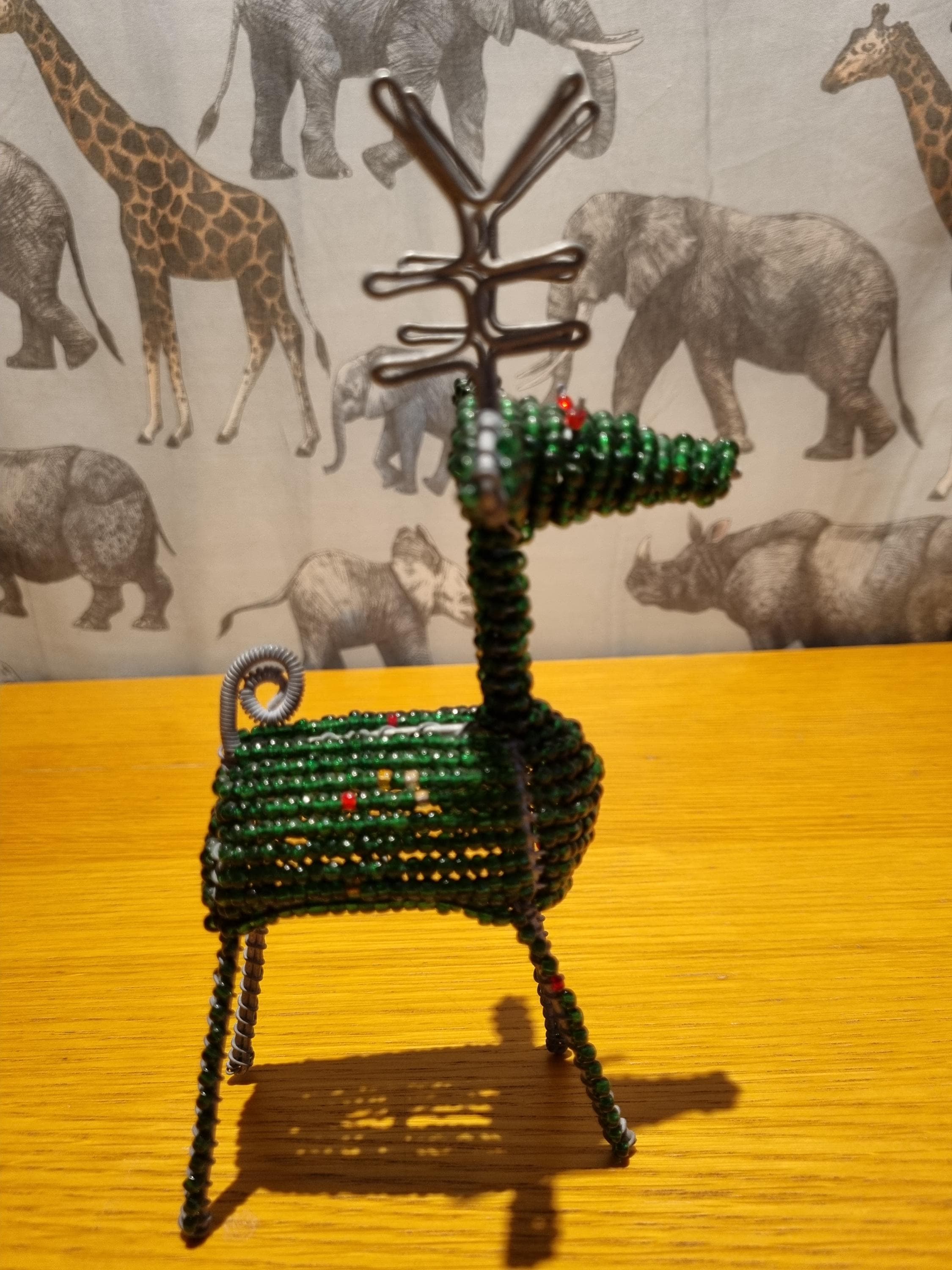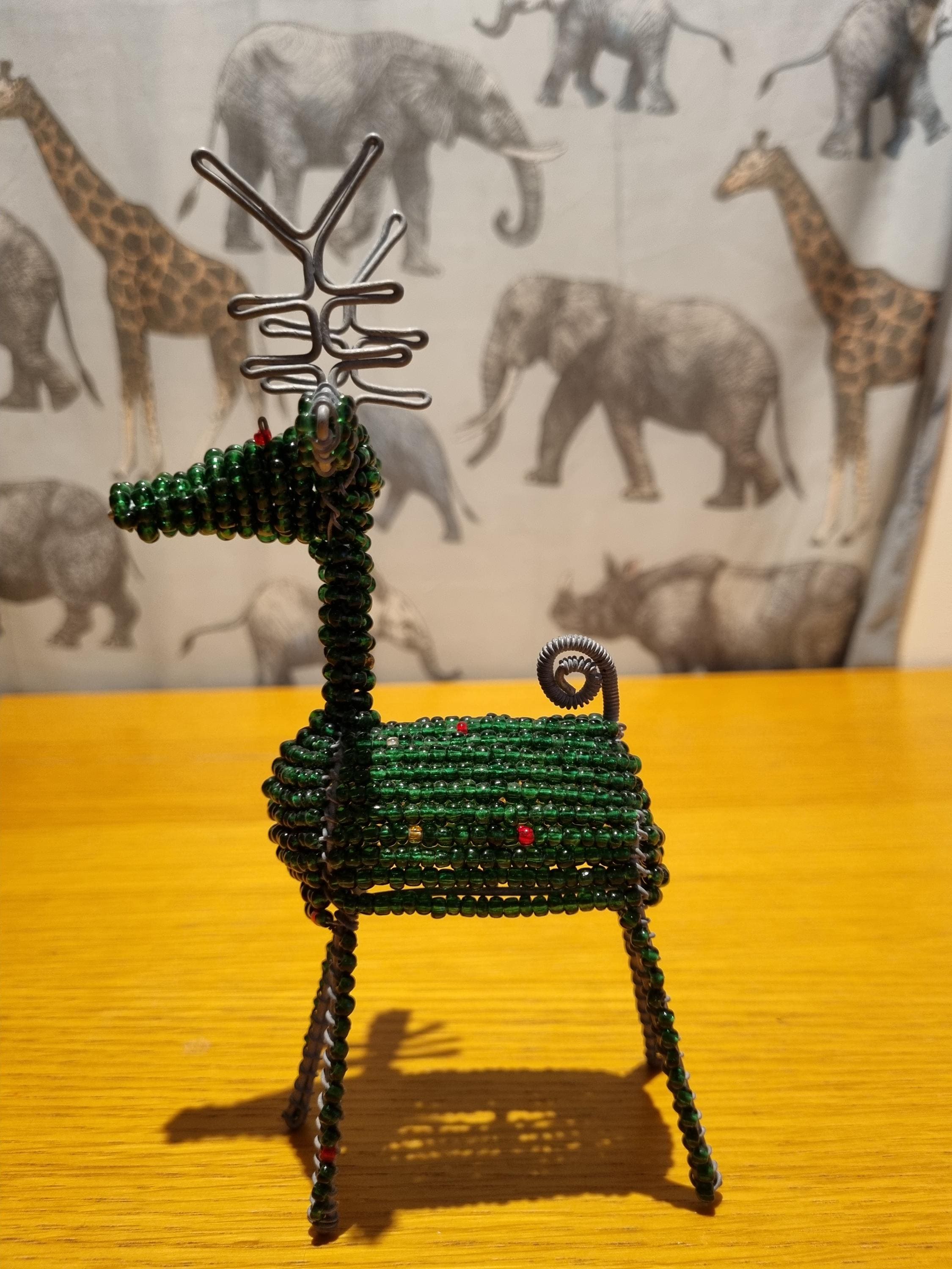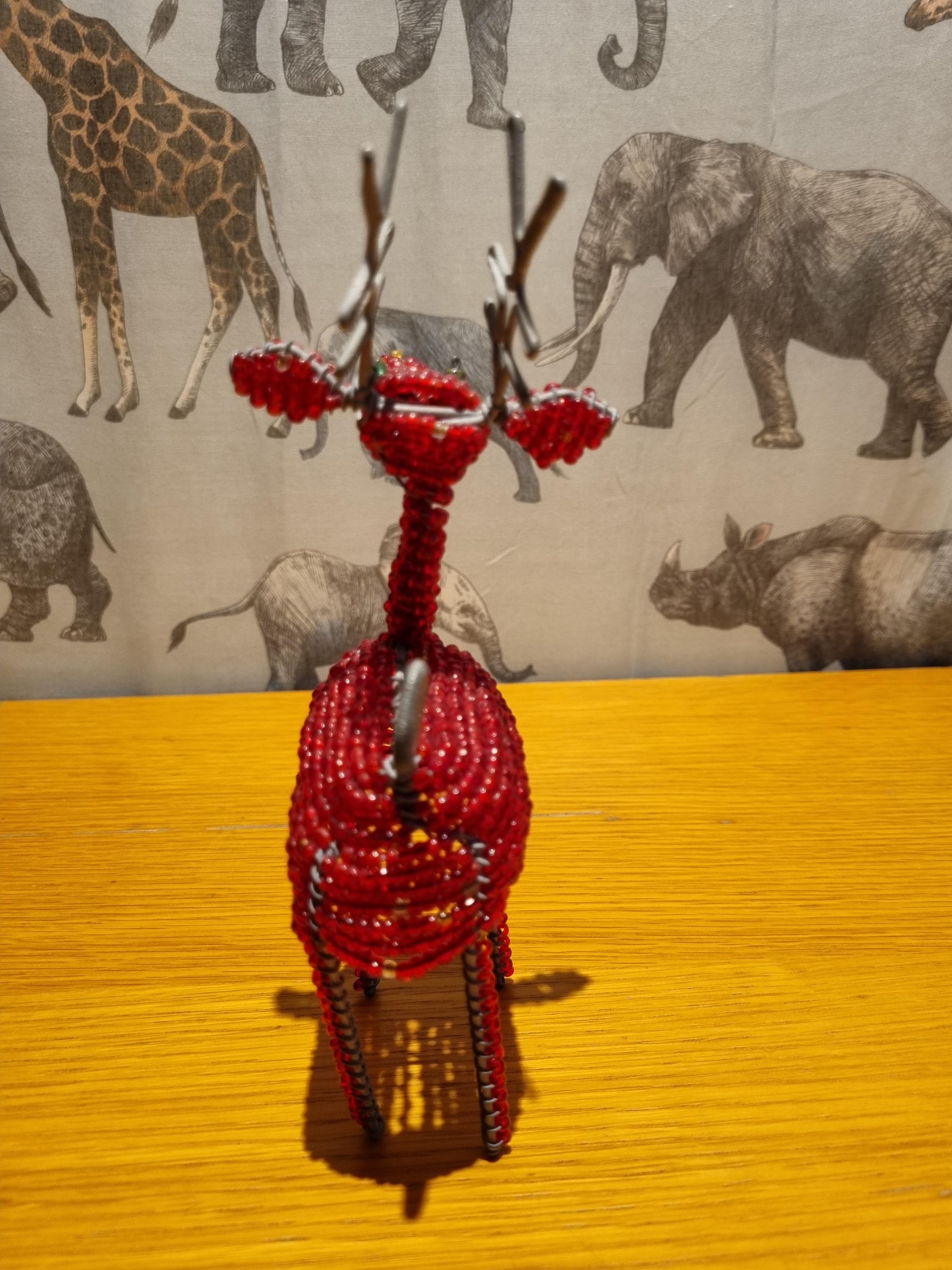 Add a touch of festive magic to your Christmas with this vibrant handmade beaded reindeer. Crafted by skilled artisans in South Africa using traditional wirework and rich red glass beads, each piece is a miniature celebration of creativity and craftsmanship.
