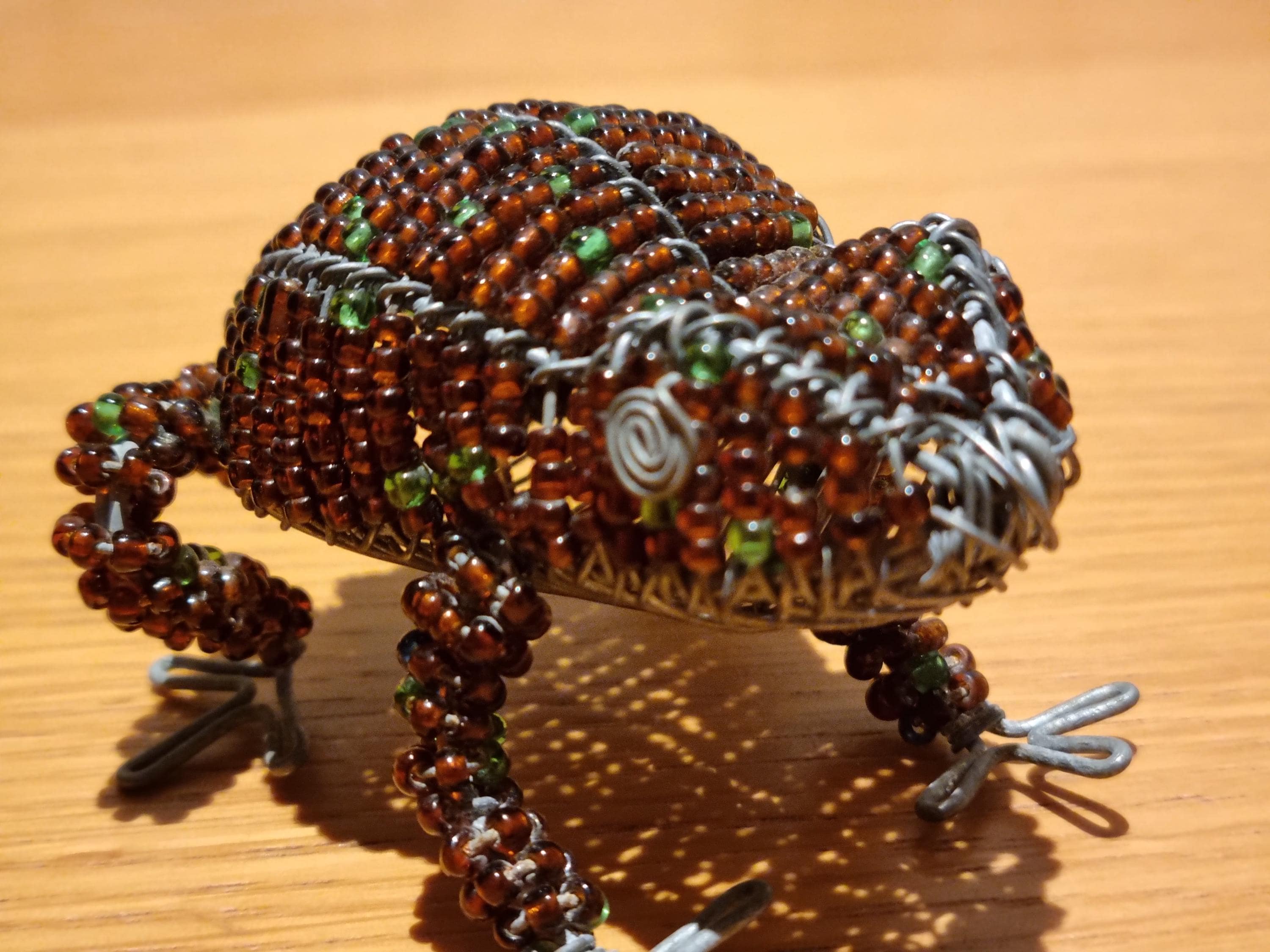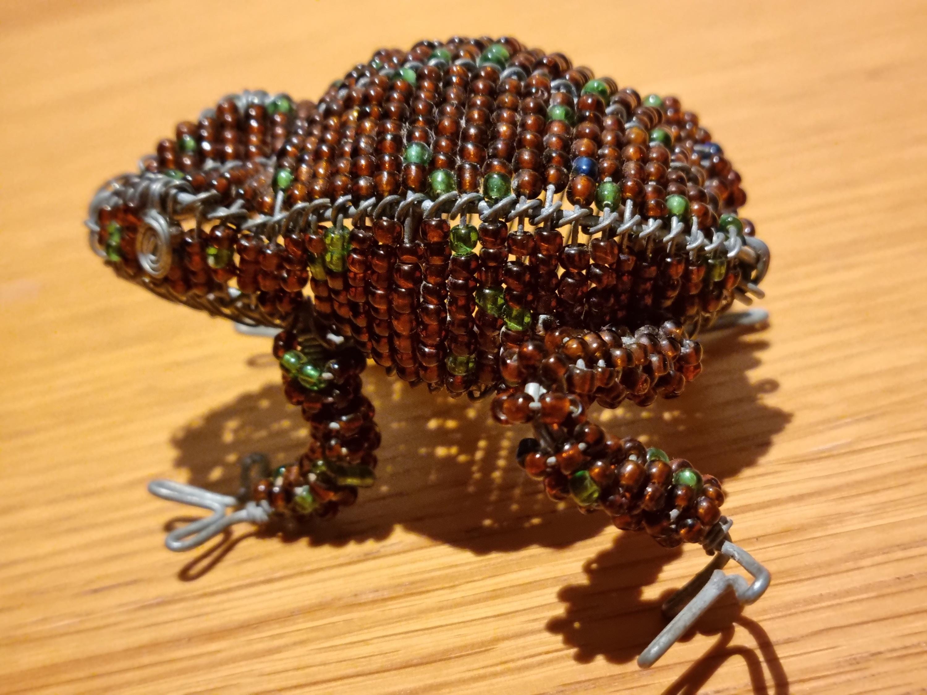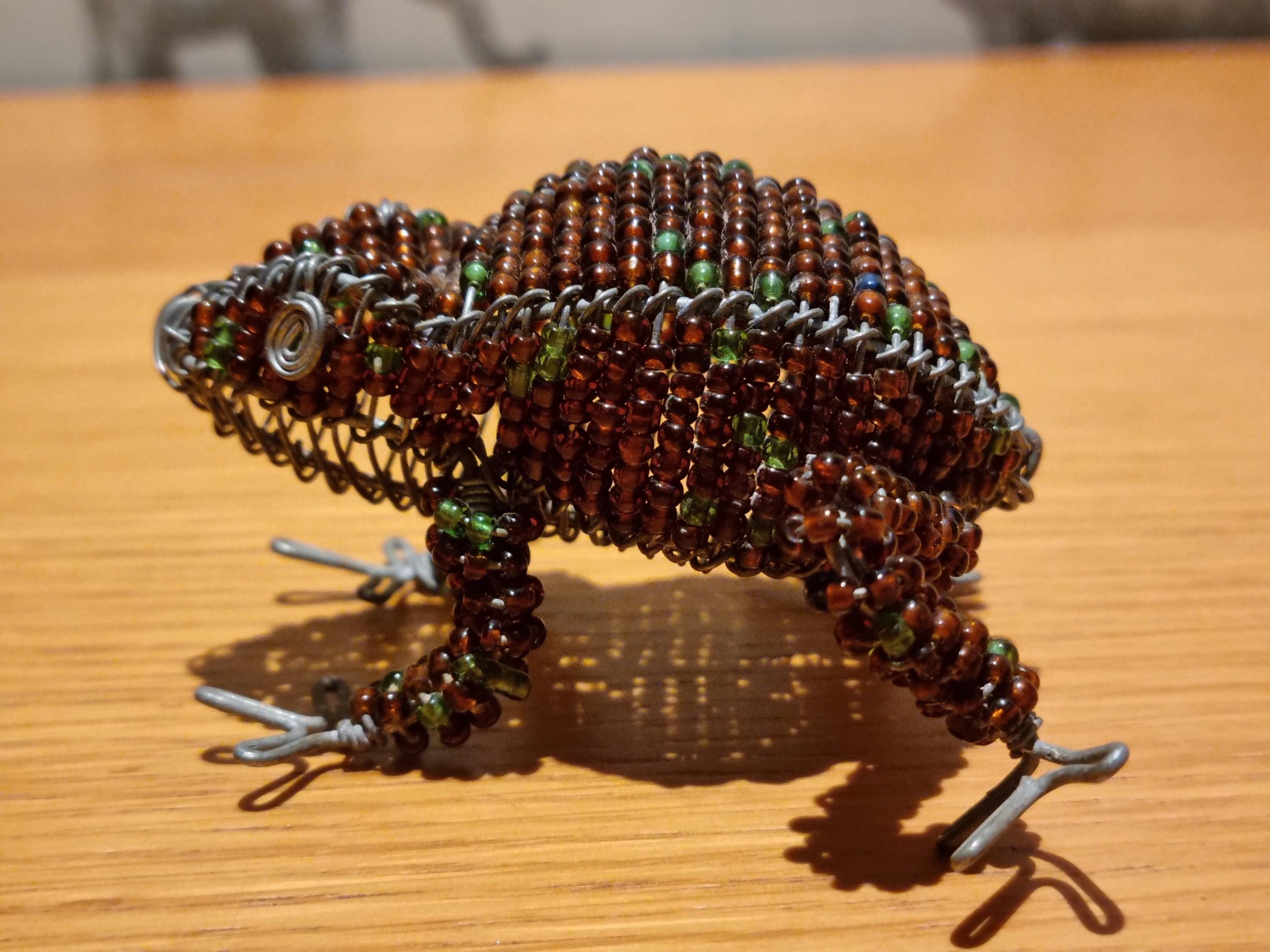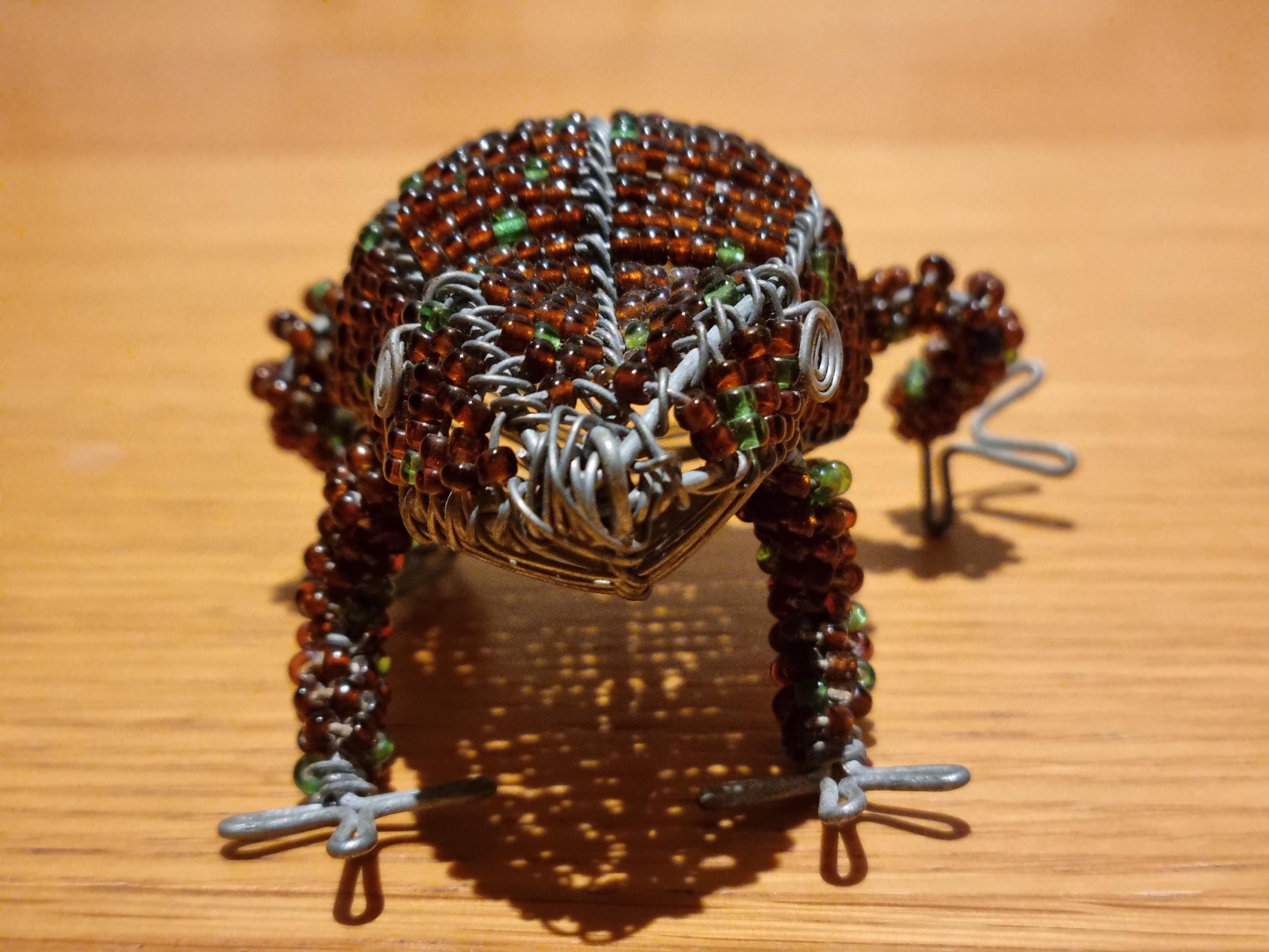 Lovingly handwoven by skilled artisans, this frog is formed from strong galvanized wire and adorned with hundreds of rich brown and green glass beads to create a lifelike amphibian that’s full of character and texture. Its realistic squat posture and spiral eyes capture the quirky essence of a frog, making it an ideal piece for nature lovers, frog collectors, or those seeking a unique conversation starter.