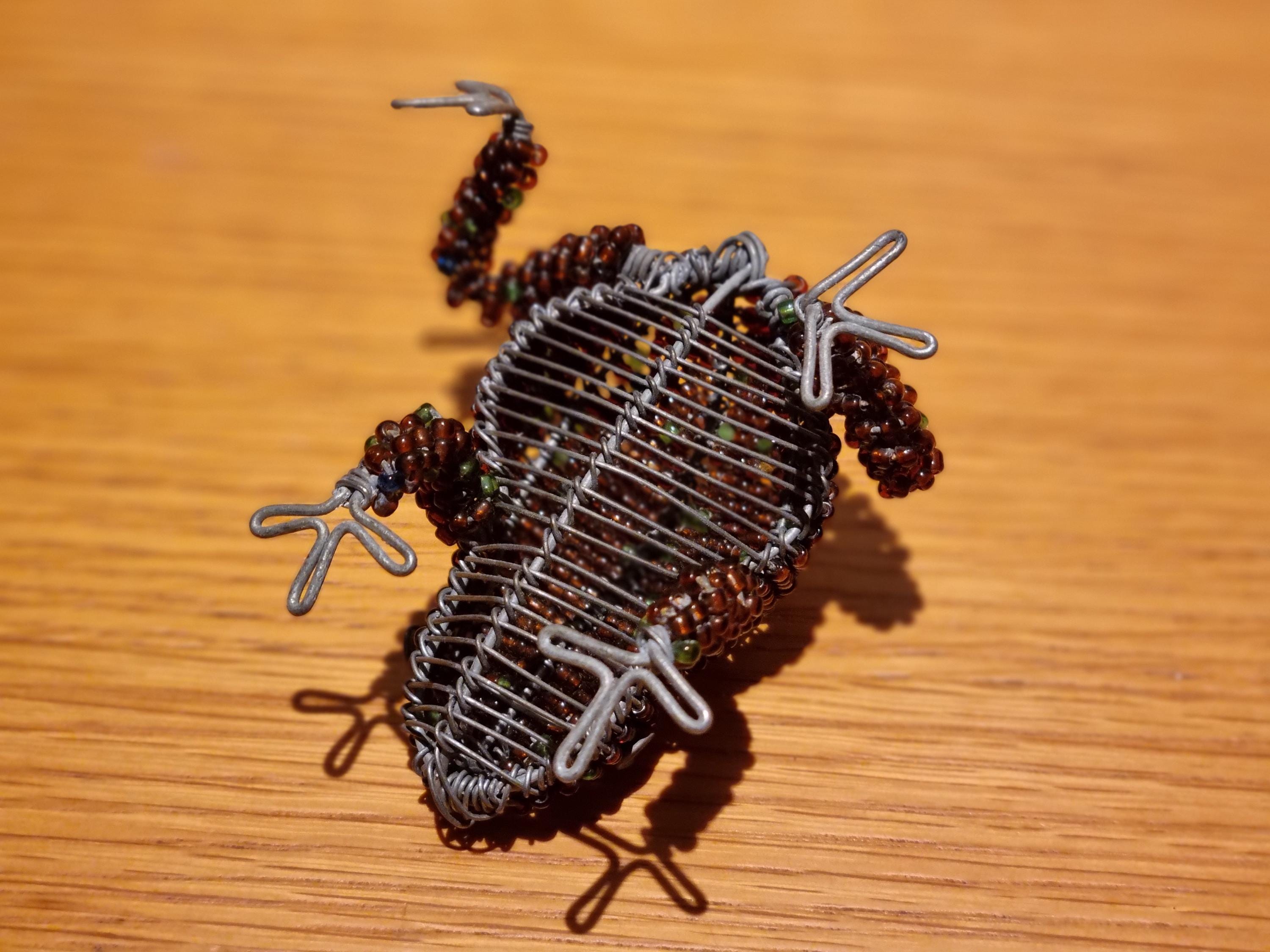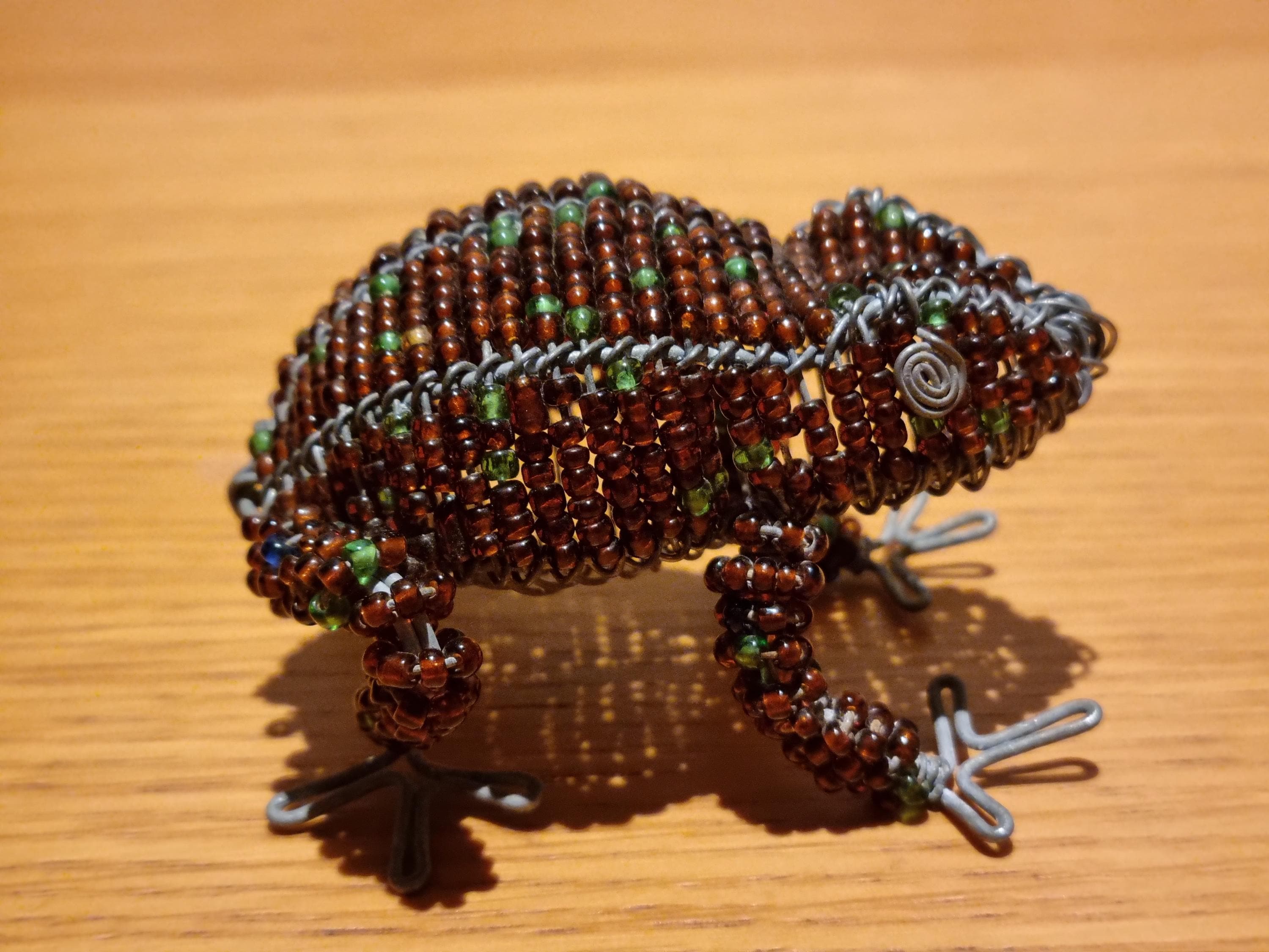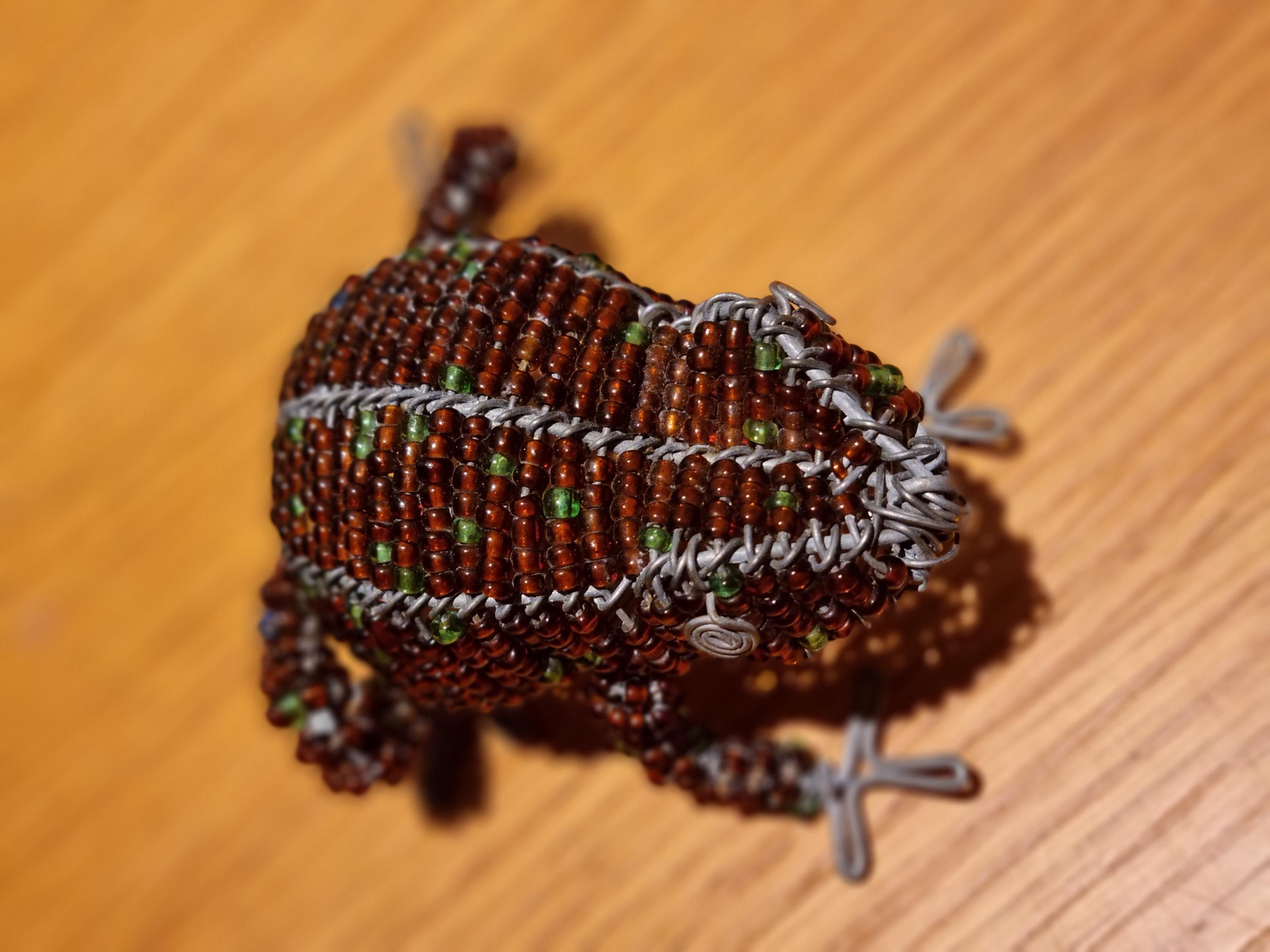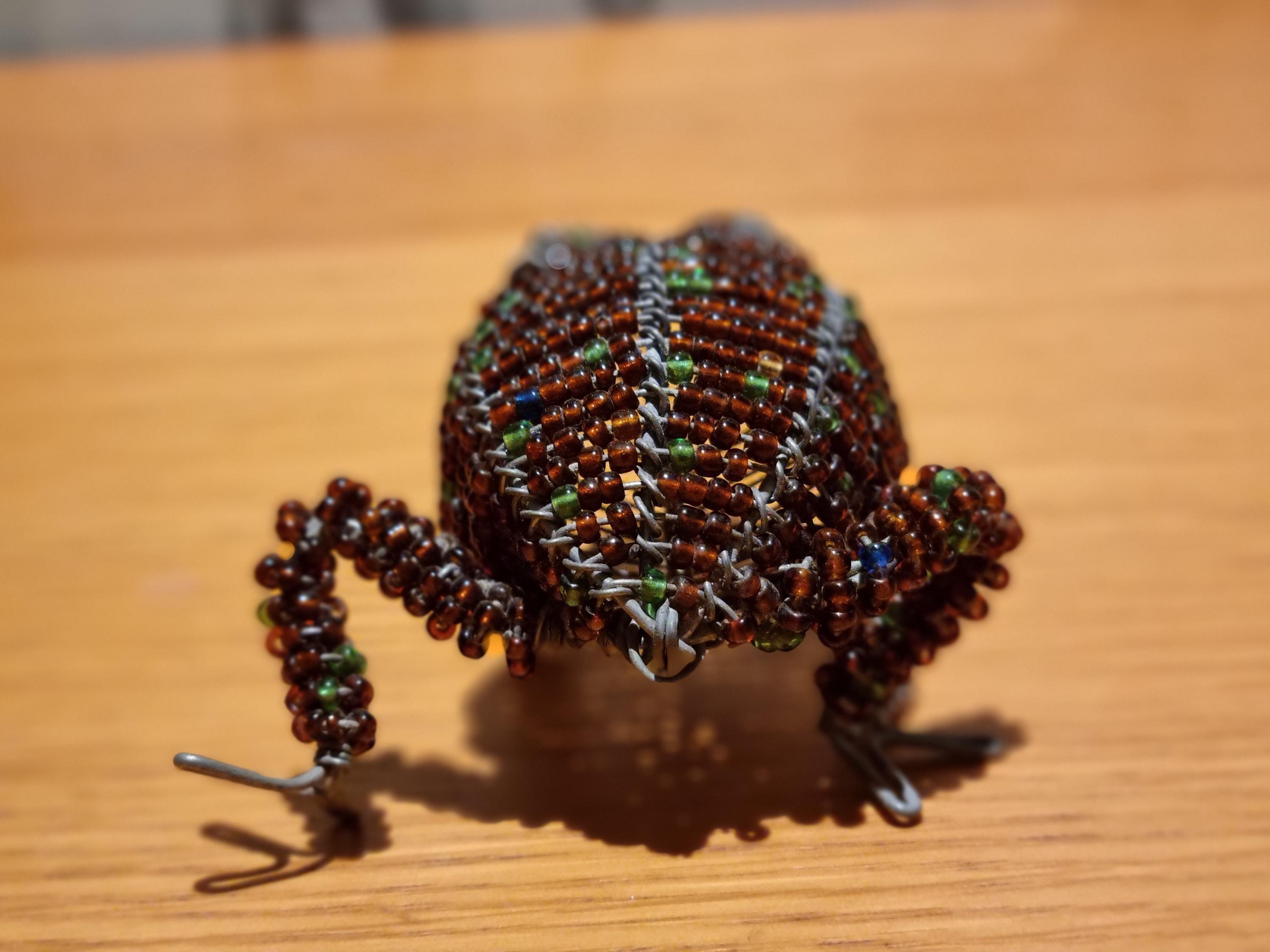 Lovingly handwoven by skilled artisans, this frog is formed from strong galvanized wire and adorned with hundreds of rich brown and green glass beads to create a lifelike amphibian that’s full of character and texture. Its realistic squat posture and spiral eyes capture the quirky essence of a frog, making it an ideal piece for nature lovers, frog collectors, or those seeking a unique conversation starter.