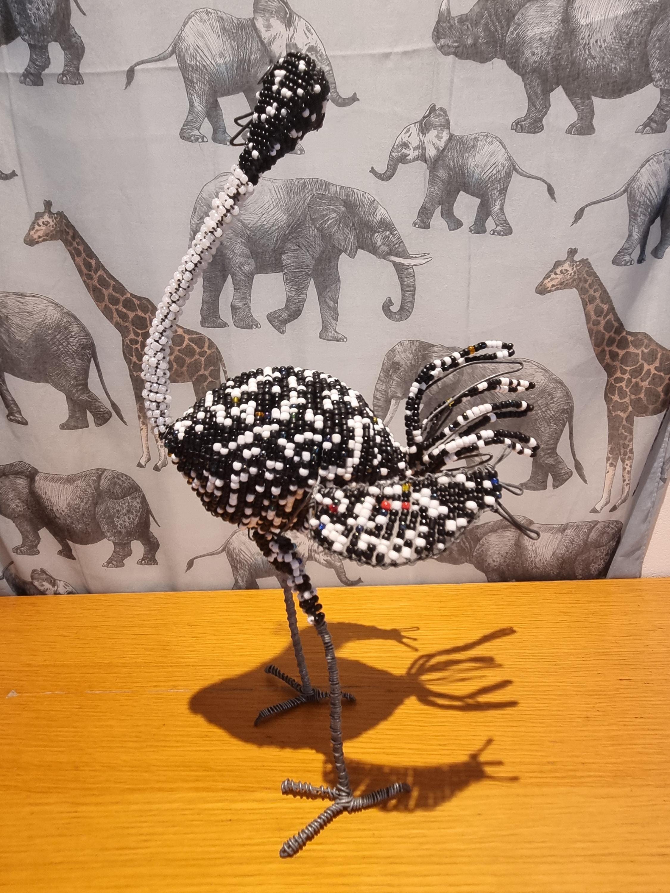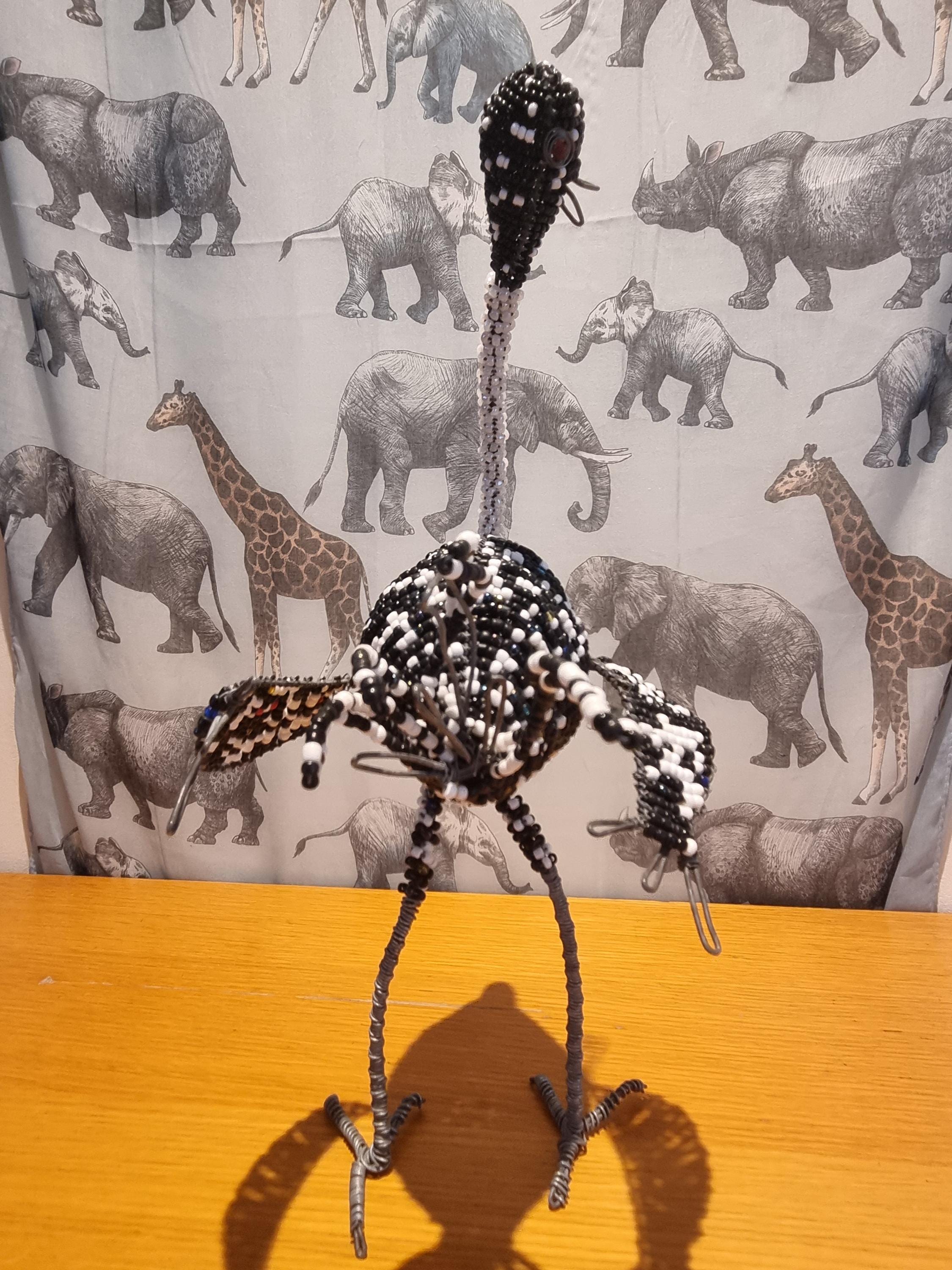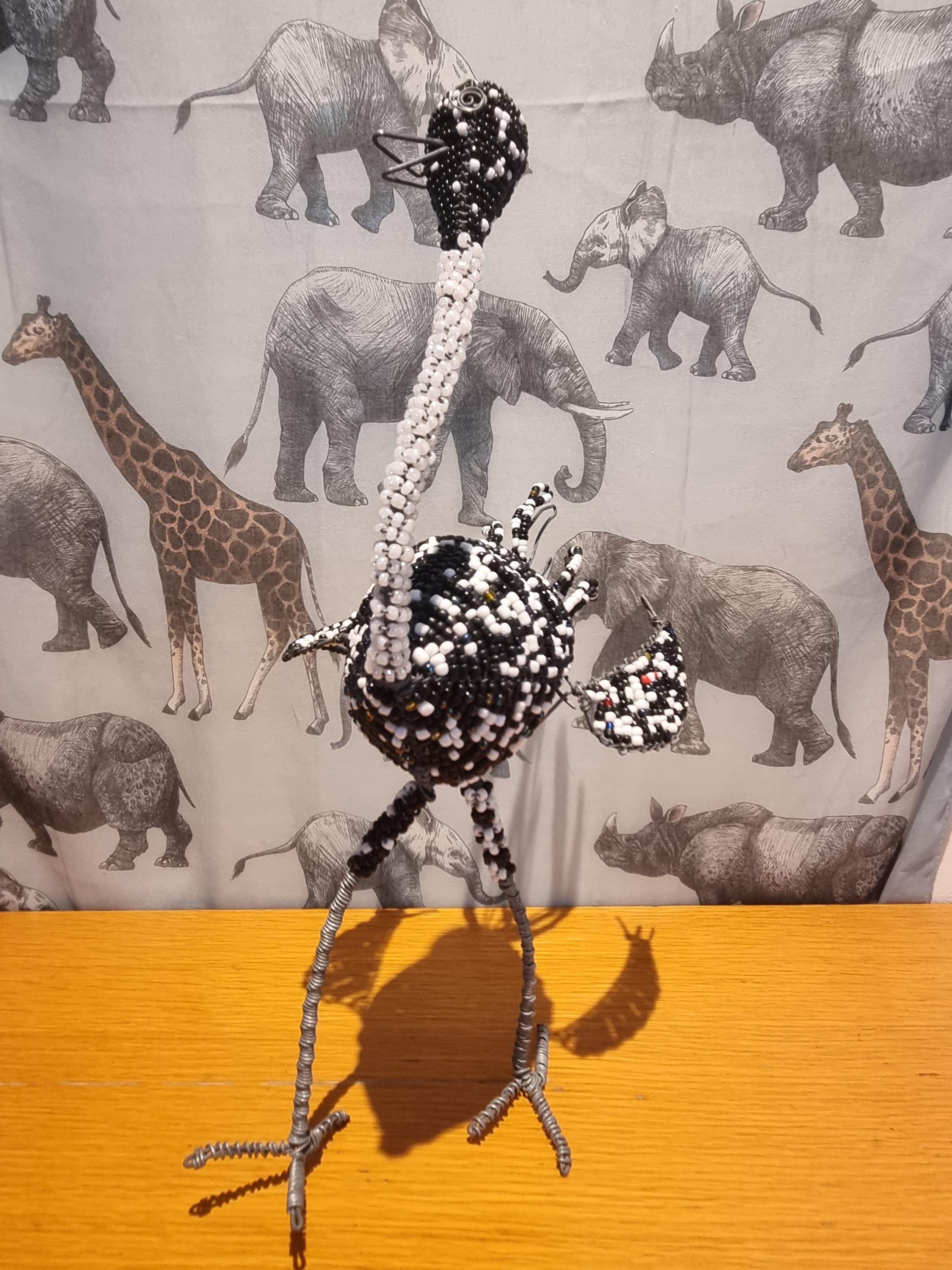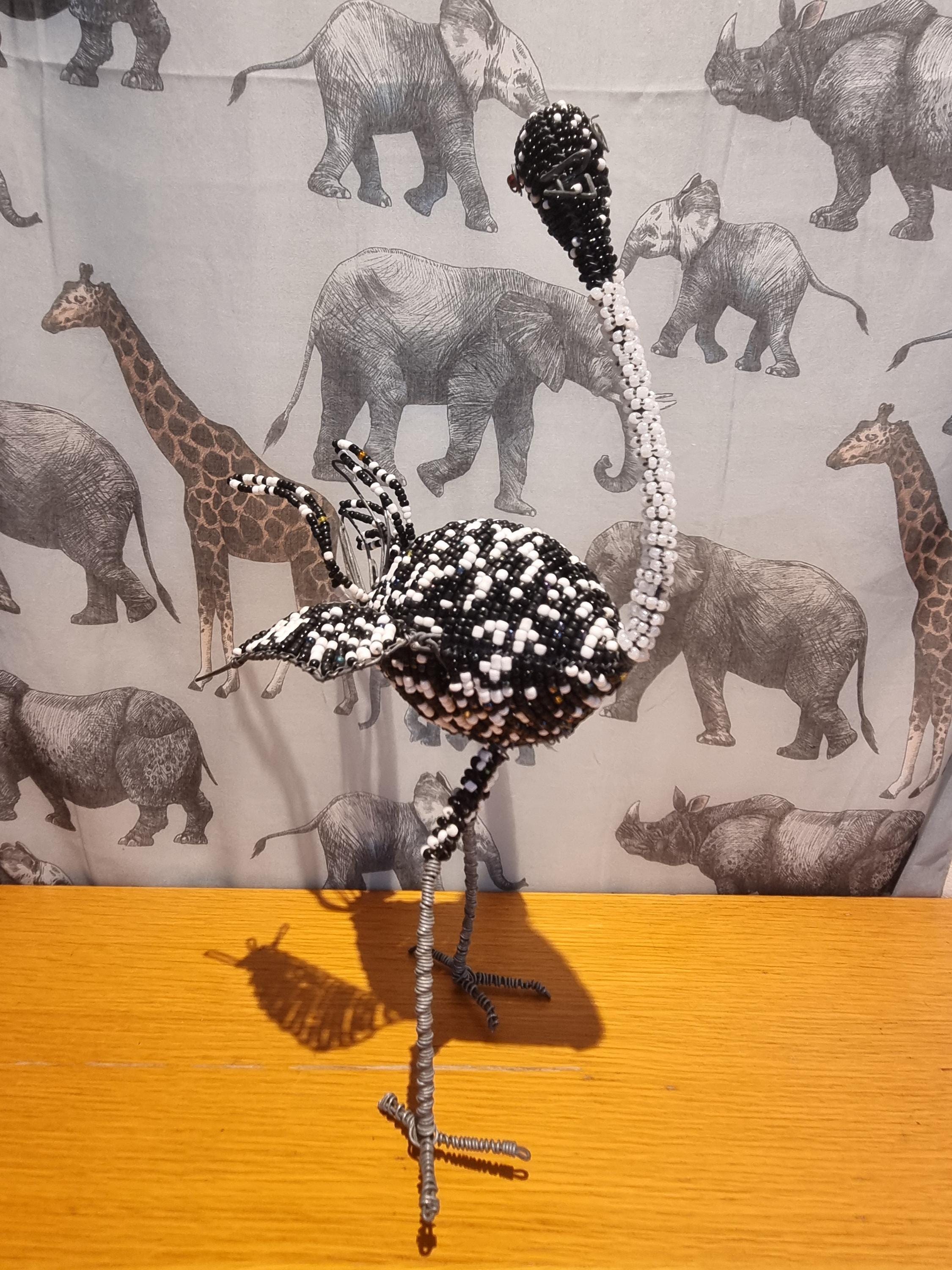 Celebrate the grace and wonder of Africa’s largest bird with this Black & White Beaded Ostrich Sculpture, a handcrafted marvel of artisan skill and sustainable creativity. Standing proudly at 37cm tall, this monochrome ostrich is meticulously made from recycled wire and glass seed beads by fair trade artisans in Southern Africa.