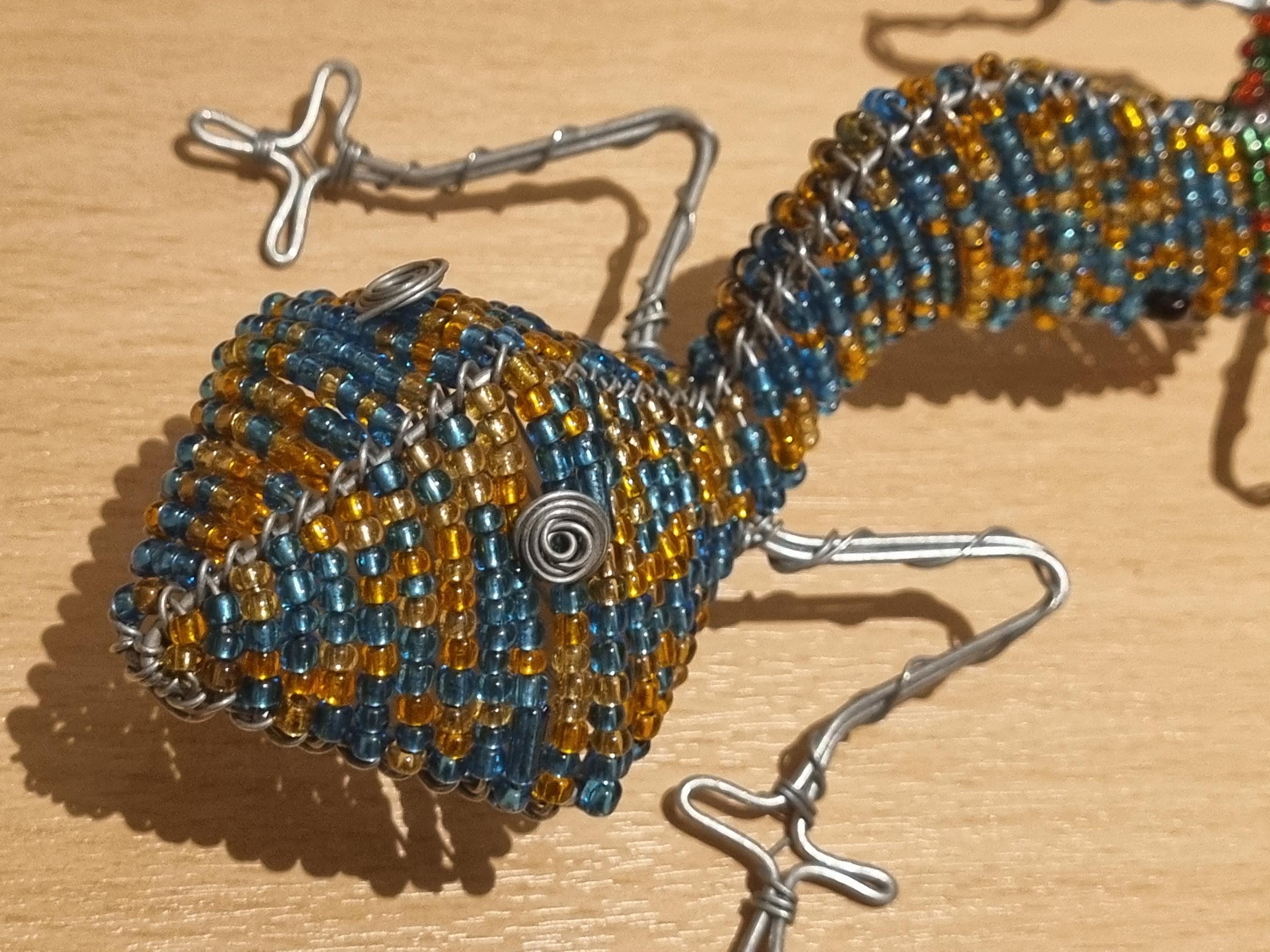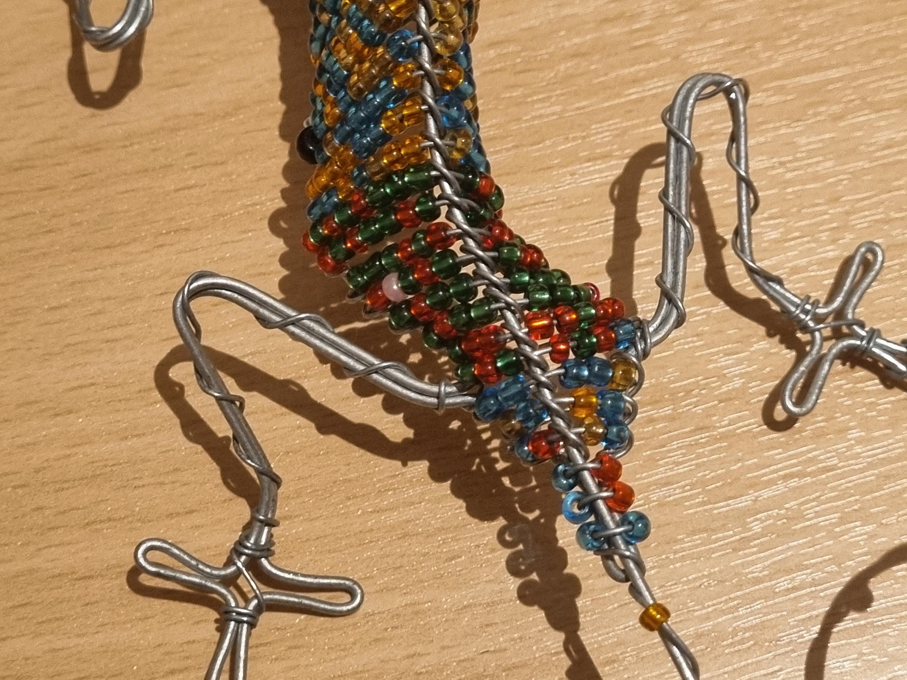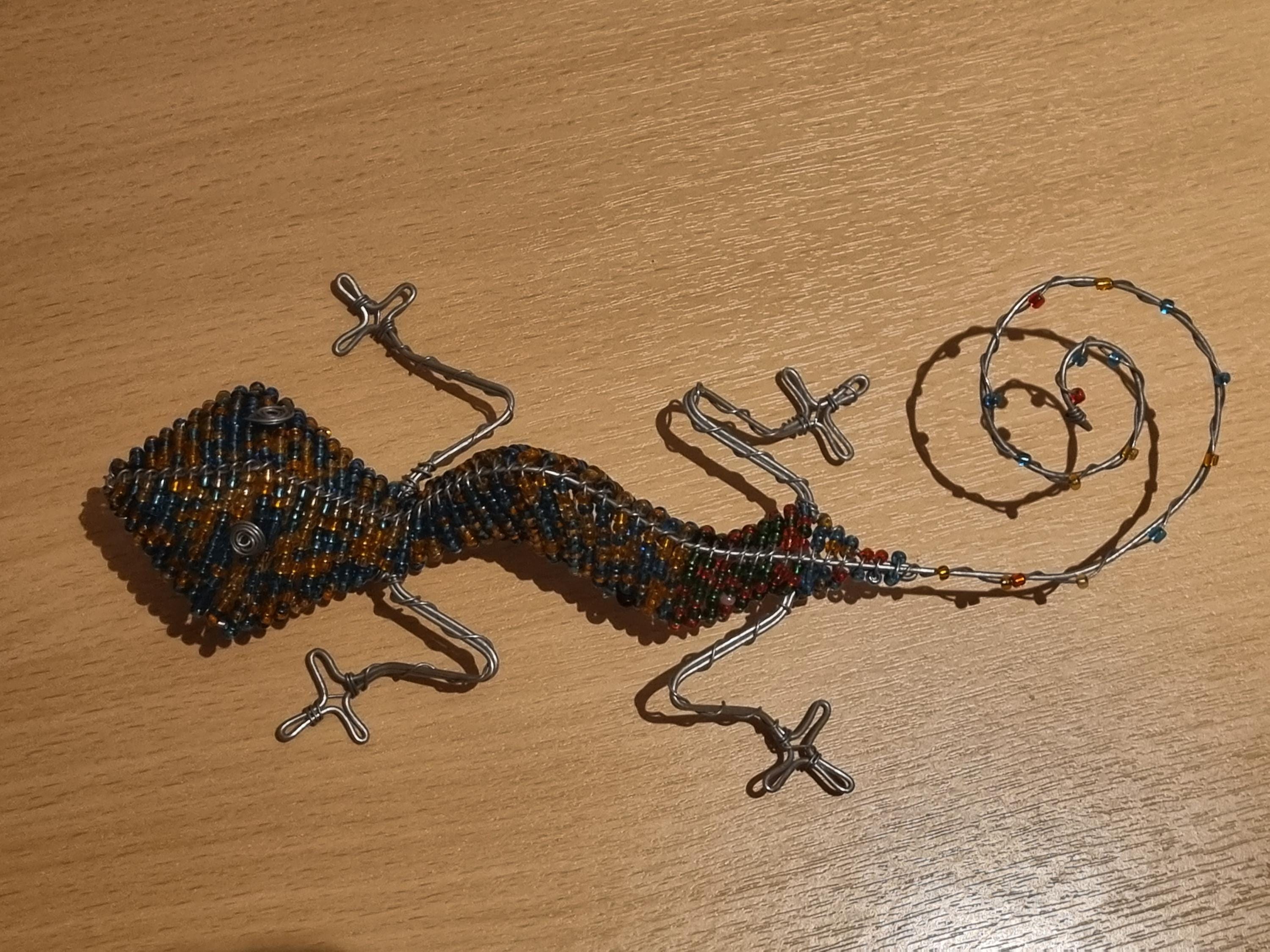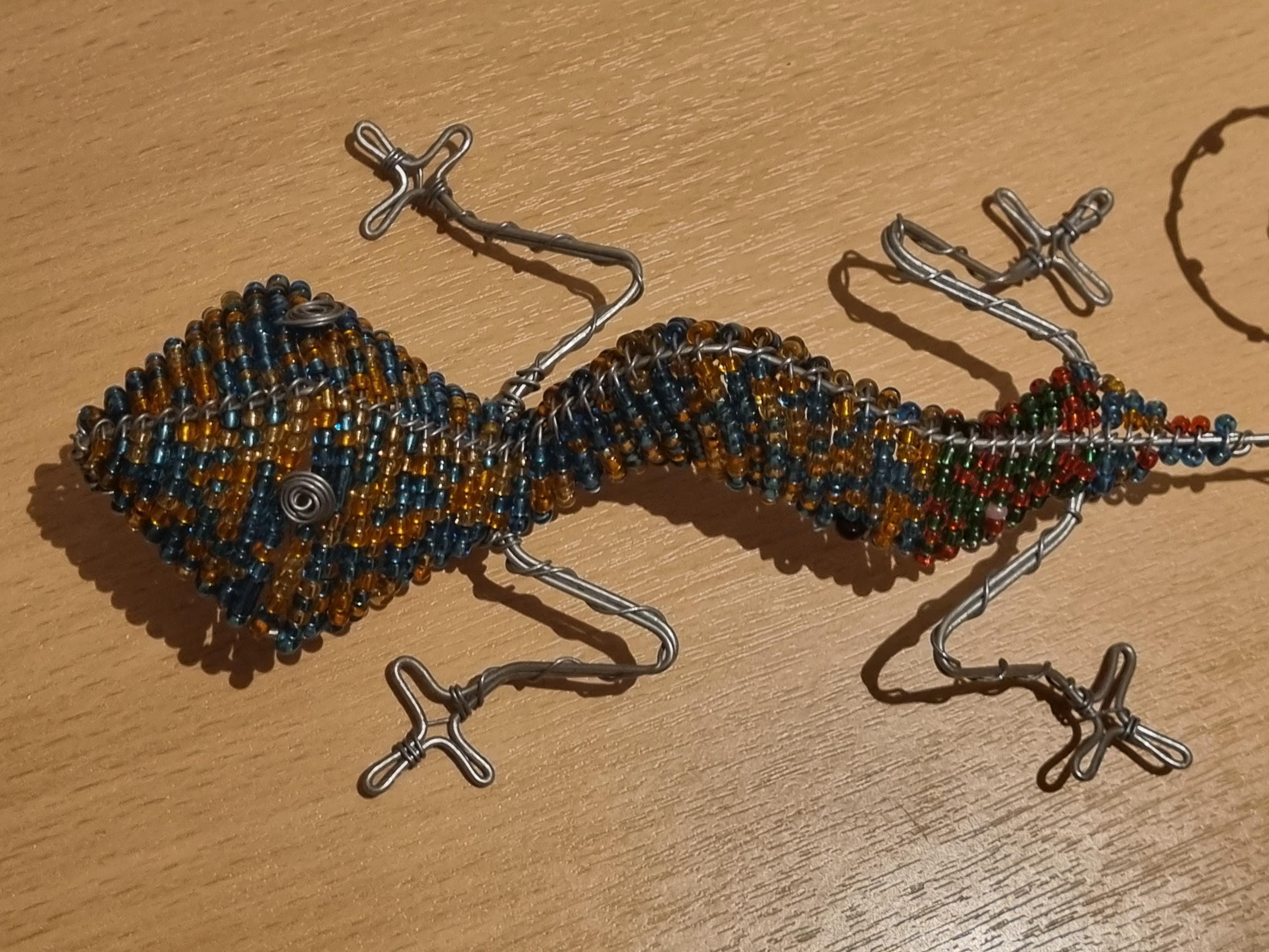 Discover the captivating charm of this handcrafted African lizard/gecko figurine, a remarkable piece of art created with meticulous attention to detail using delicate beaded wire. Measuring approximately 15cm from nose to base of tail, this majestic figurine will elevate any animal collection with its striking presence.
