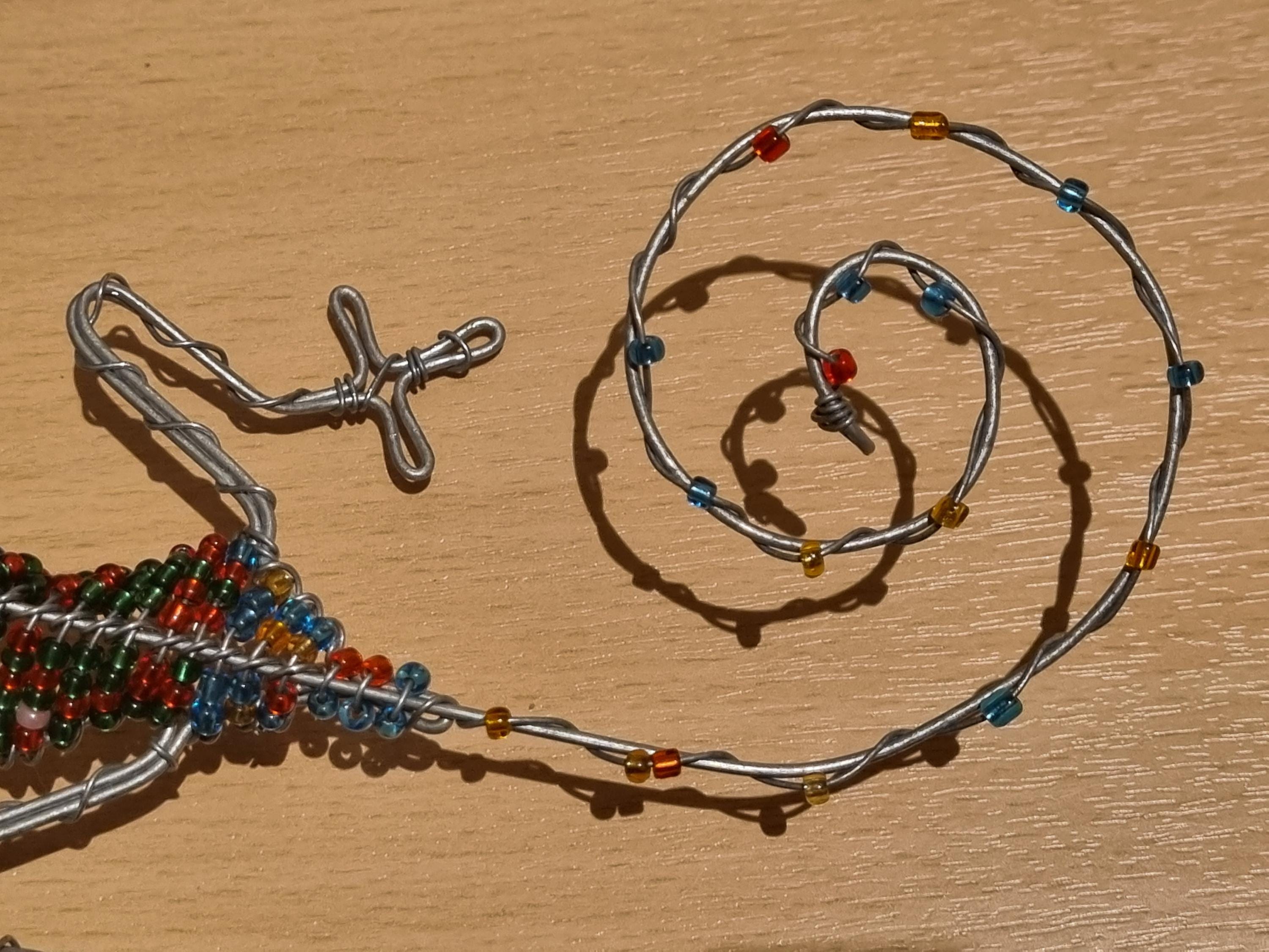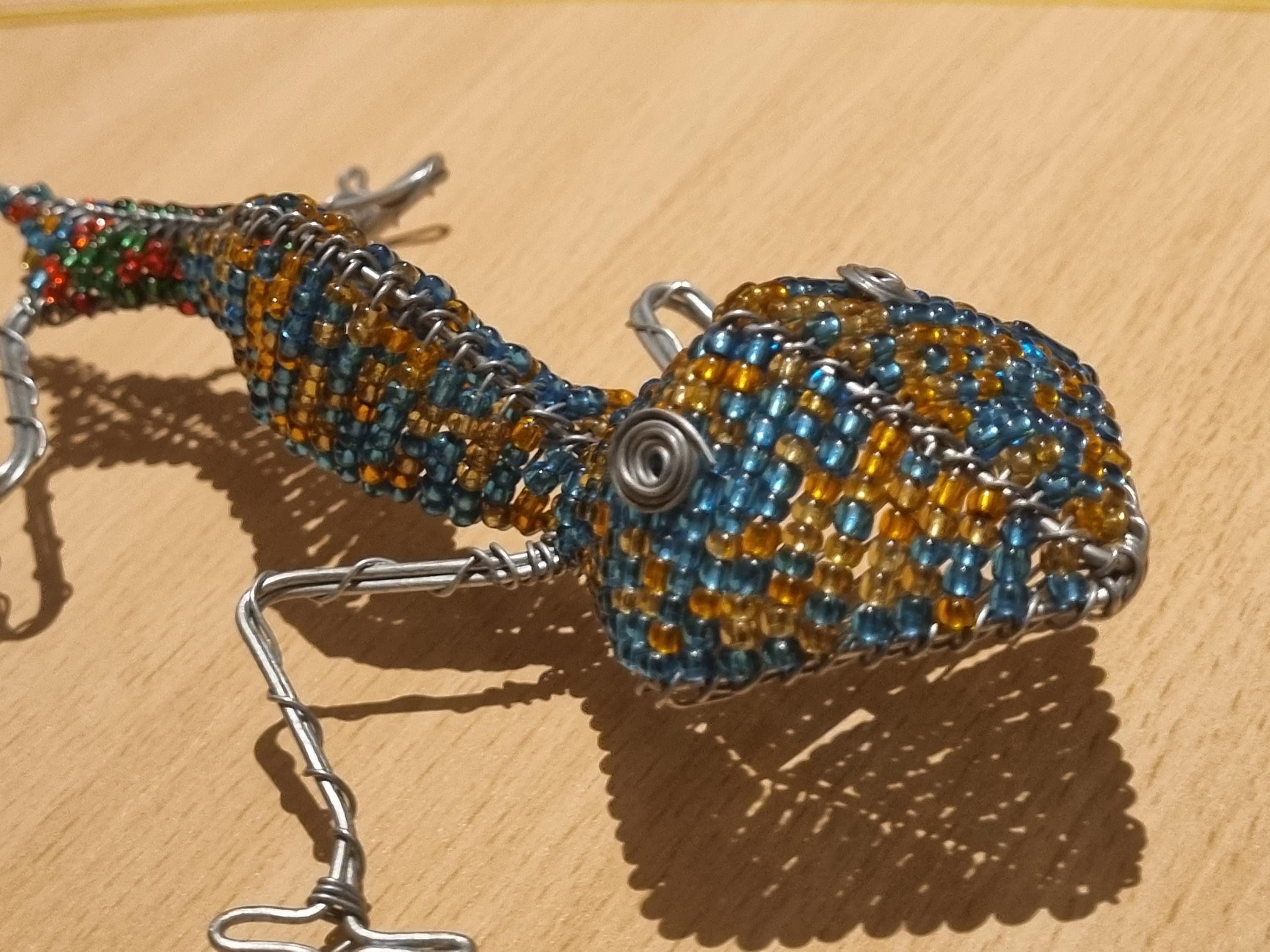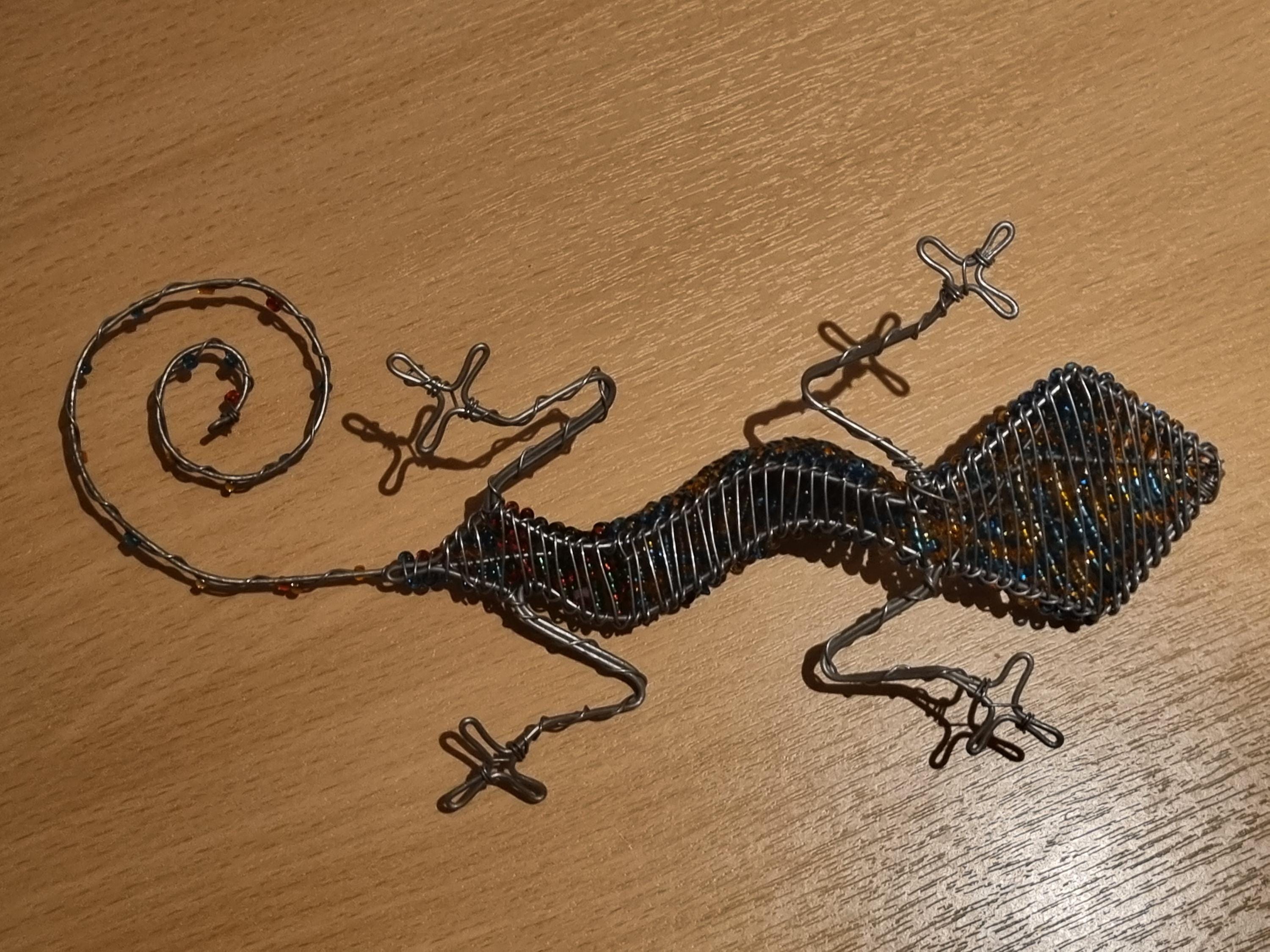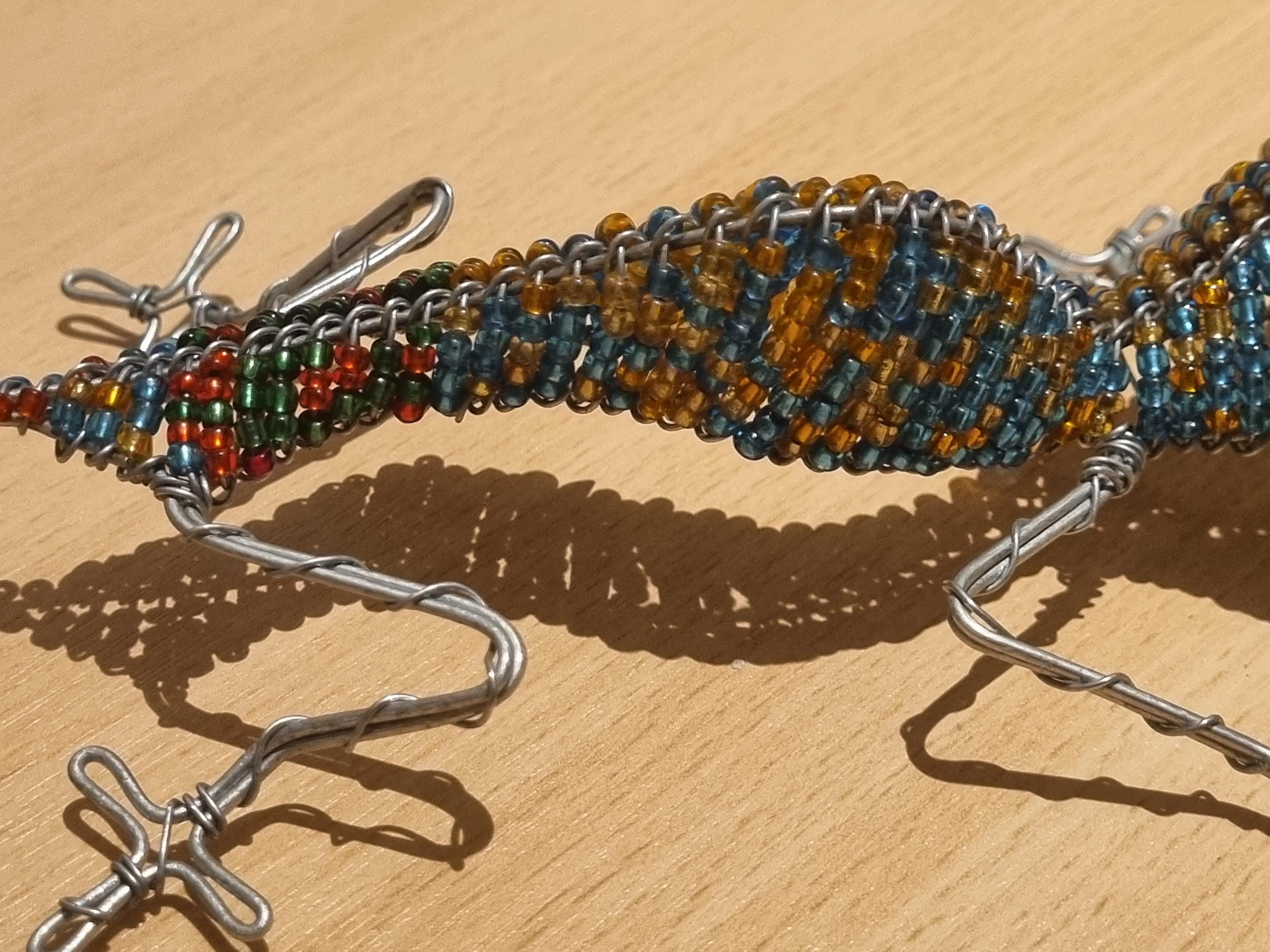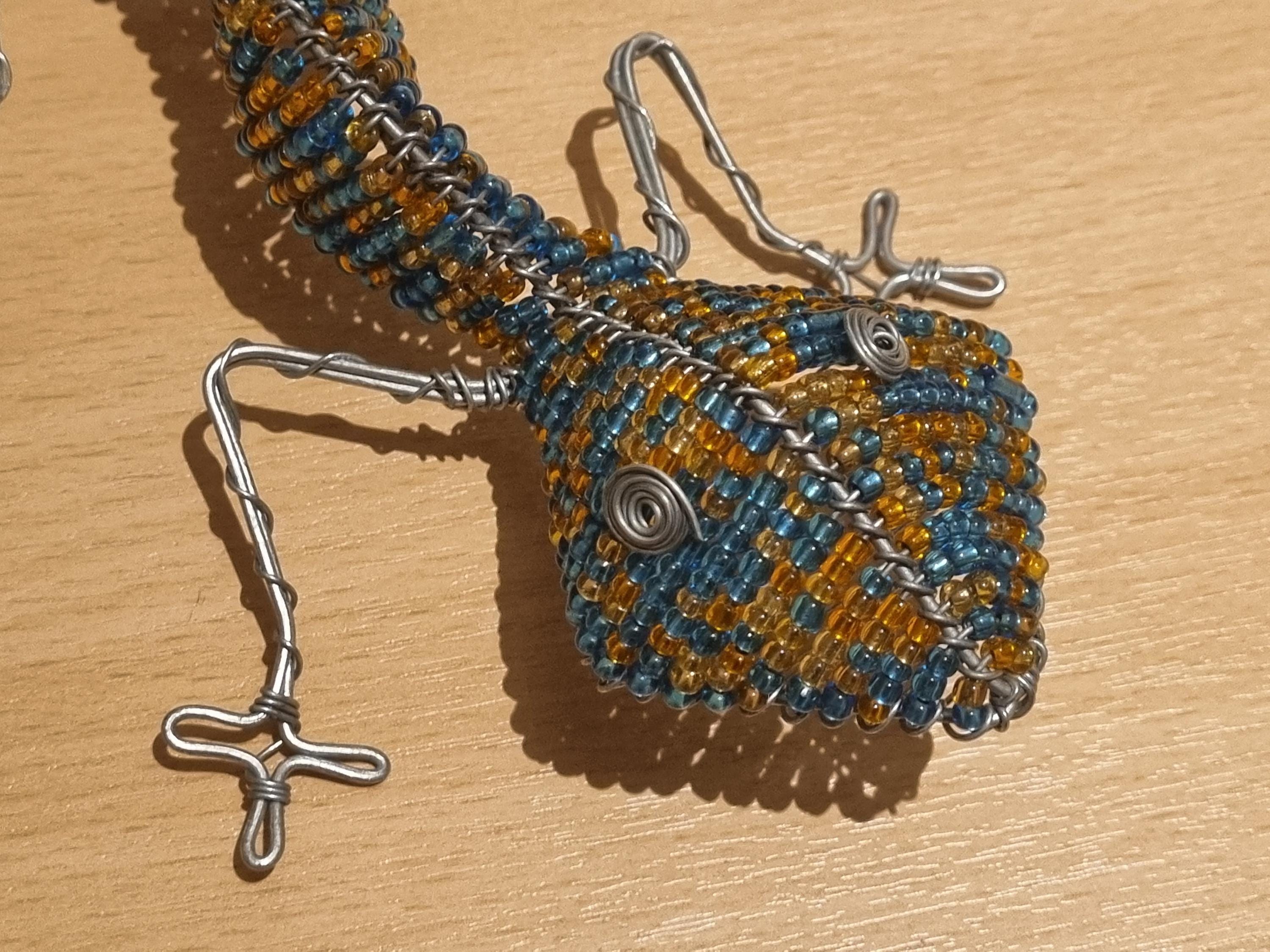 Discover the captivating charm of this handcrafted African lizard/gecko figurine, a remarkable piece of art created with meticulous attention to detail using delicate beaded wire. Measuring approximately 15cm from nose to base of tail, this majestic figurine will elevate any animal collection with its striking presence.