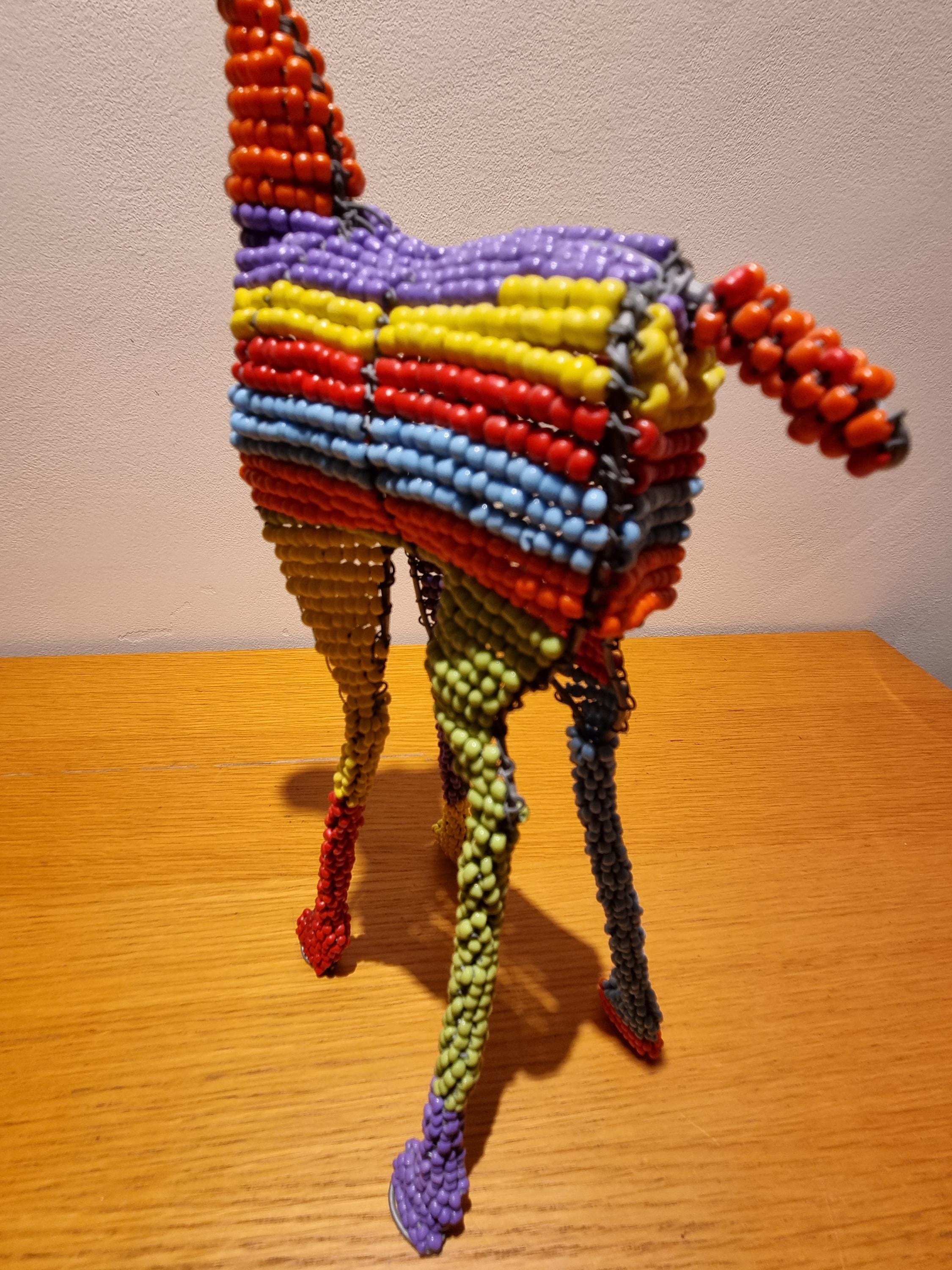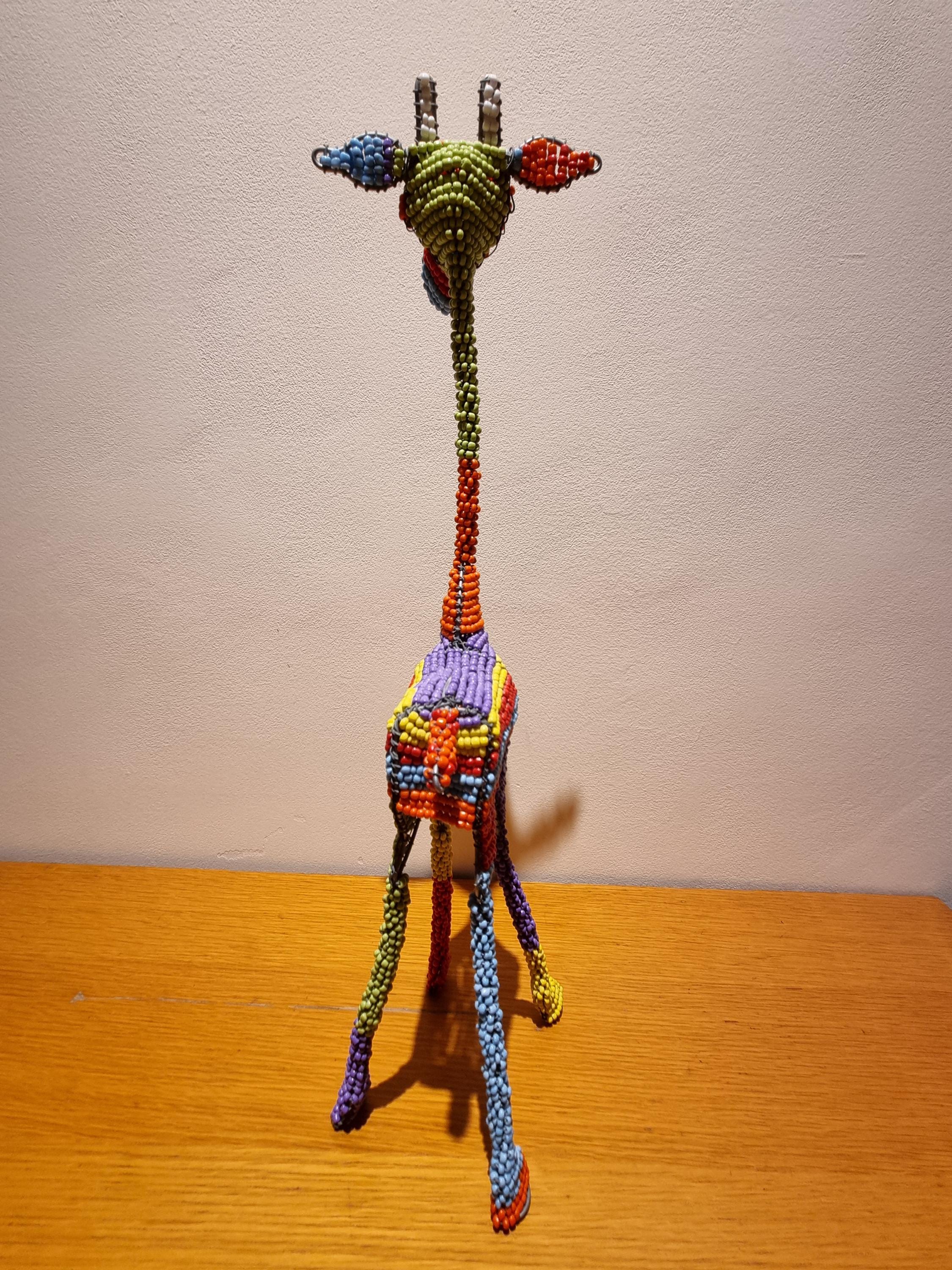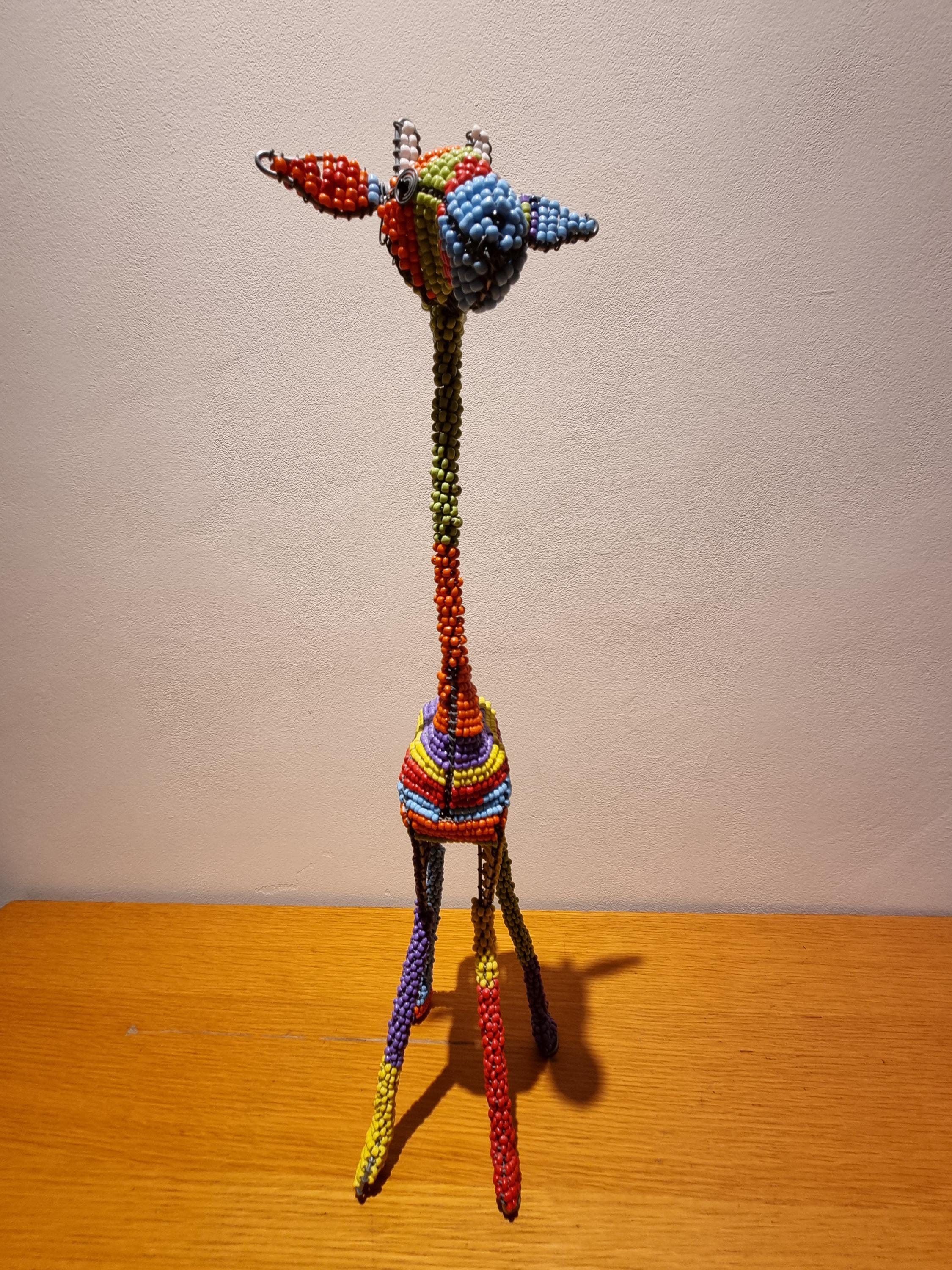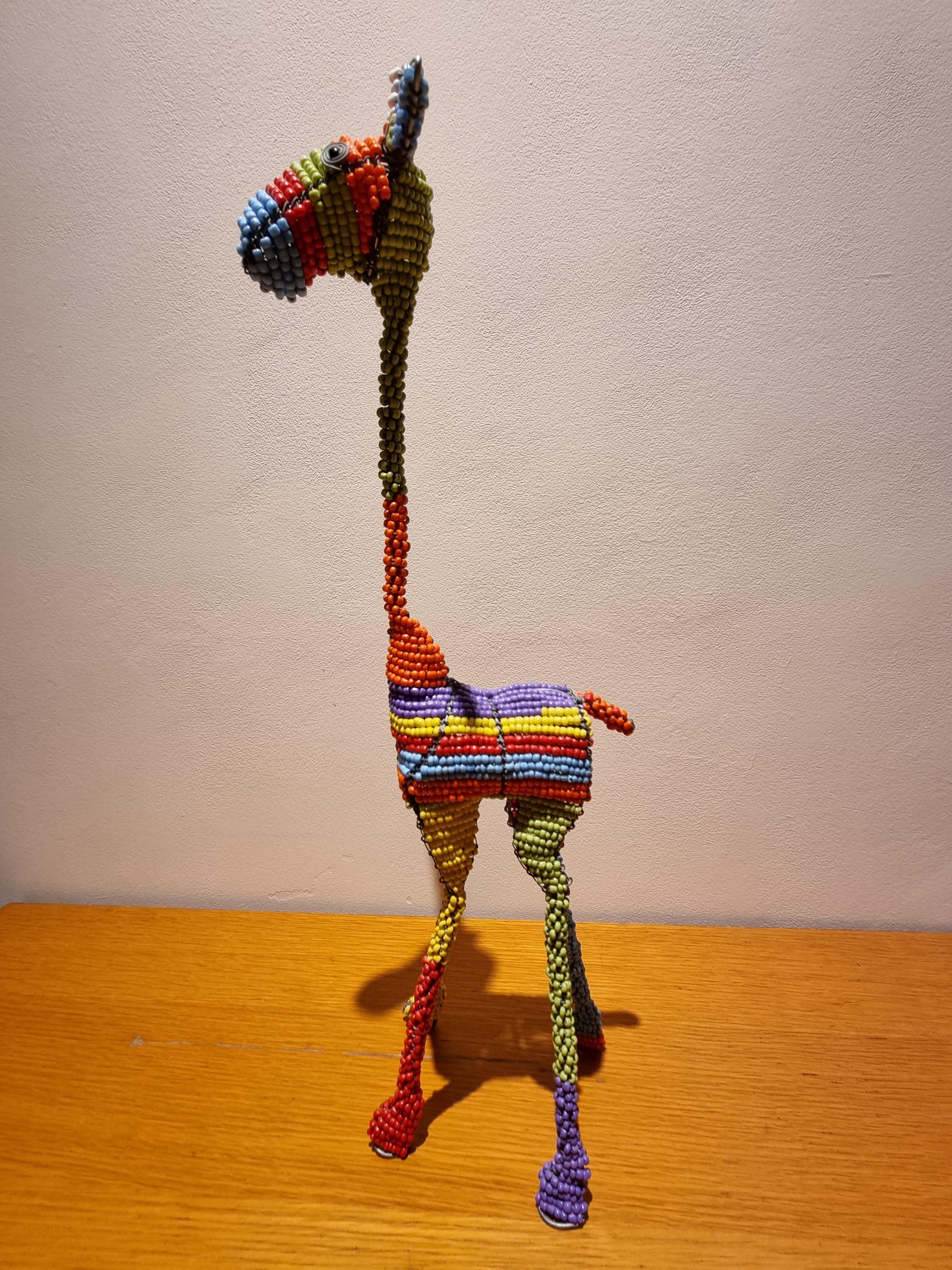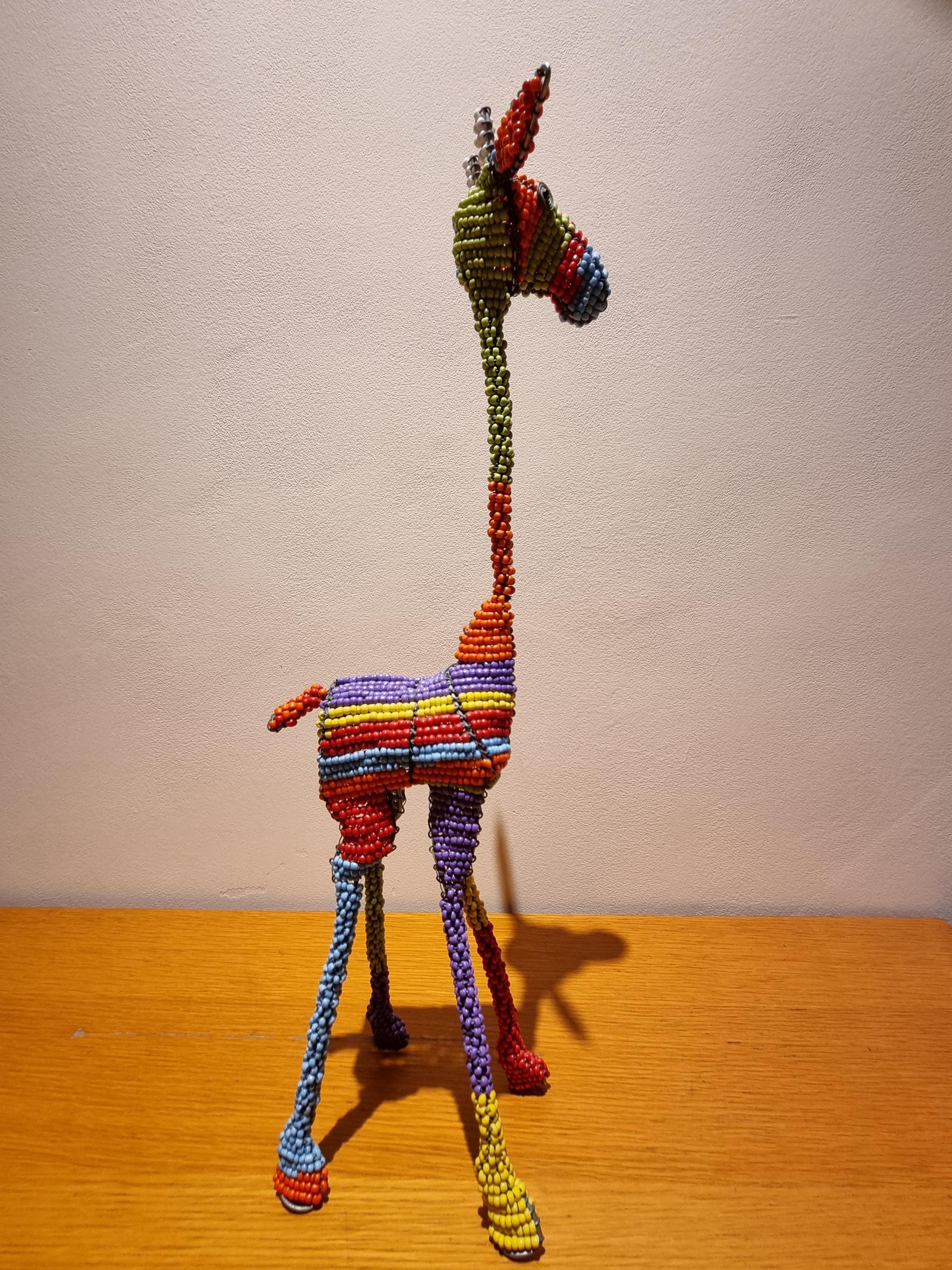 Bring a burst of colour and creativity into your home with this handmade tall beaded giraffe sculpture. Standing at an impressive 51cm high, this vibrant giraffe is crafted using colourful glass beads intricately wrapped around a strong wire frame. Each piece is one-of-a-kind, showcasing the artistry and tradition of African beadwork.