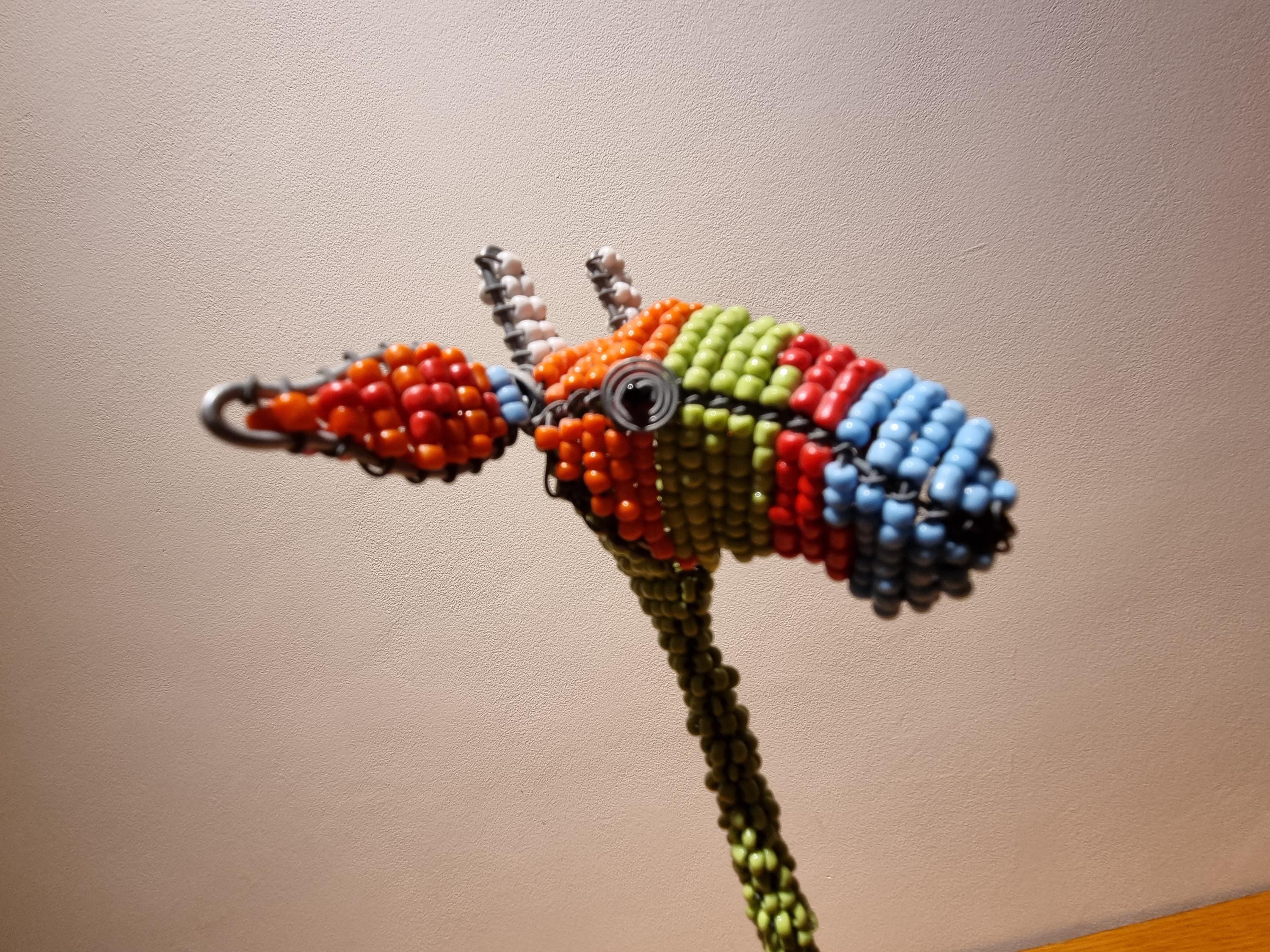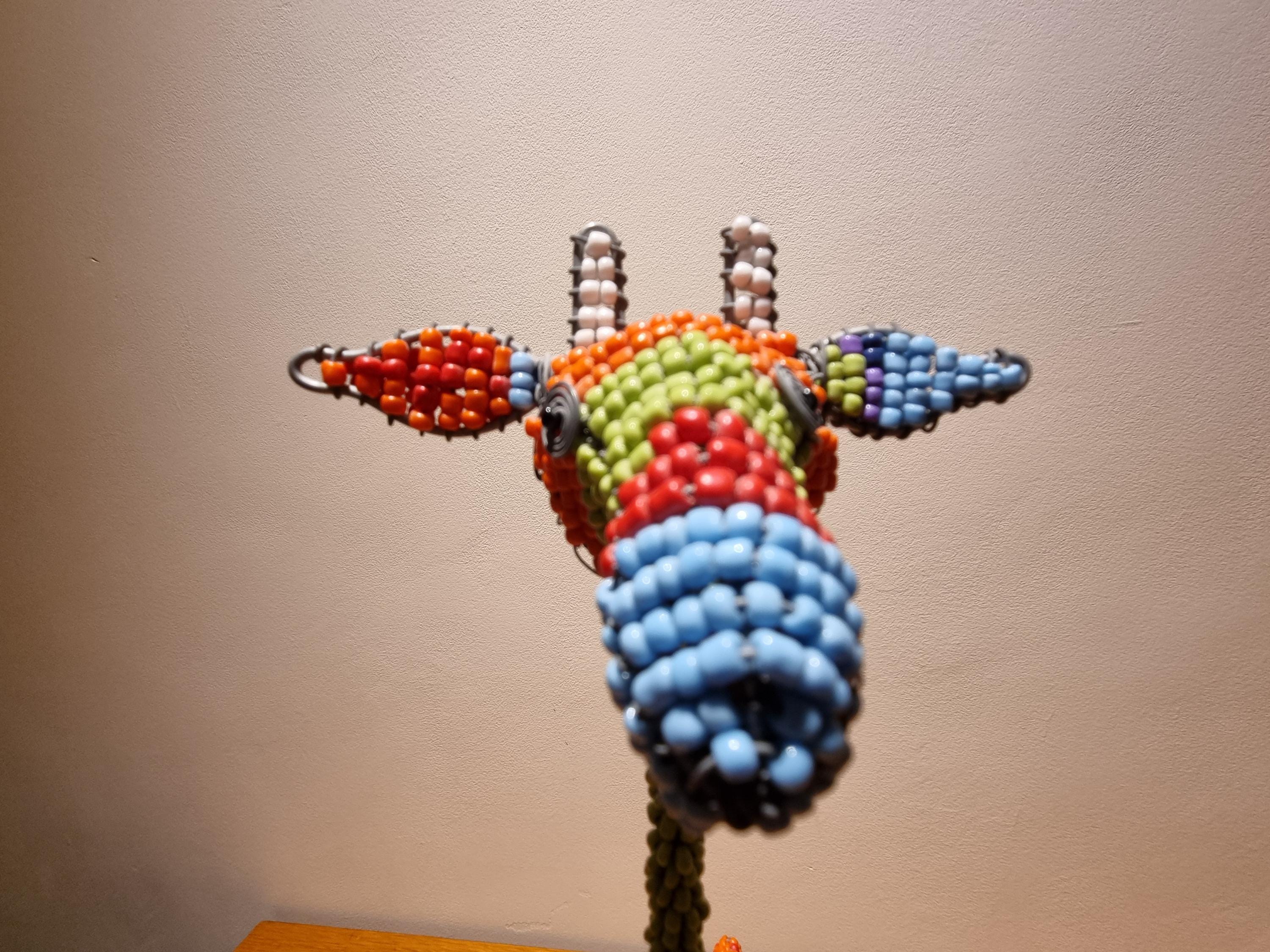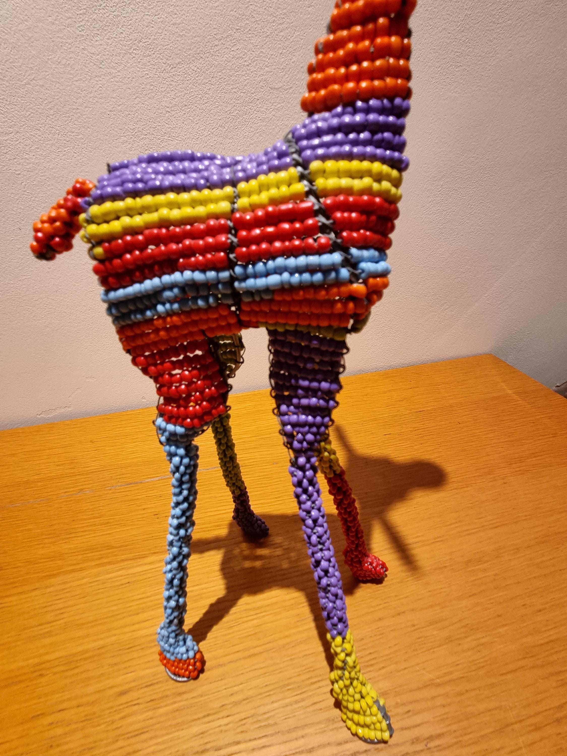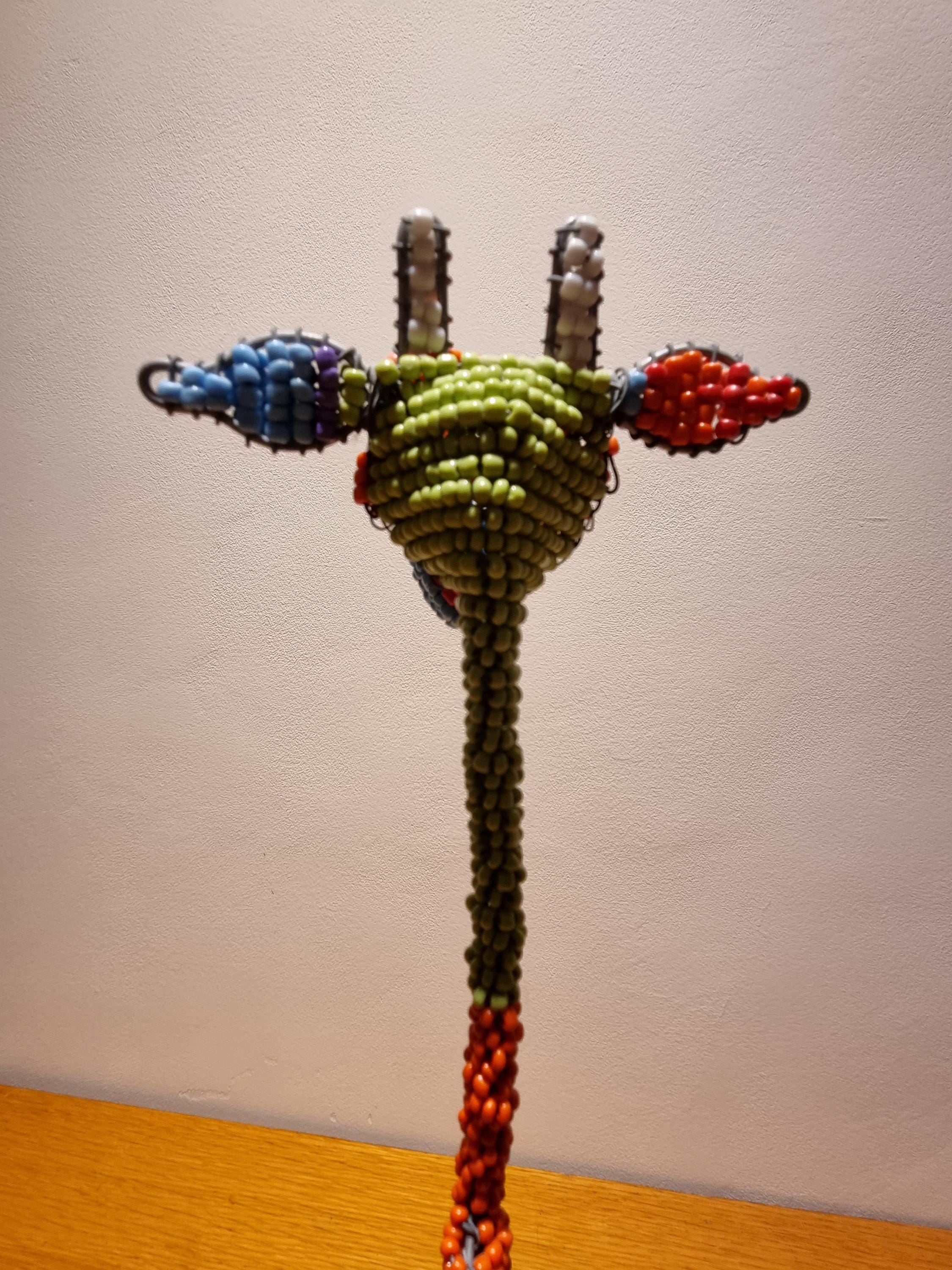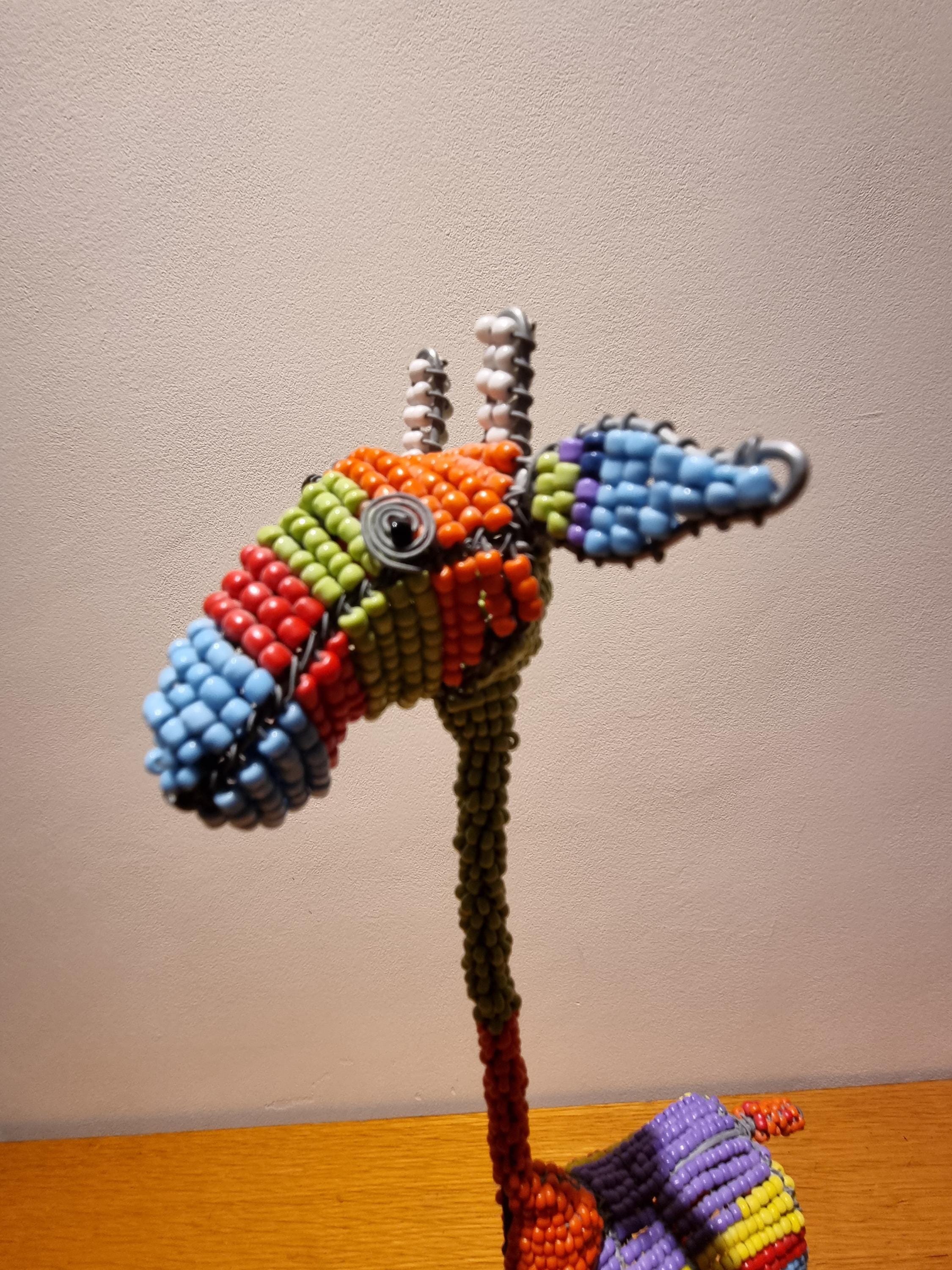 Bring a burst of colour and creativity into your home with this handmade tall beaded giraffe sculpture. Standing at an impressive 51cm high, this vibrant giraffe is crafted using colourful glass beads intricately wrapped around a strong wire frame. Each piece is one-of-a-kind, showcasing the artistry and tradition of African beadwork.
