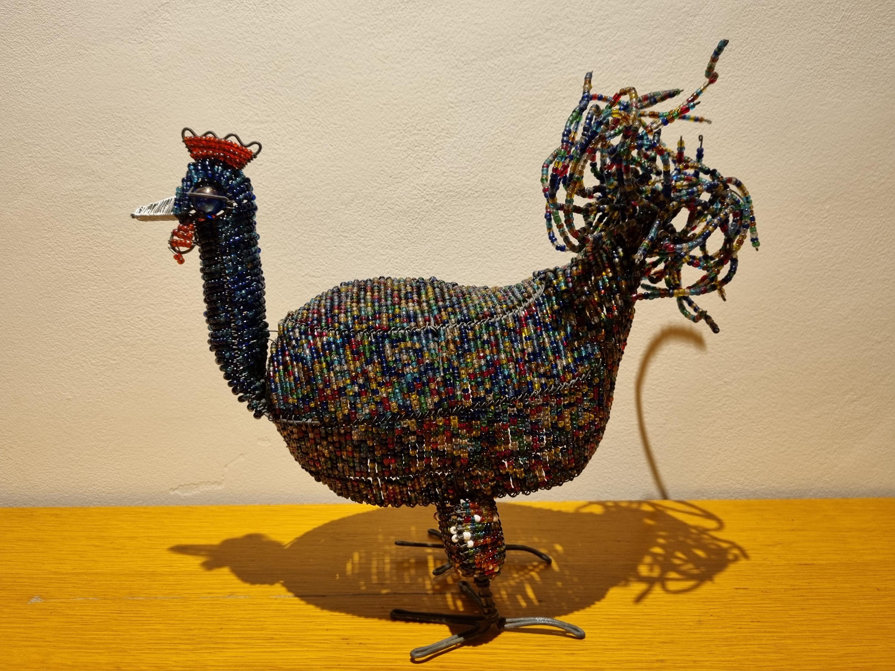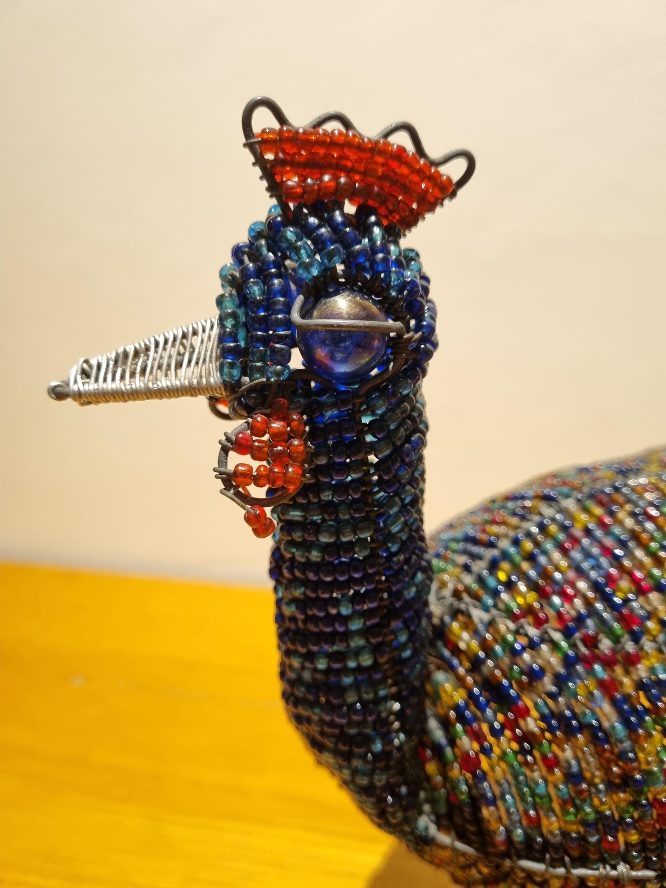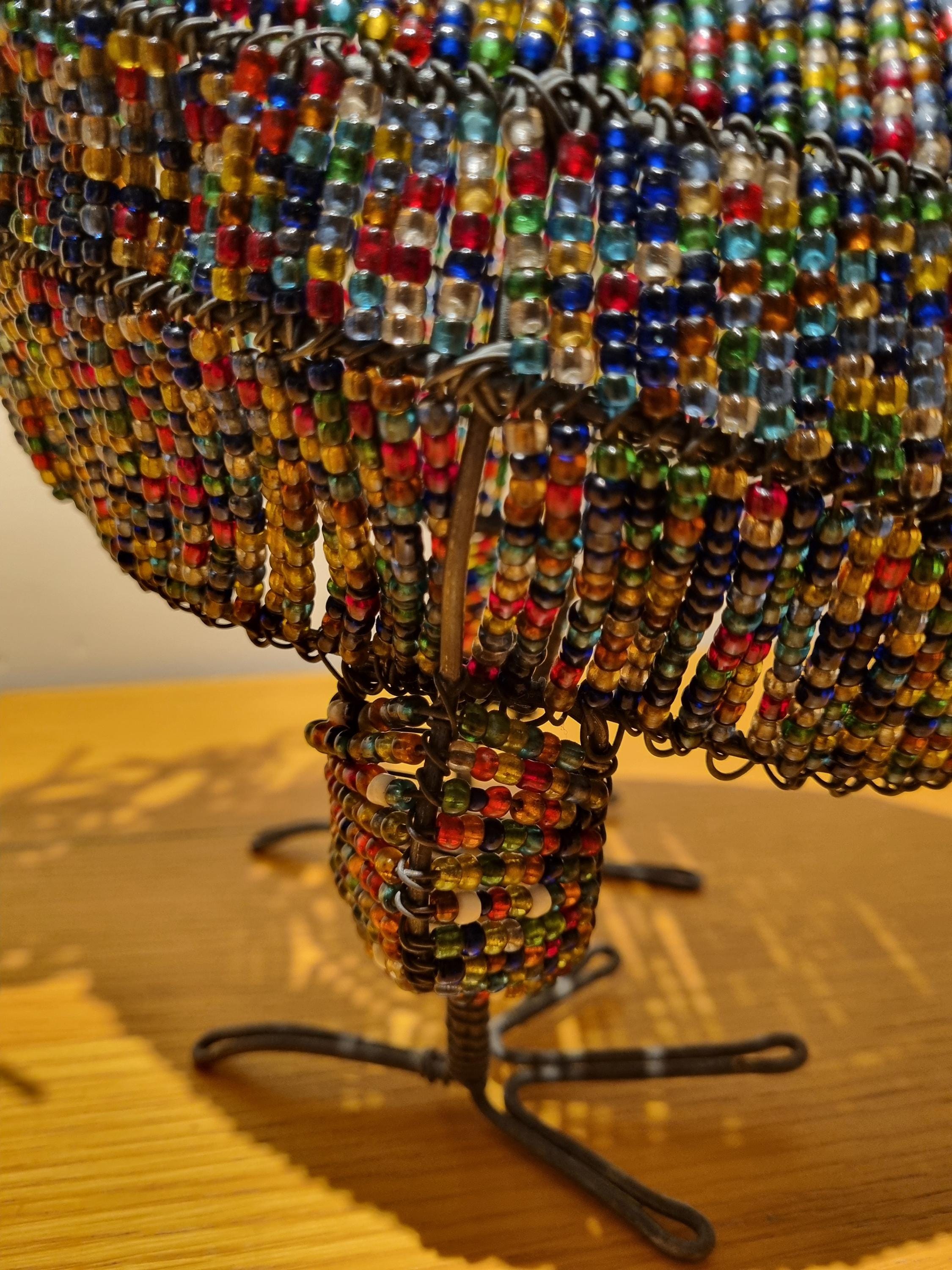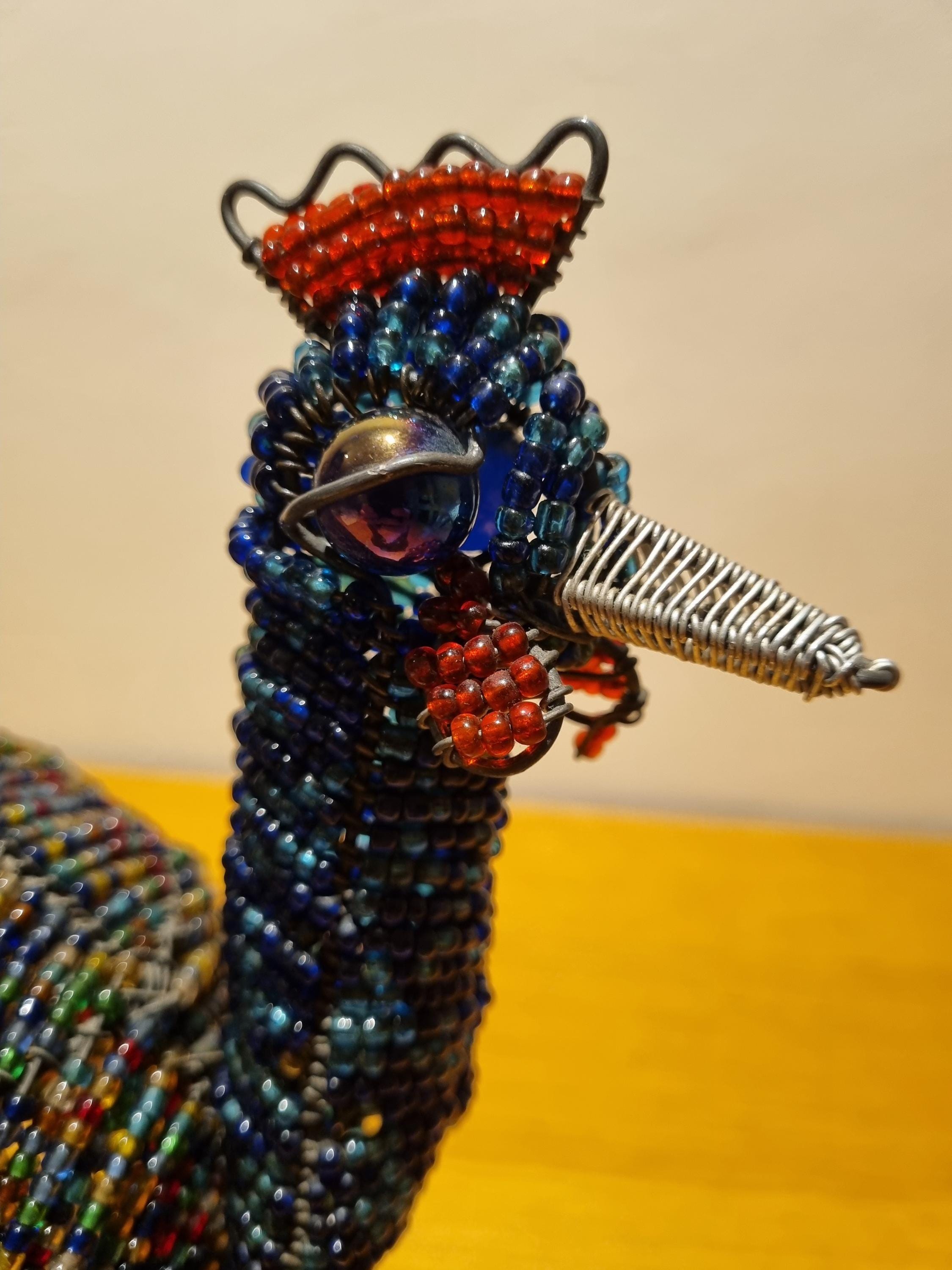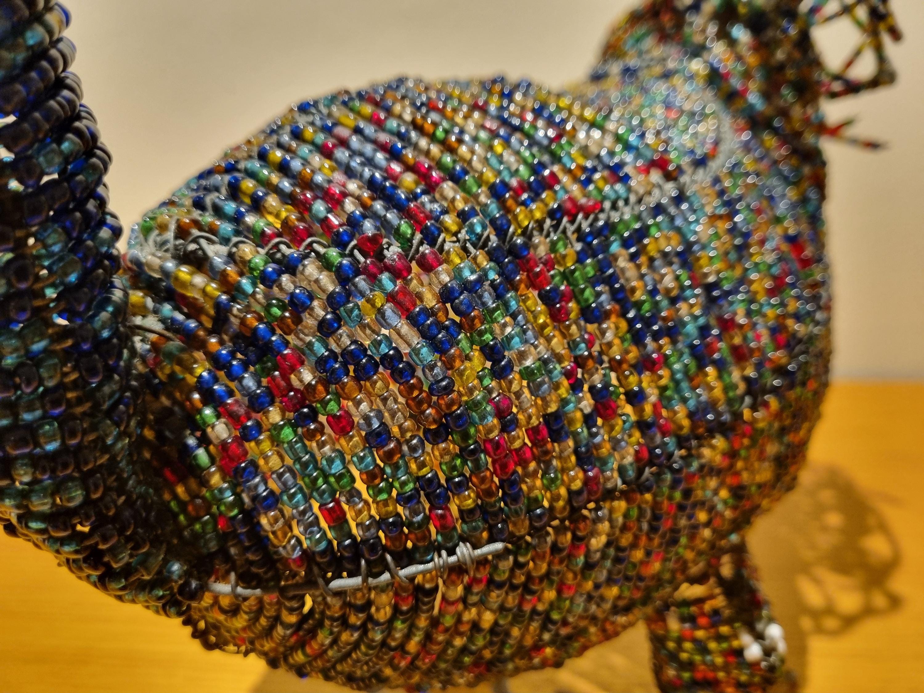 Lovingly created from hand-strung glass beads and durable wire, this rooster showcases vibrant shades of red, blue, green, gold, and more. Its intricate detailing – from the proud comb to the lively tail feathers – makes it a captivating centrepiece.