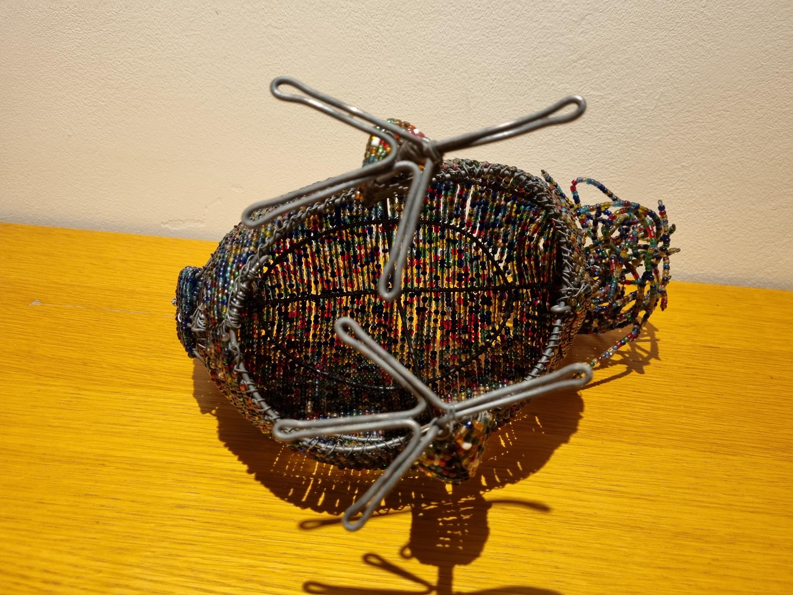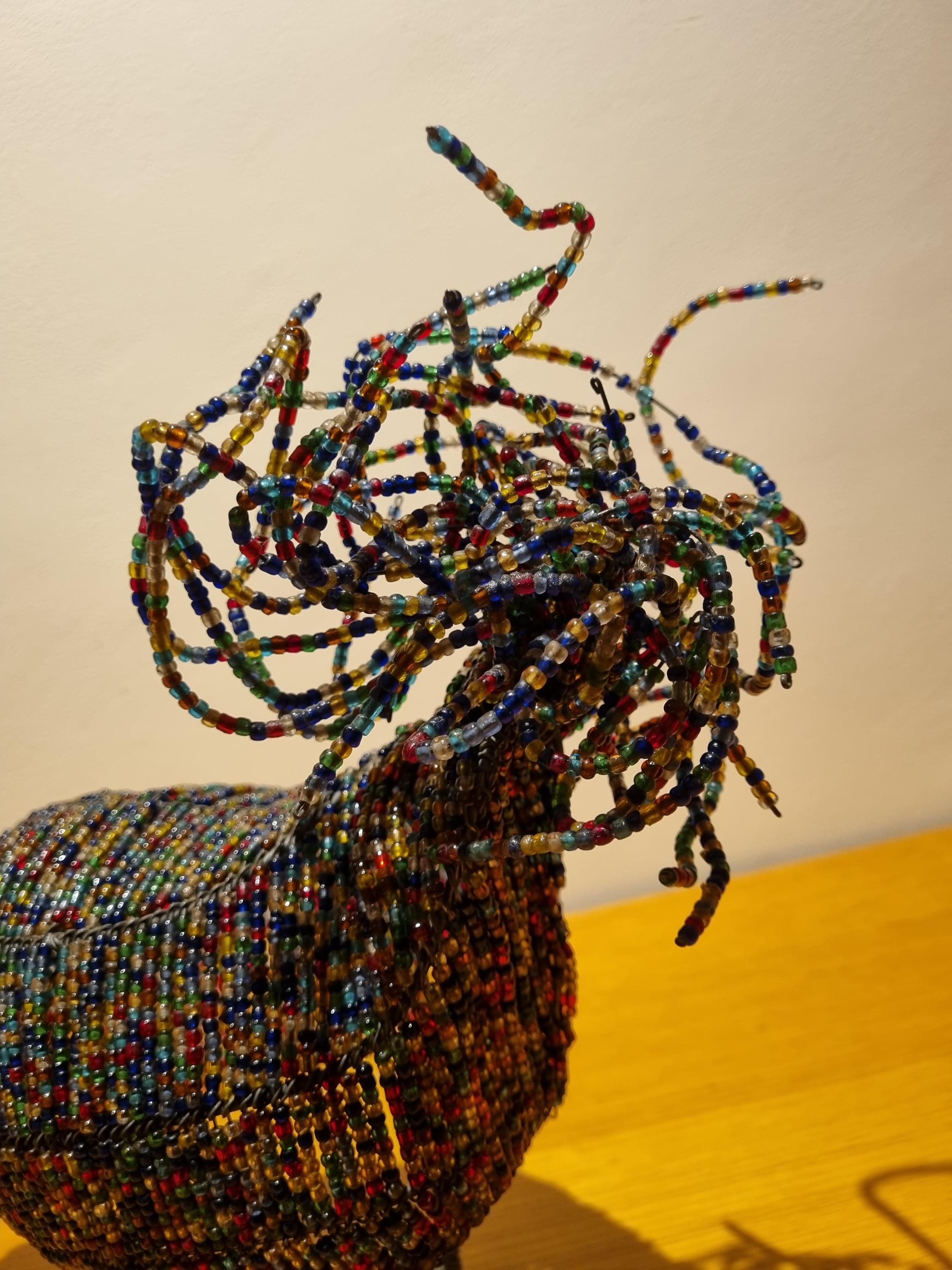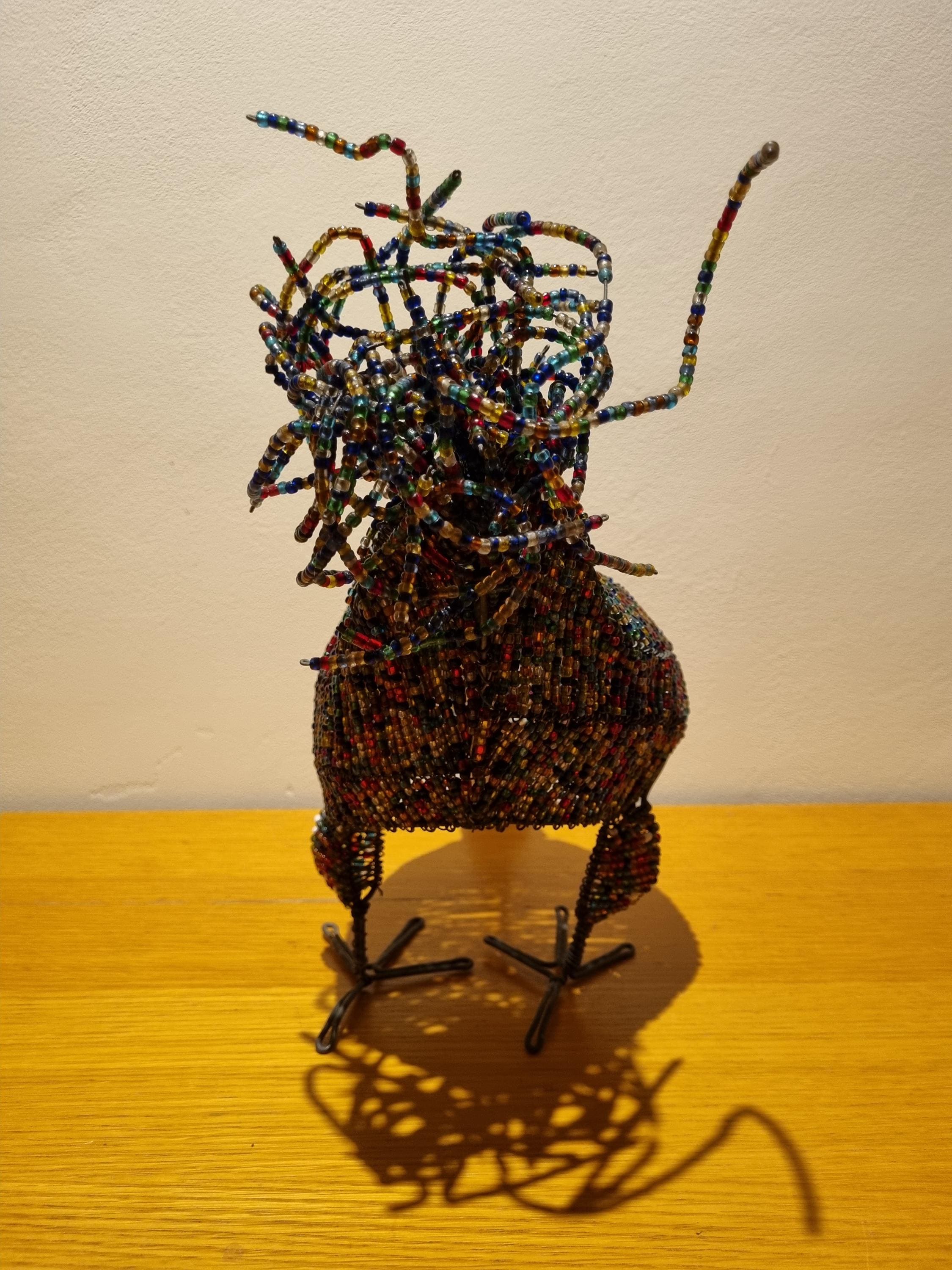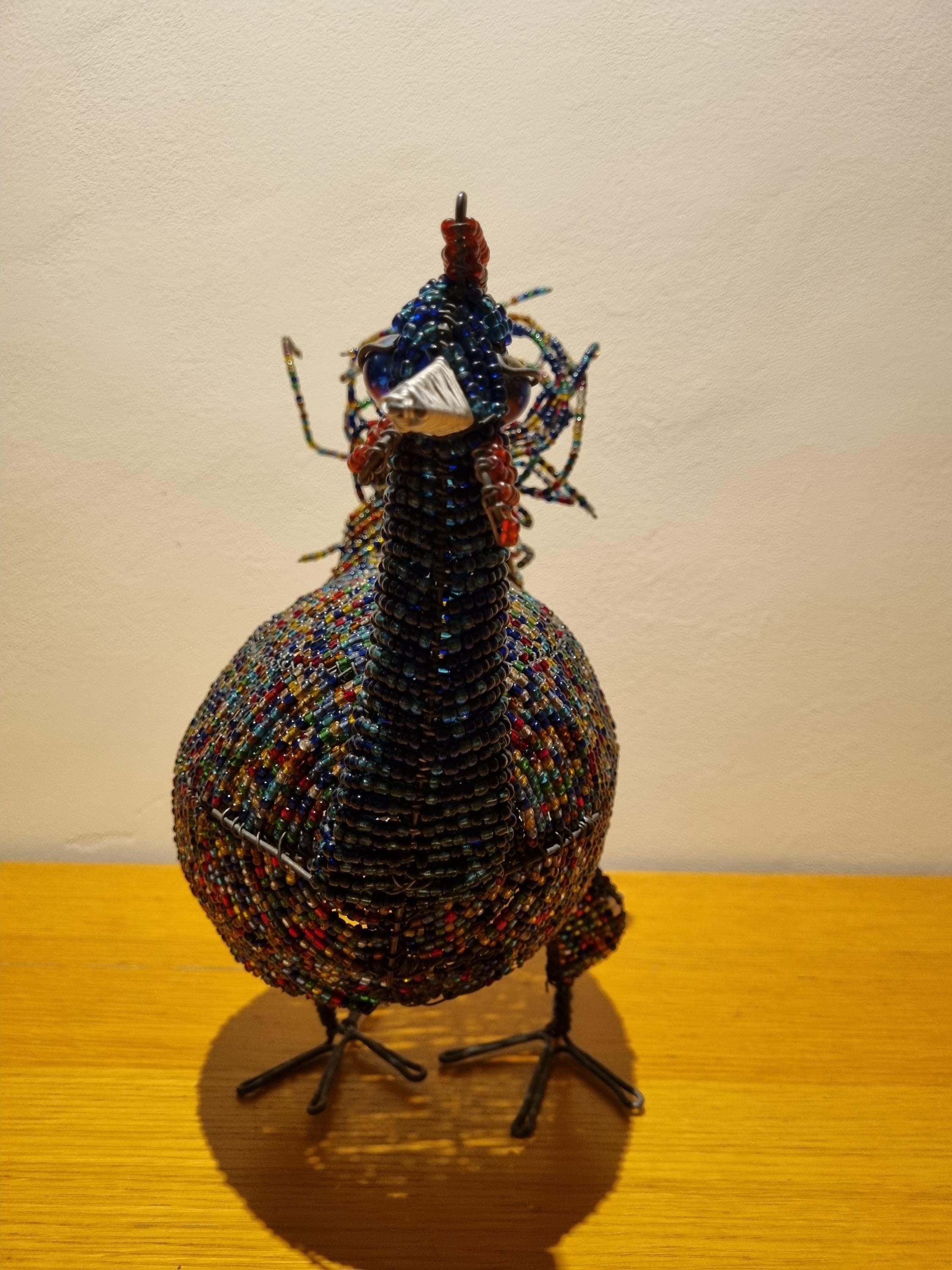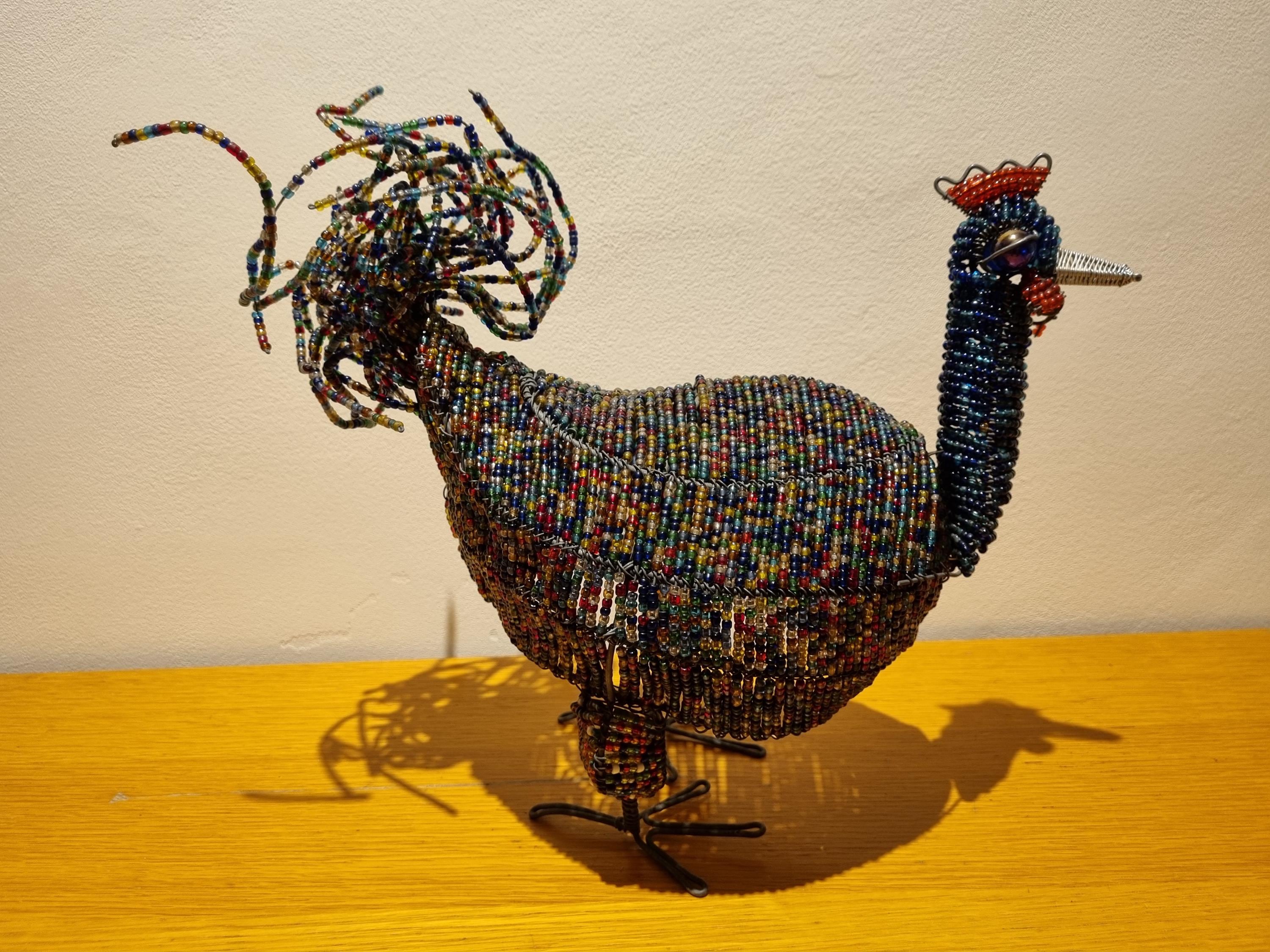 Lovingly created from hand-strung glass beads and durable wire, this rooster showcases vibrant shades of red, blue, green, gold, and more. Its intricate detailing – from the proud comb to the lively tail feathers – makes it a captivating centrepiece.