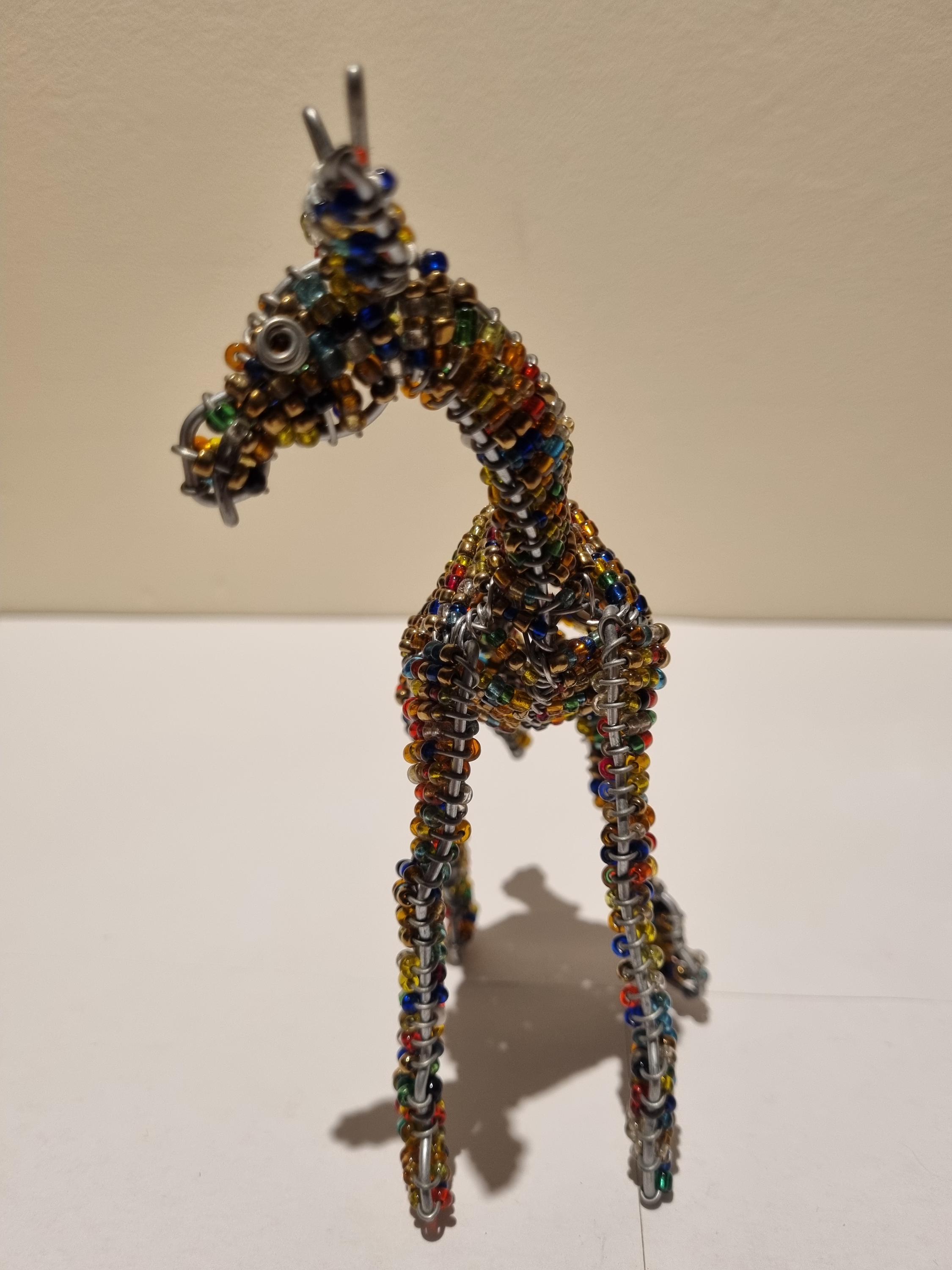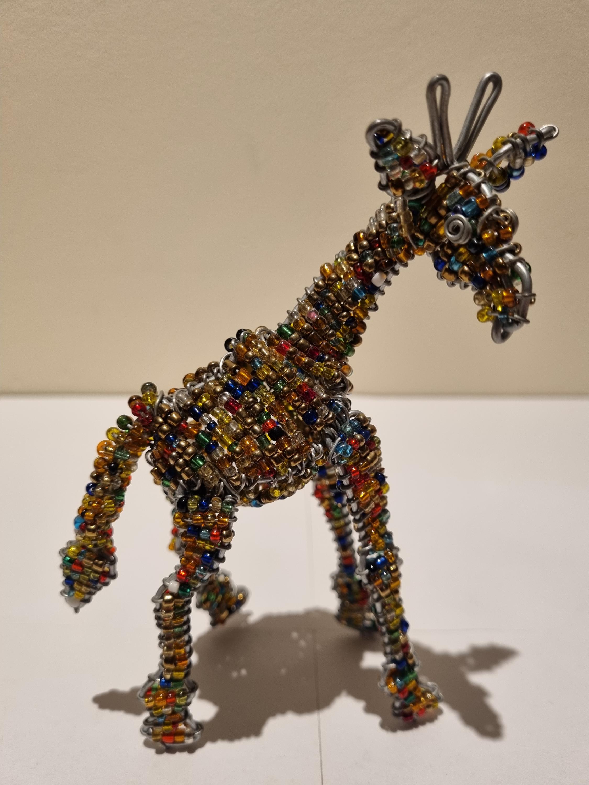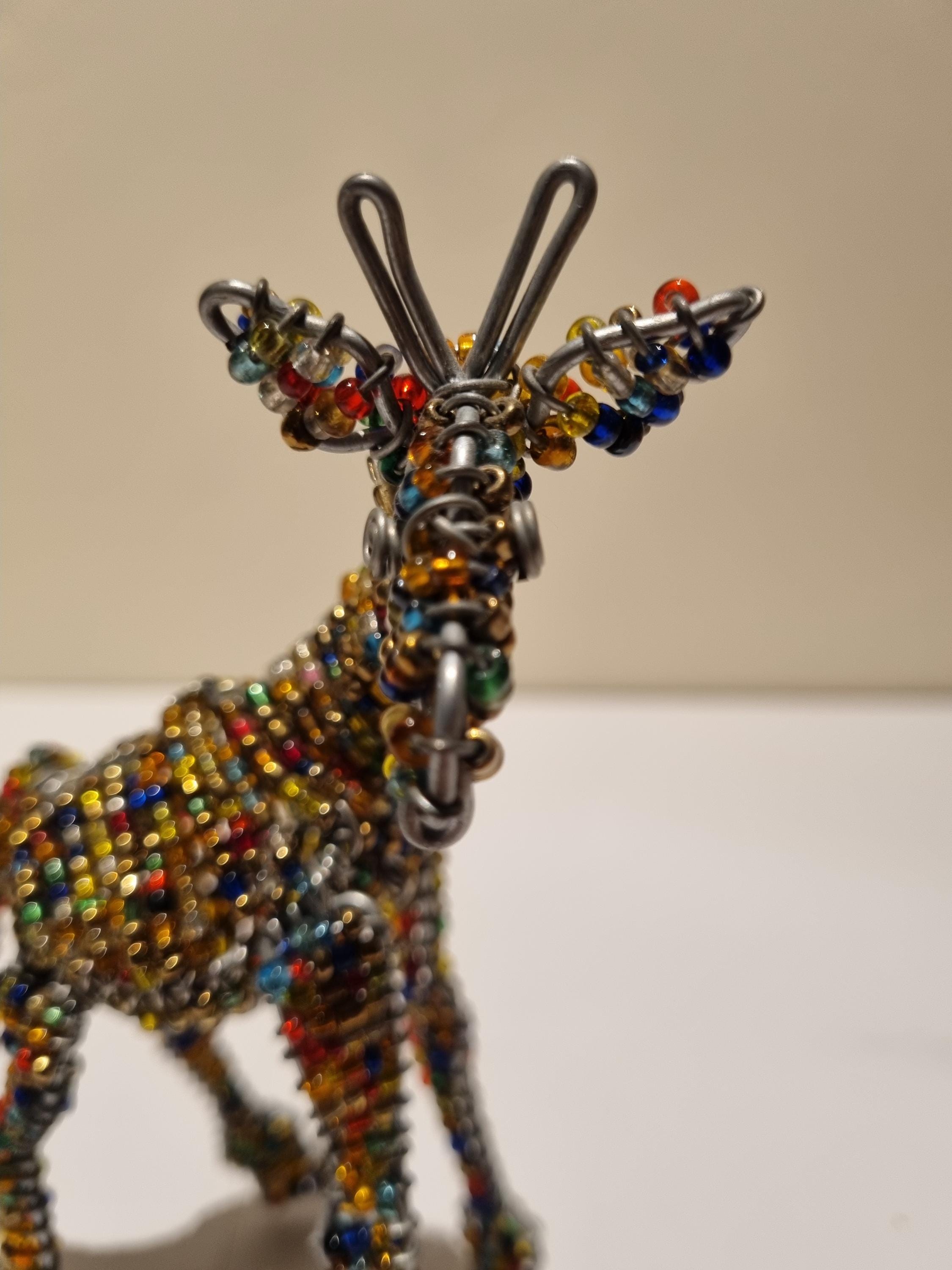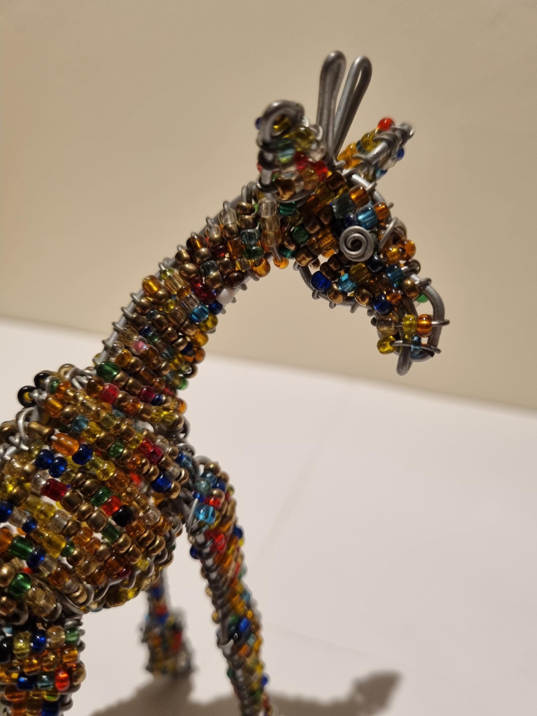 Bring the beauty of African wildlife into your home with this handmade colorful beaded short giraffe.