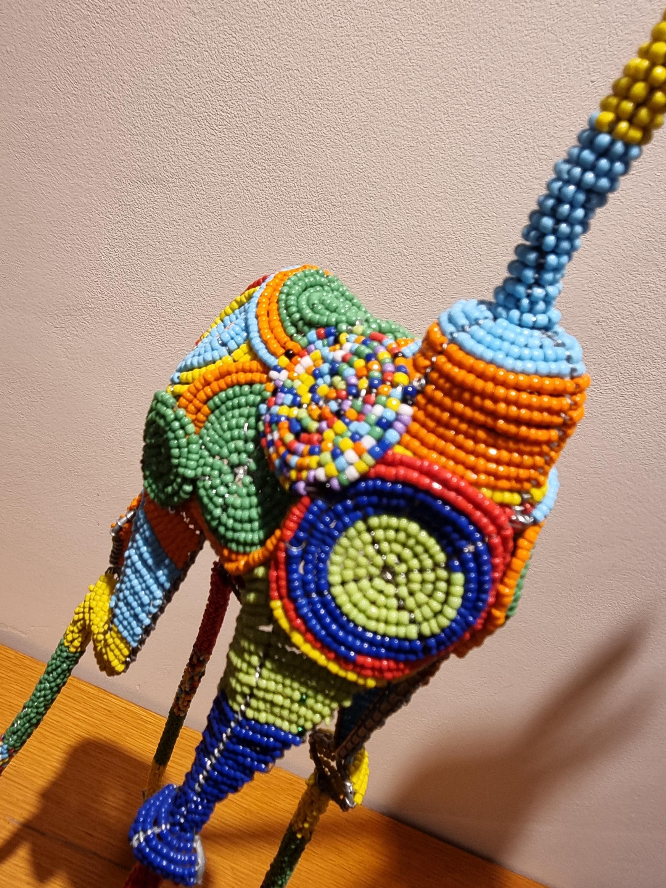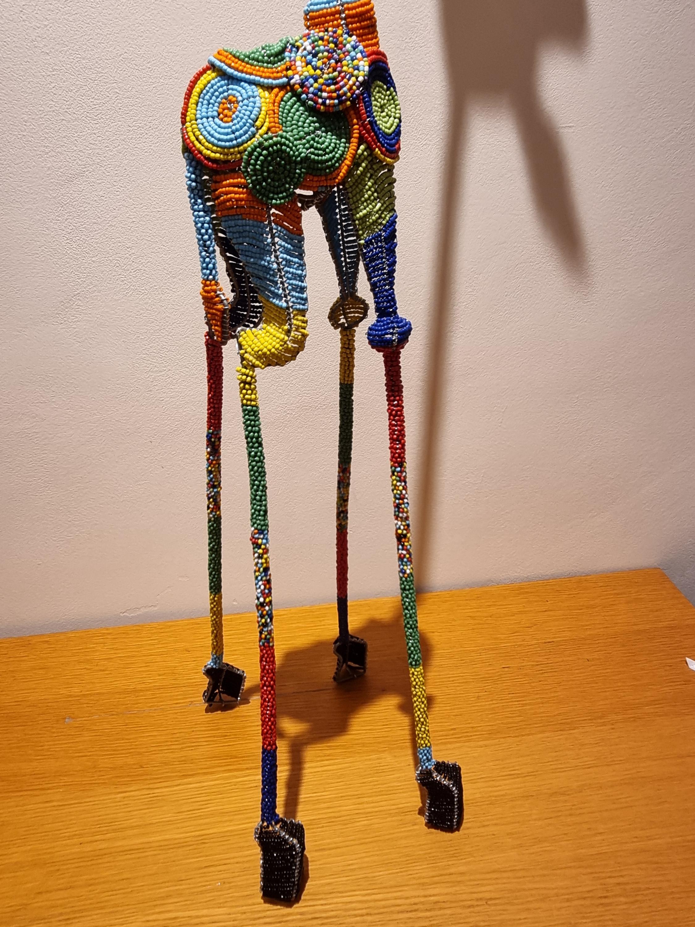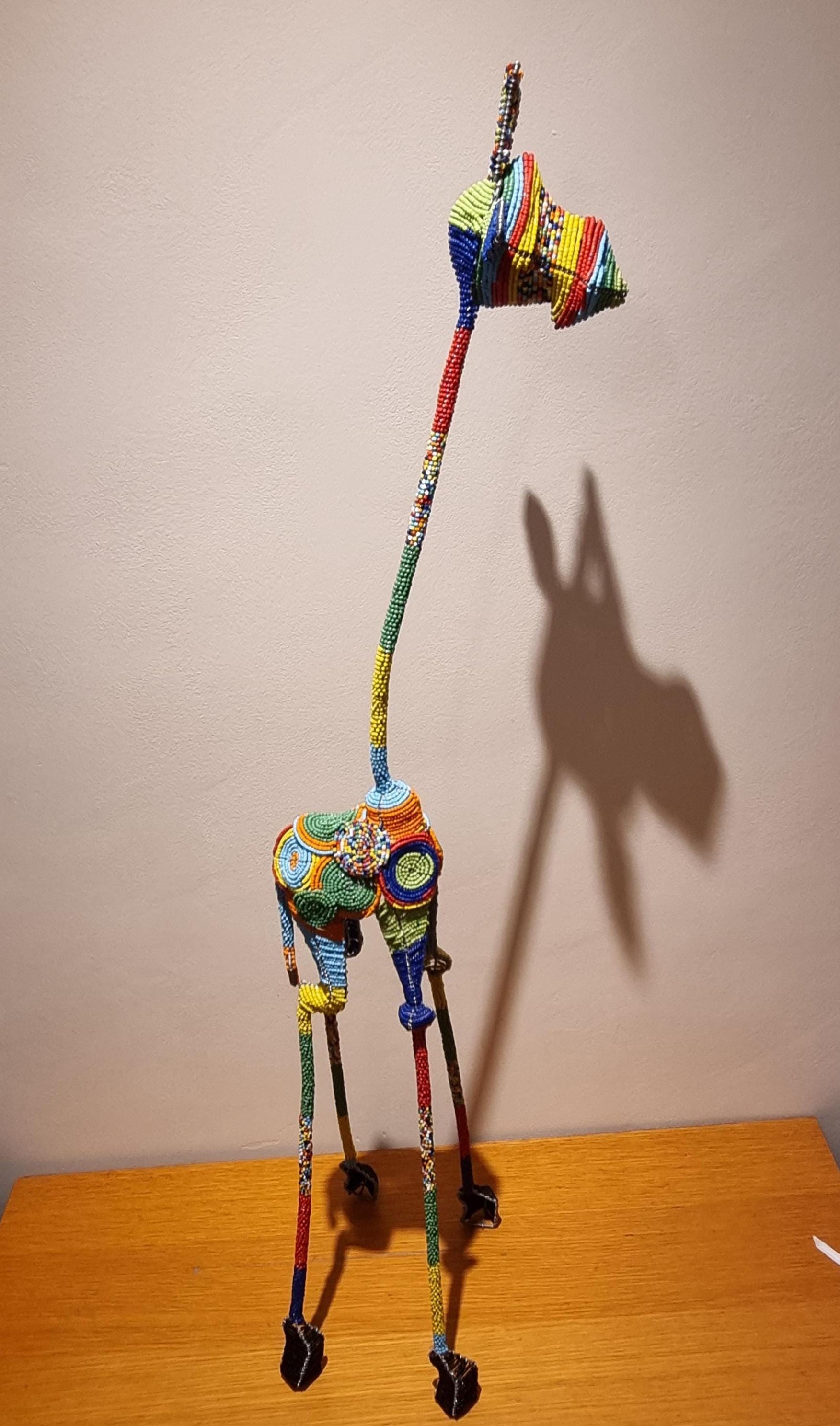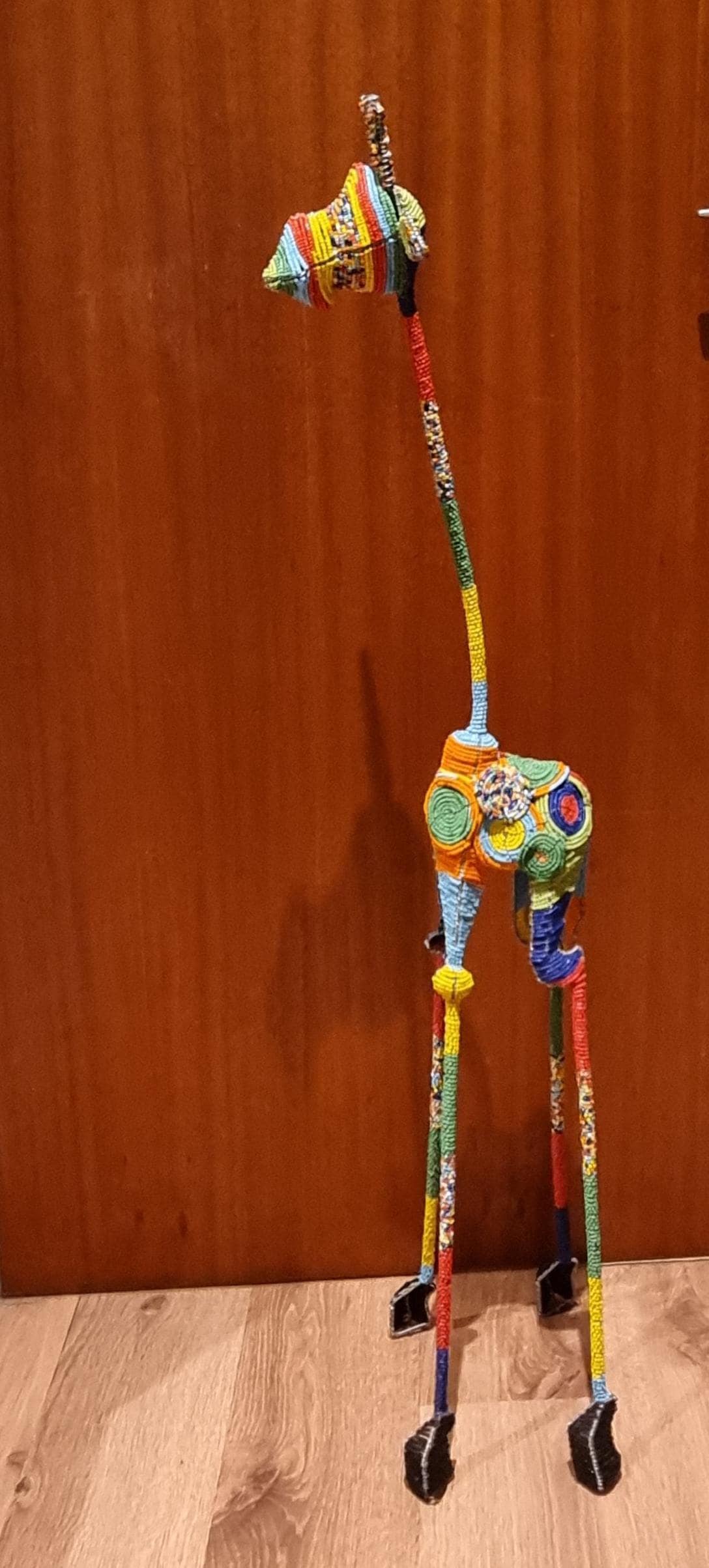 Bring the spirit of Africa into your home with this extraordinary handmade beaded giraffe sculpture – a rare design featuring vibrant concentric bead circles that make it truly one-of-a-kind. Unlike the more common solid-colour beaded giraffes, this piece celebrates artistic individuality with swirling, multicoloured circular beadwork across its body.