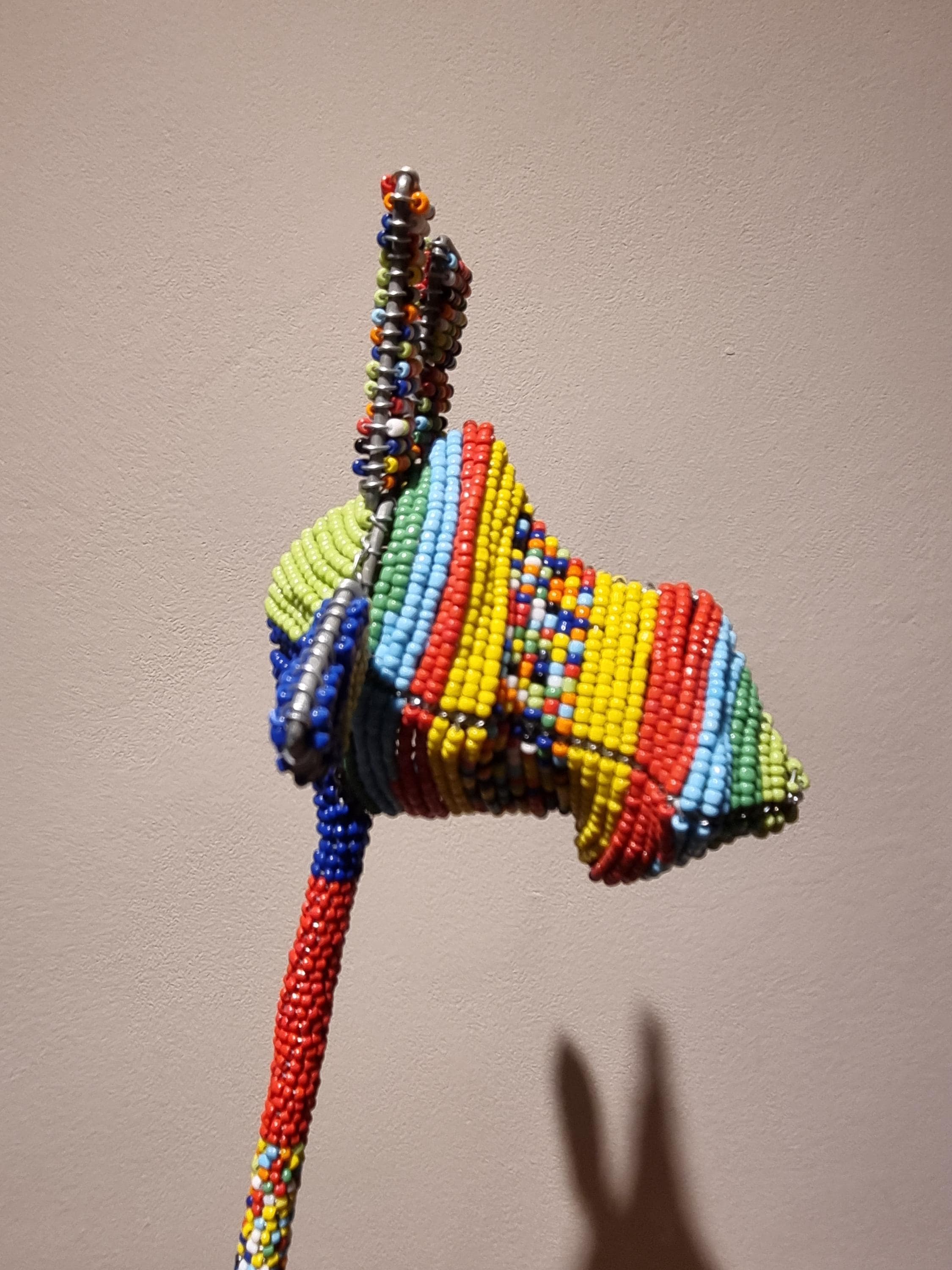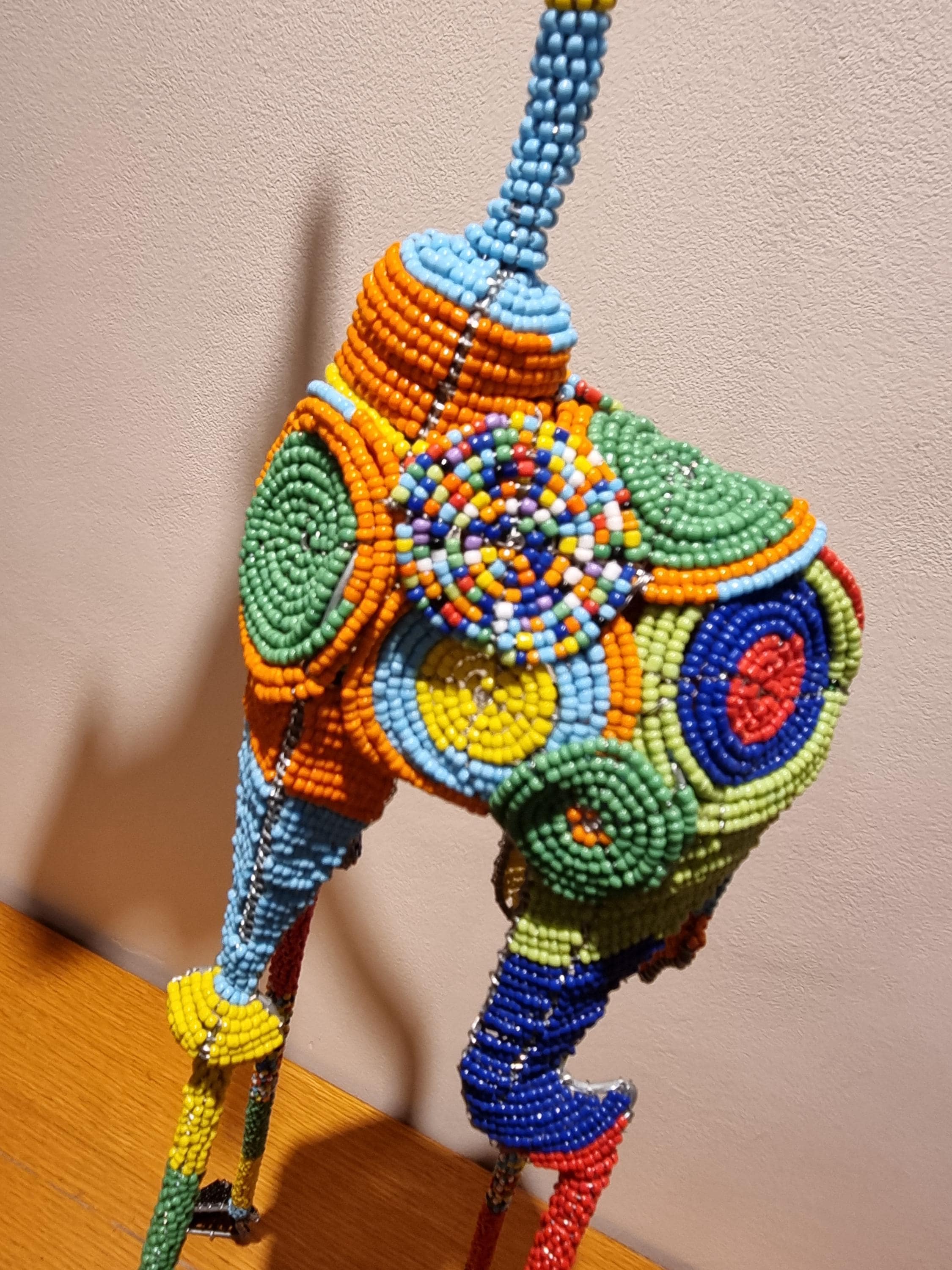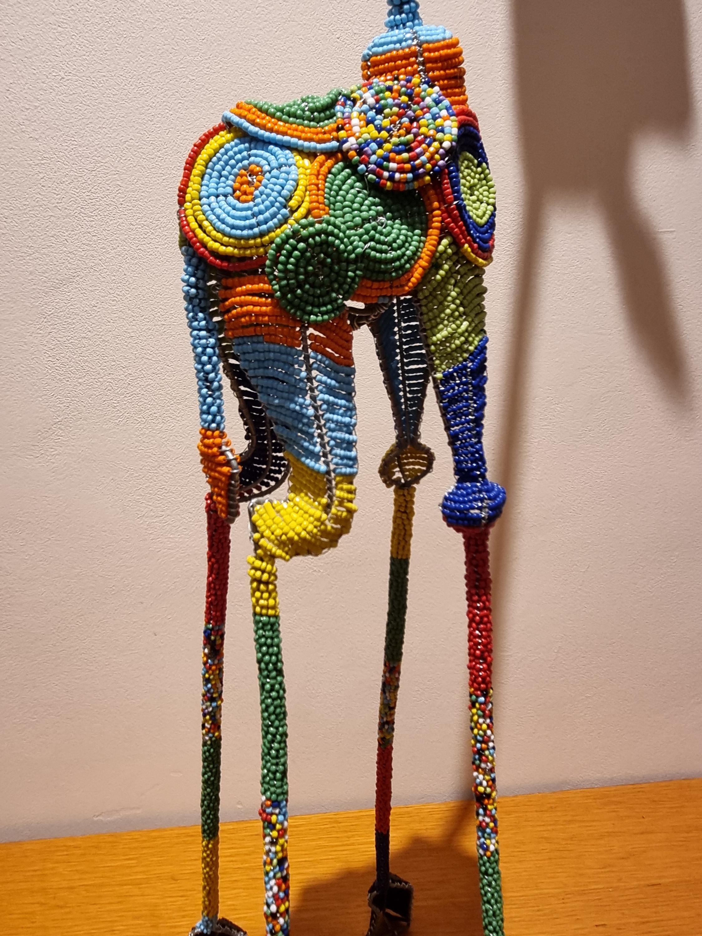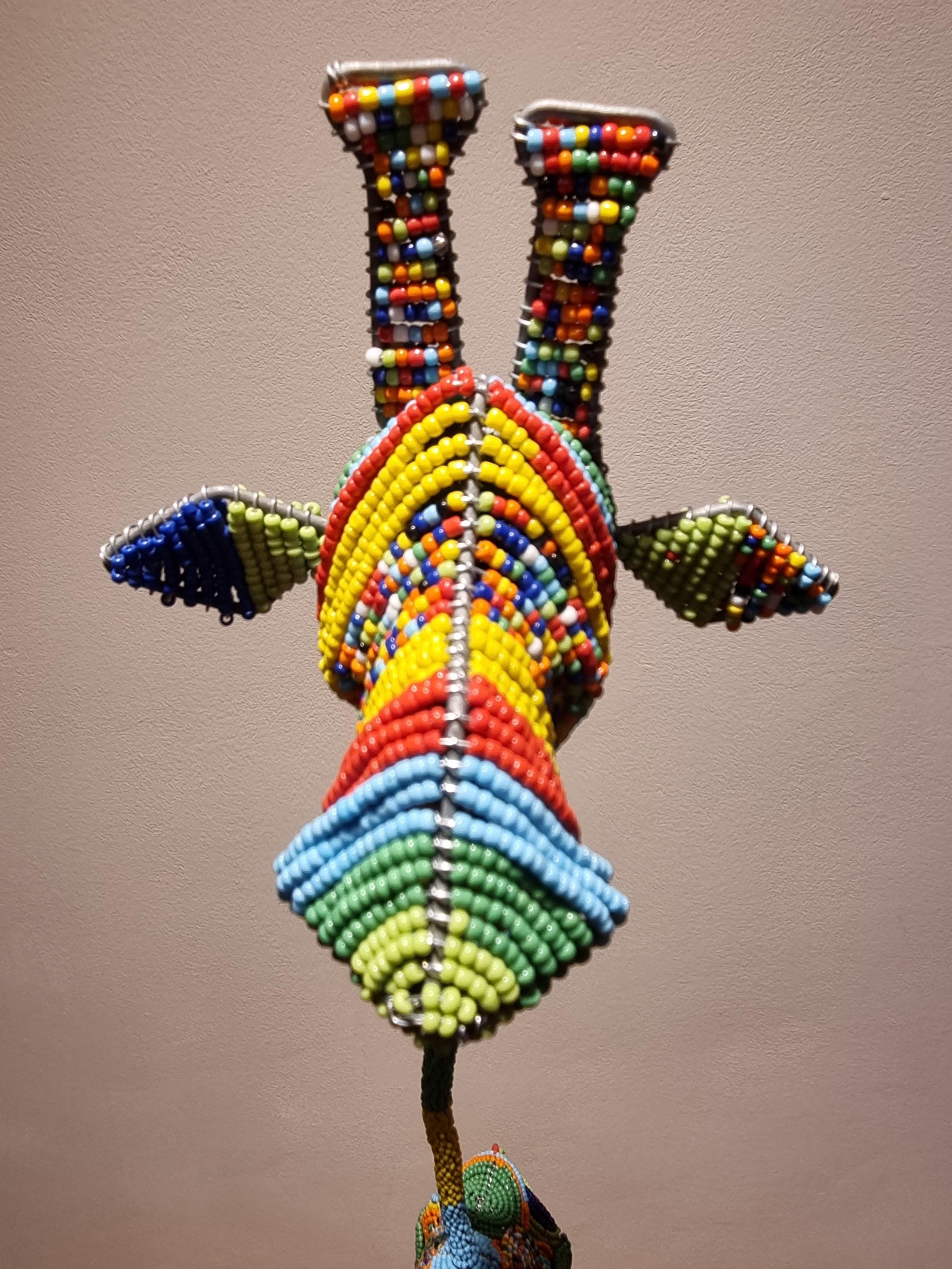 Bring the spirit of Africa into your home with this extraordinary handmade beaded giraffe sculpture – a rare design featuring vibrant concentric bead circles that make it truly one-of-a-kind. Unlike the more common solid-colour beaded giraffes, this piece celebrates artistic individuality with swirling, multicoloured circular beadwork across its body.
