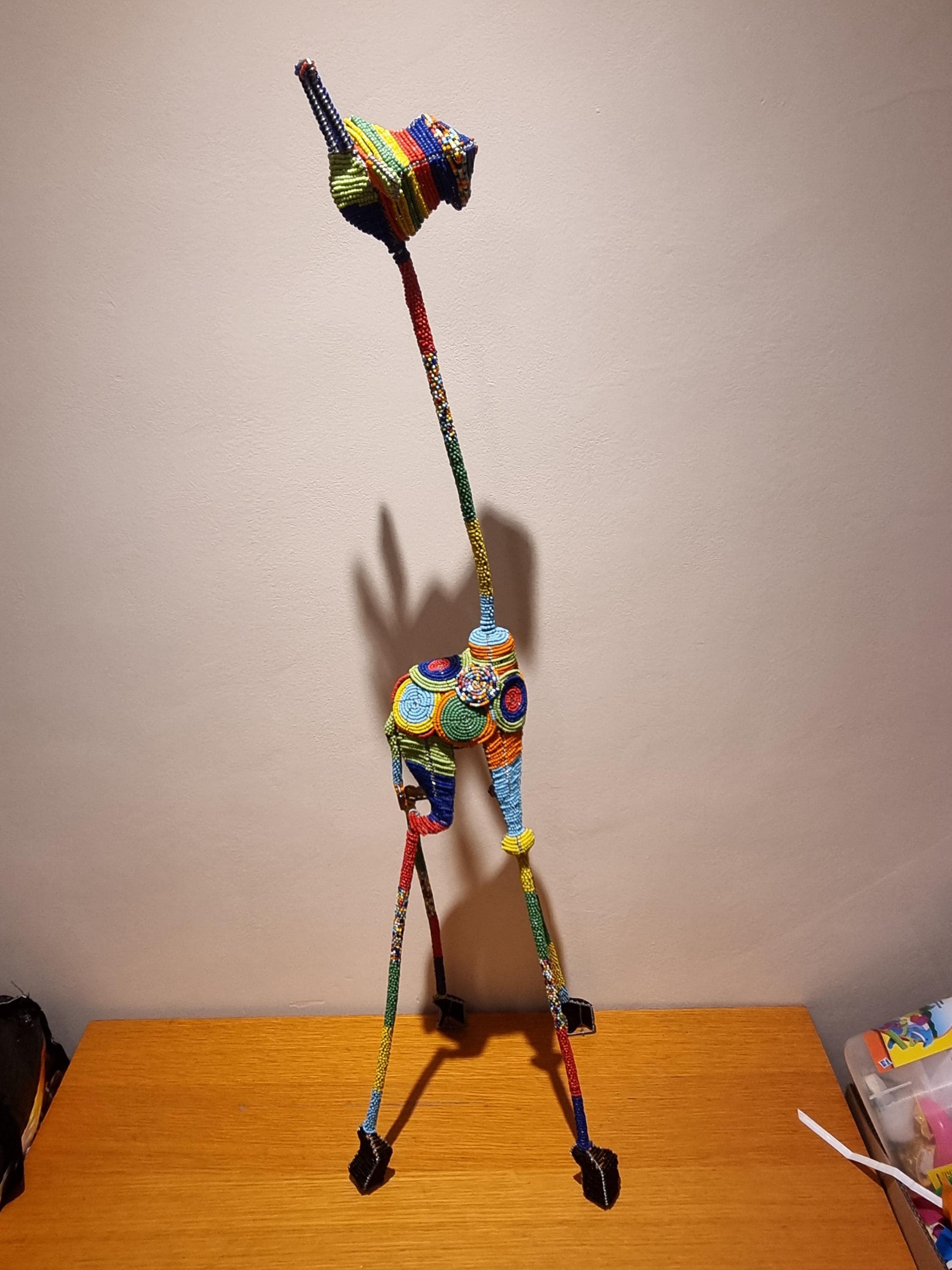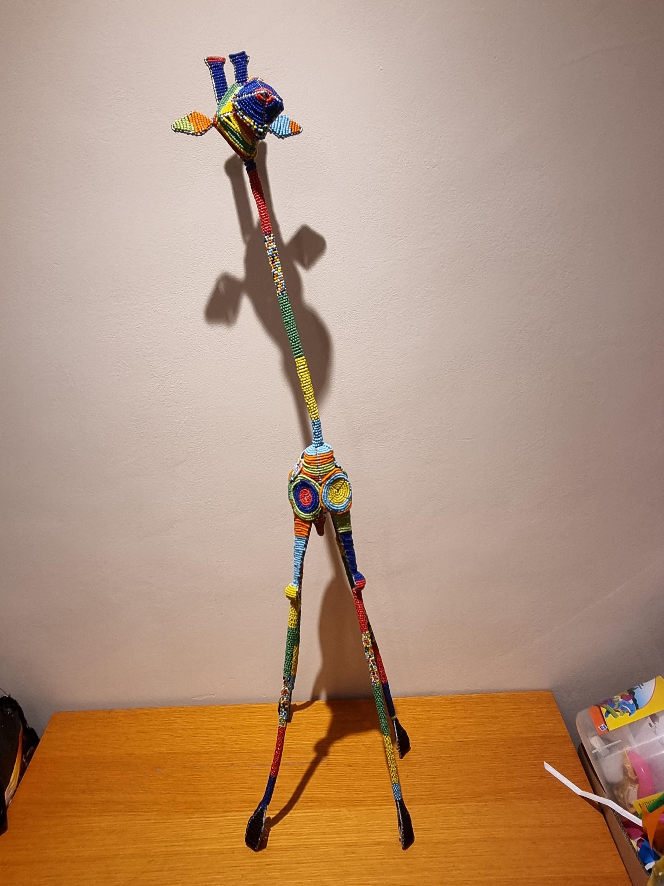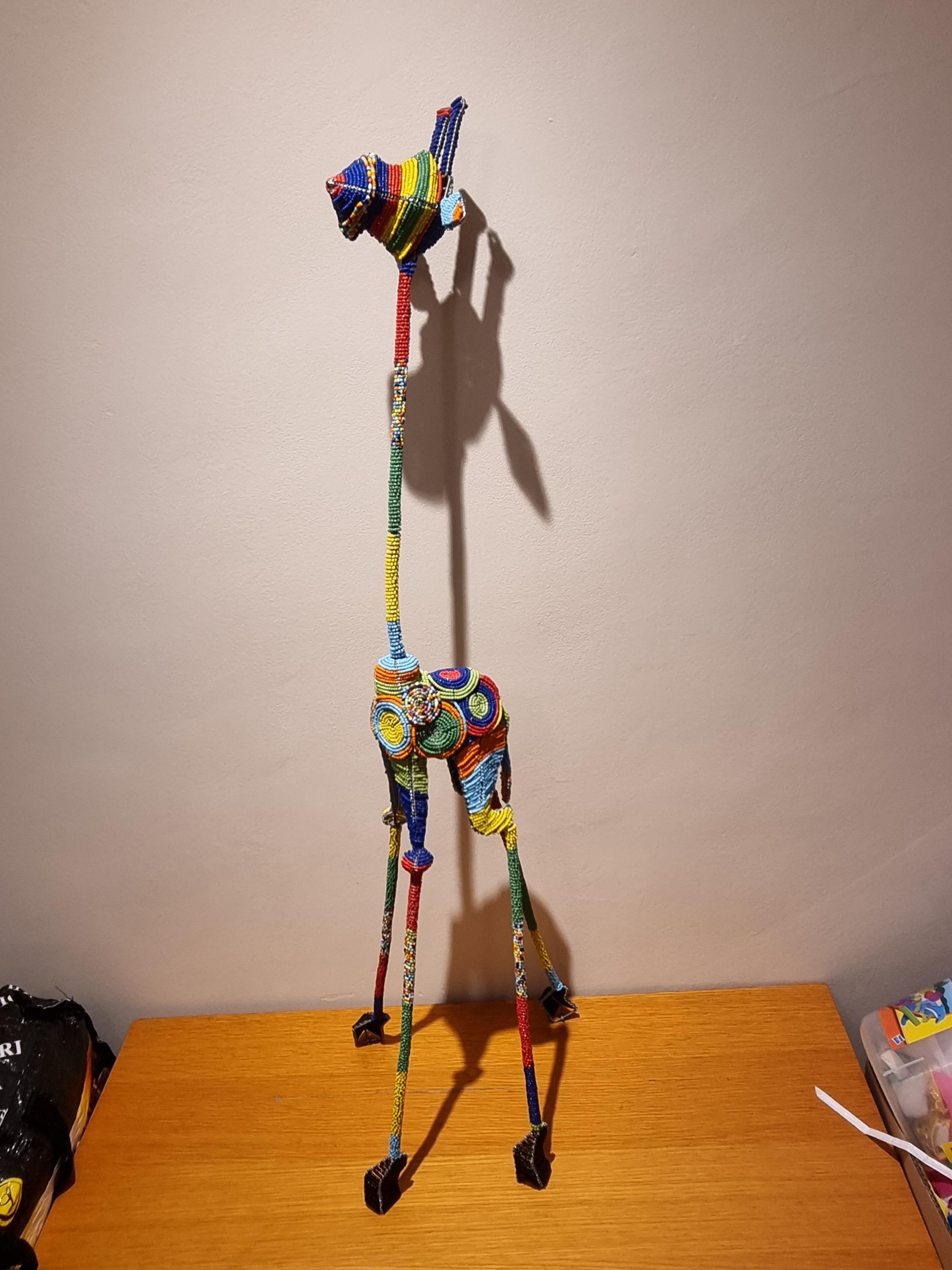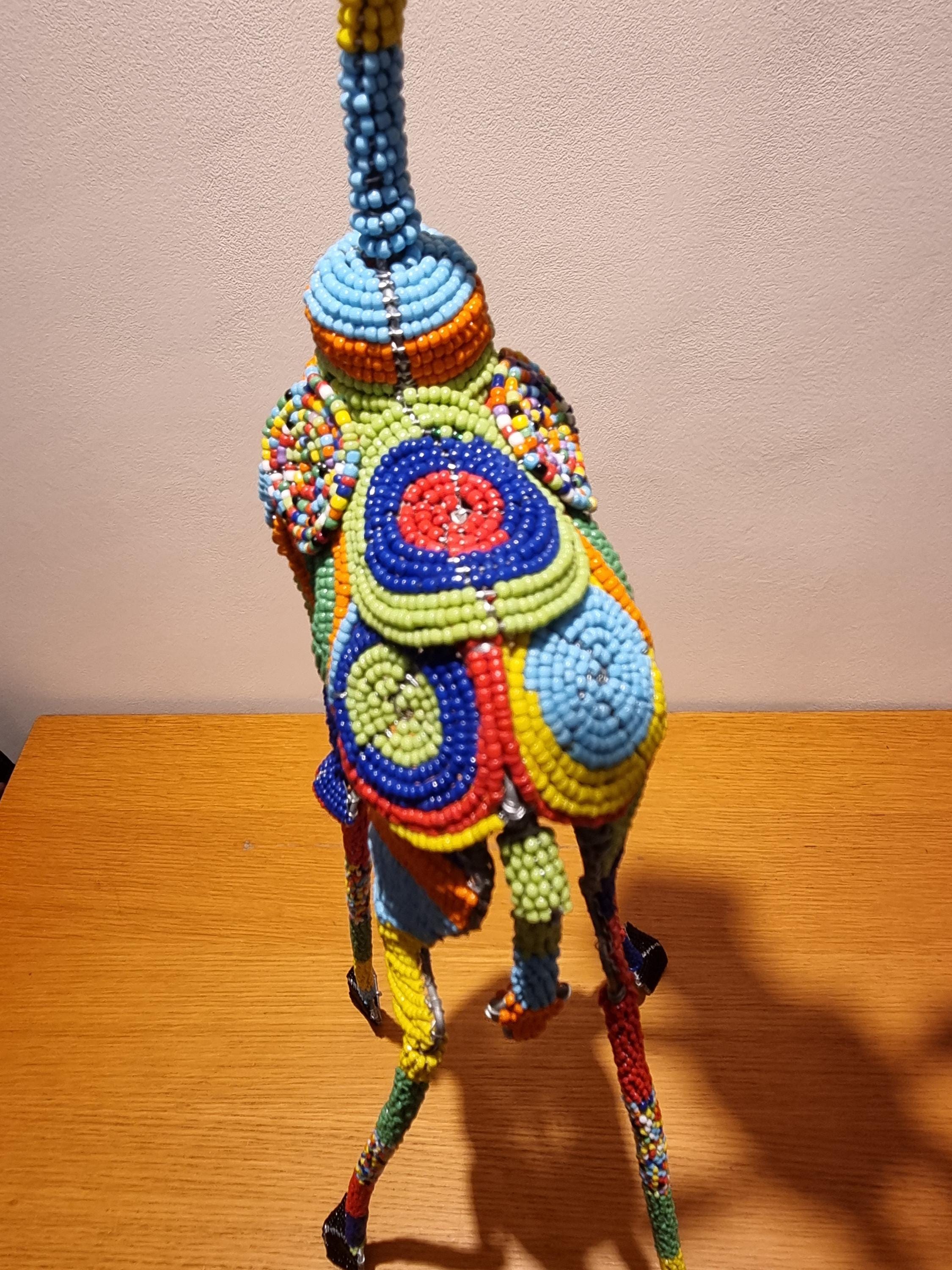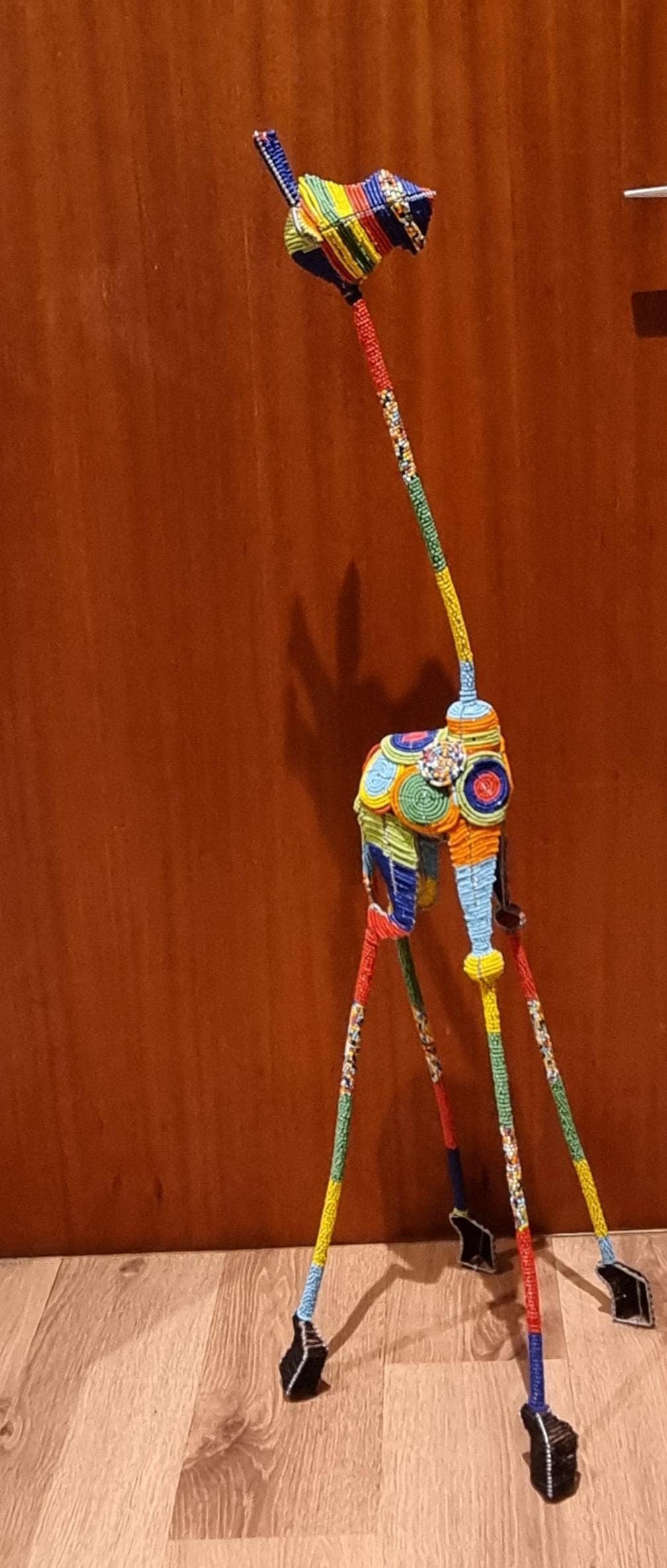 Bring the spirit of Africa into your home with this extraordinary handmade beaded giraffe sculpture – a rare design featuring vibrant concentric bead circles that make it truly one-of-a-kind. Unlike the more common solid-colour beaded giraffes, this piece celebrates artistic individuality with swirling, multicoloured circular beadwork across its body.