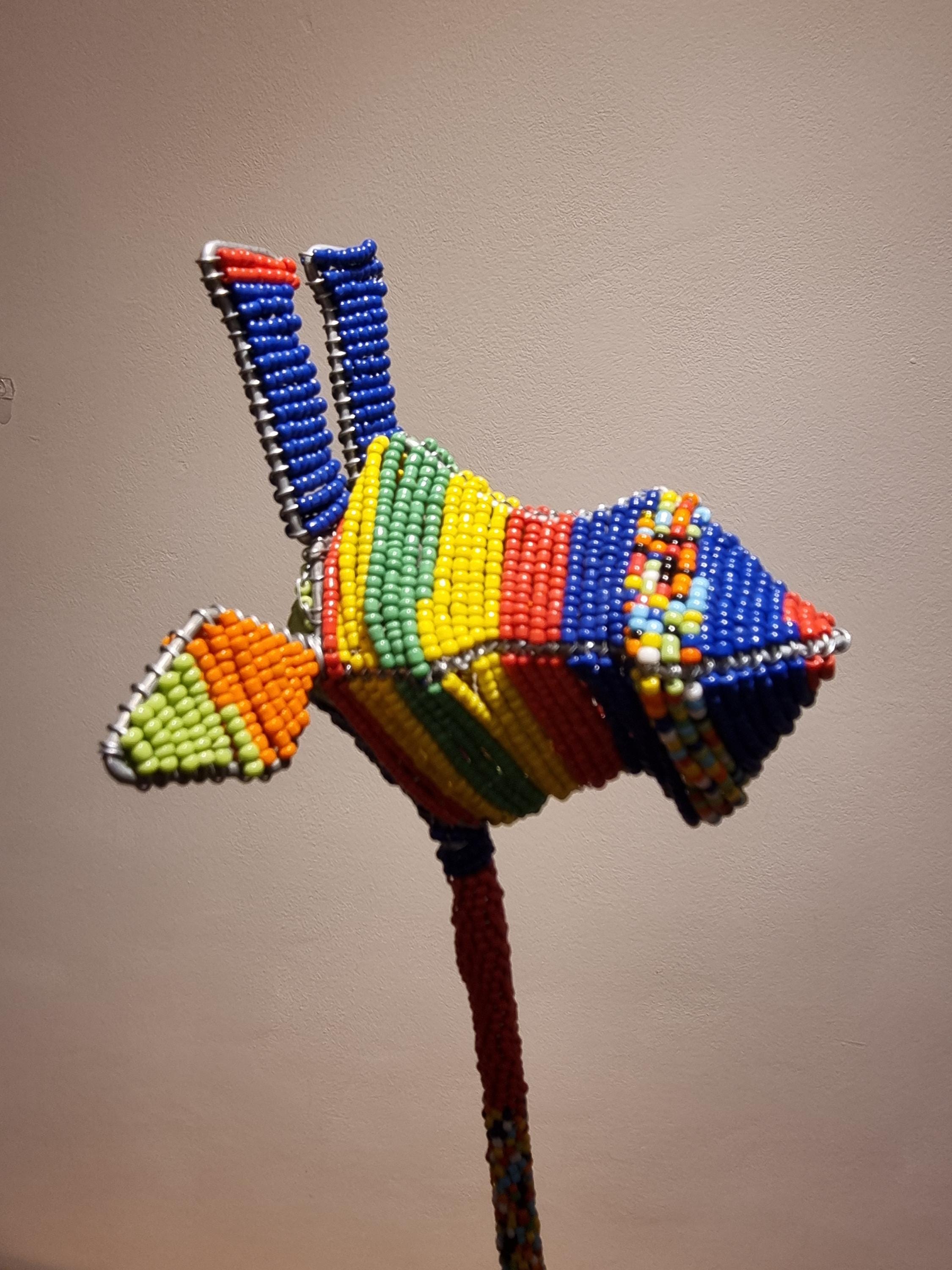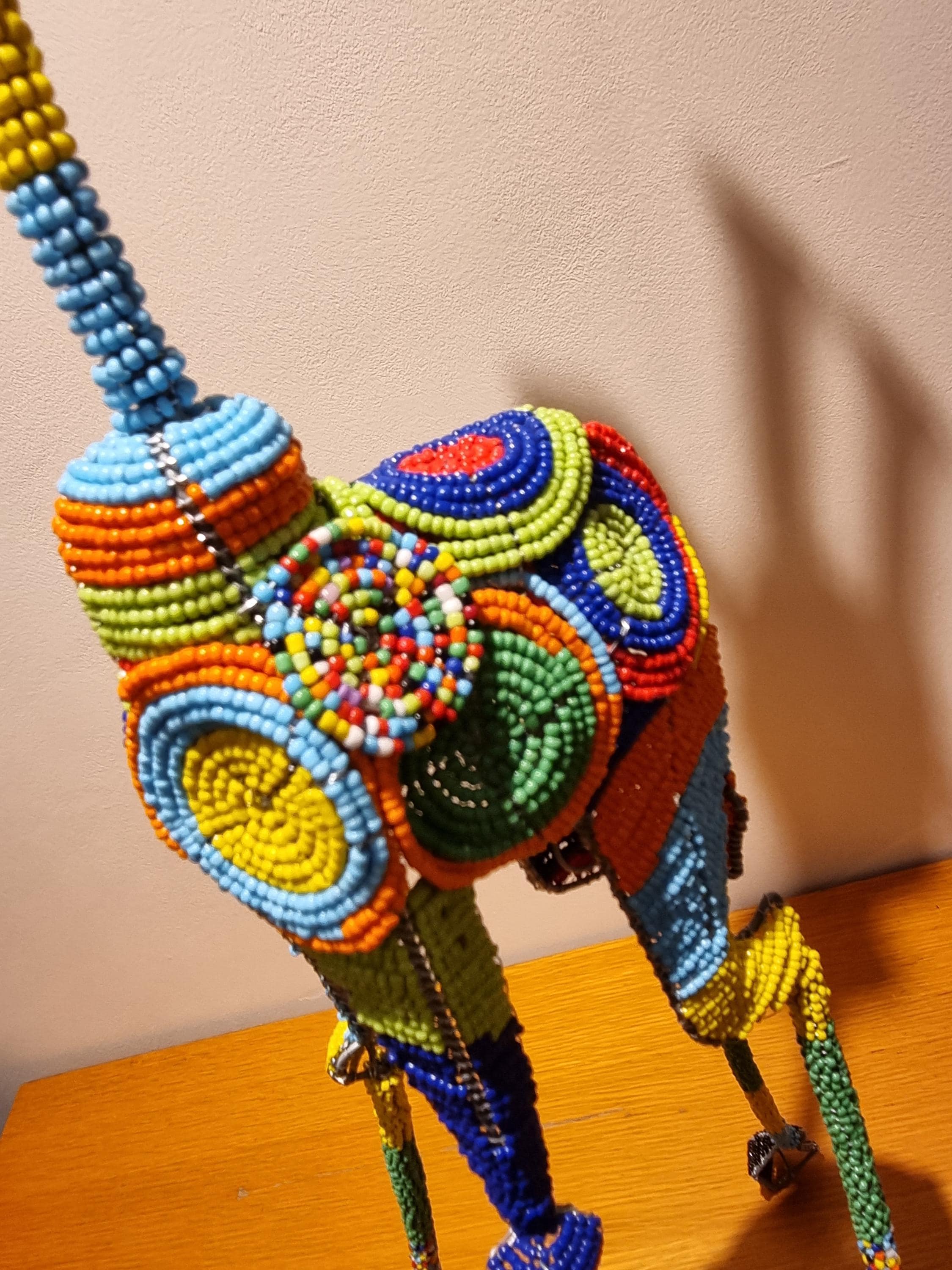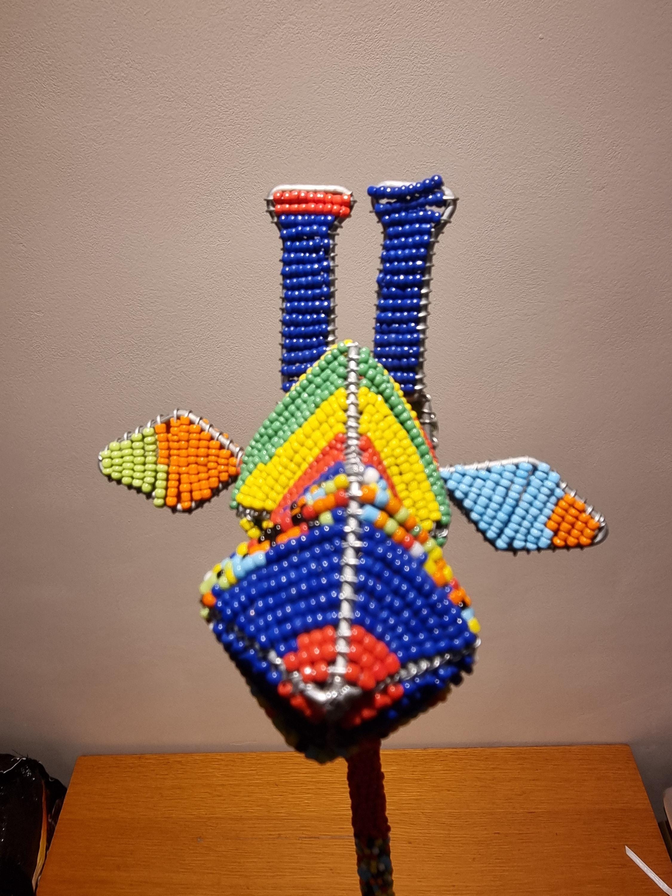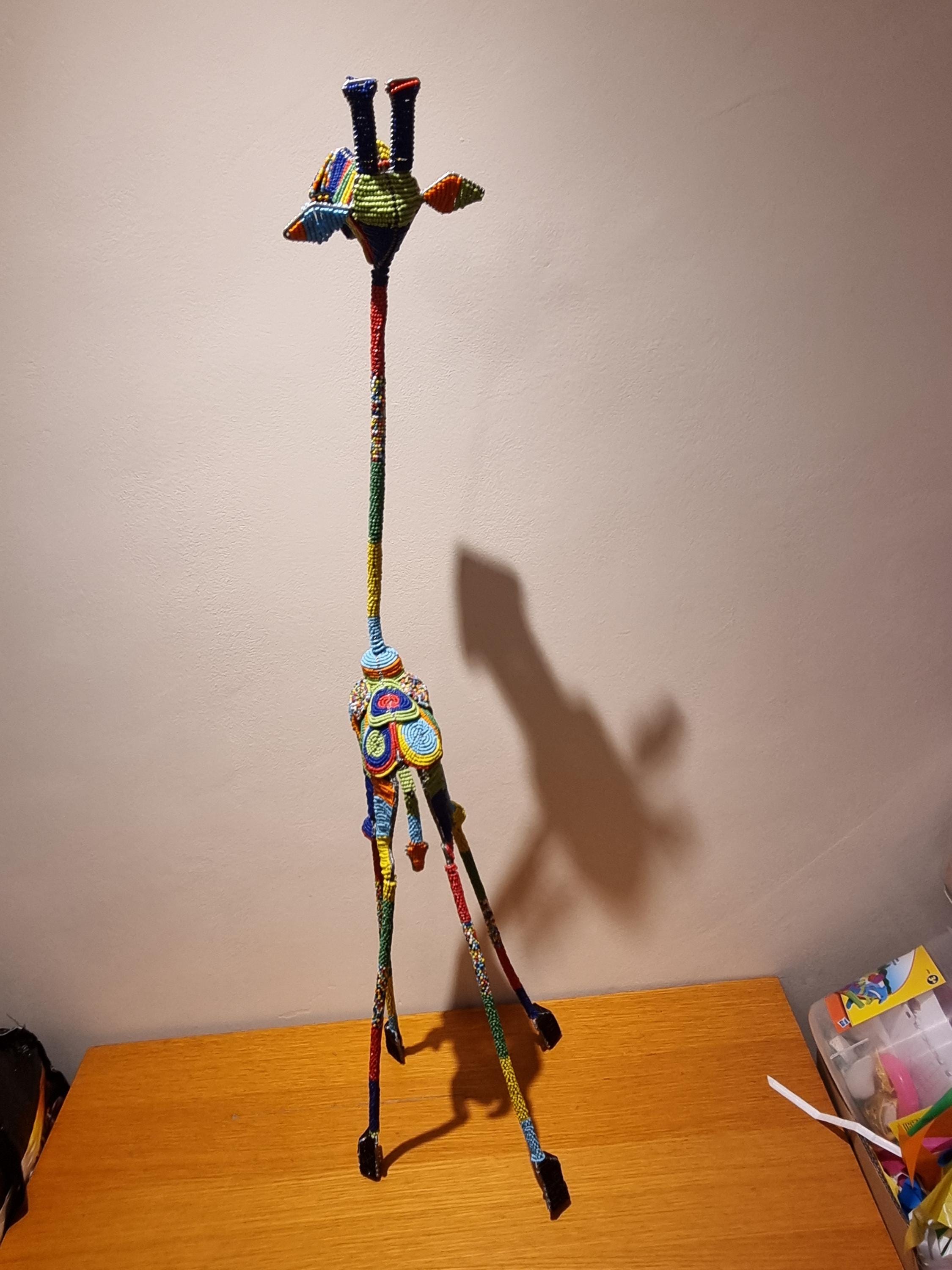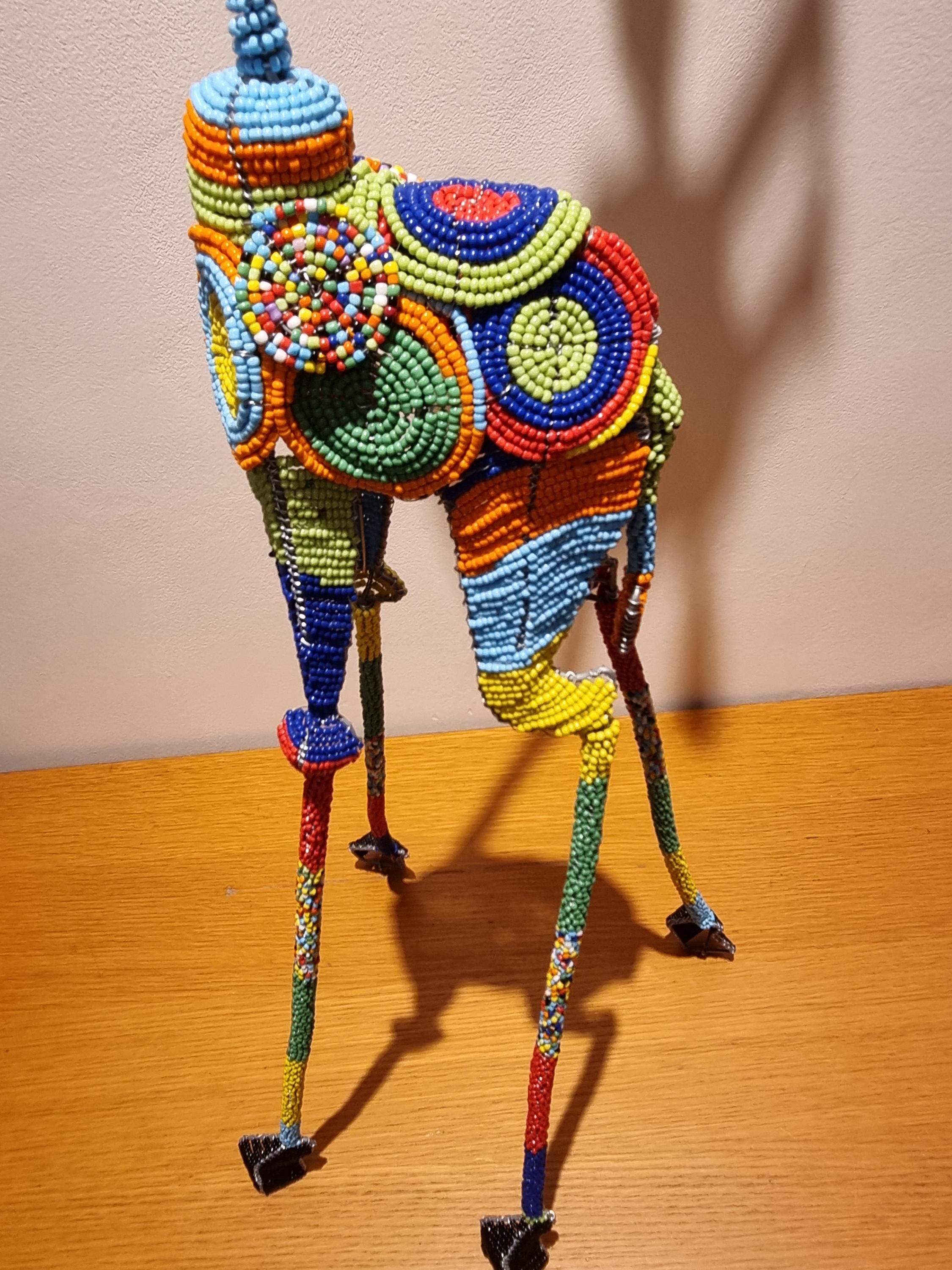 Bring the spirit of Africa into your home with this extraordinary handmade beaded giraffe sculpture – a rare design featuring vibrant concentric bead circles that make it truly one-of-a-kind. Unlike the more common solid-colour beaded giraffes, this piece celebrates artistic individuality with swirling, multicoloured circular beadwork across its body.