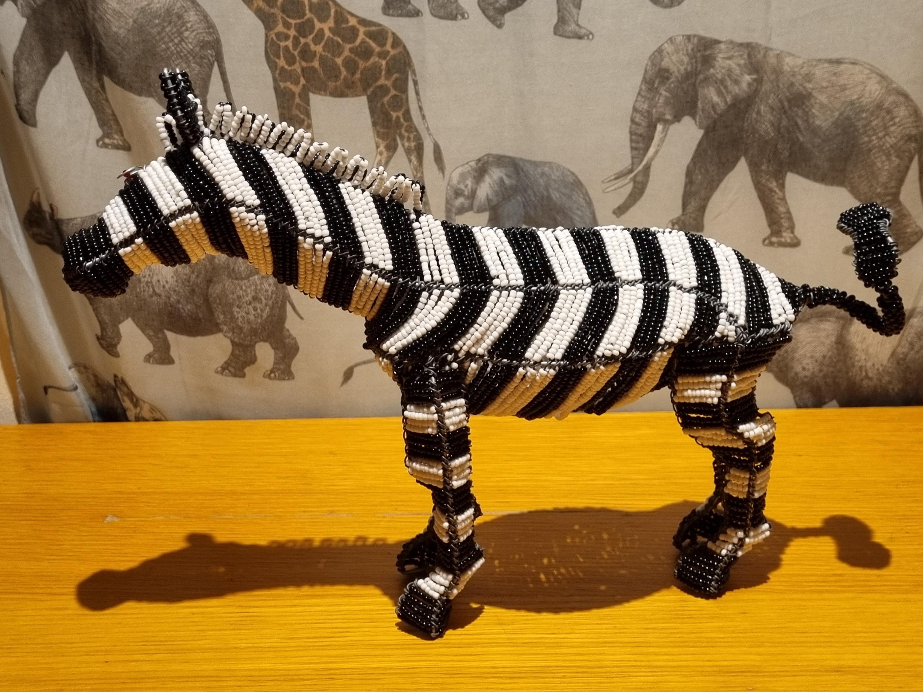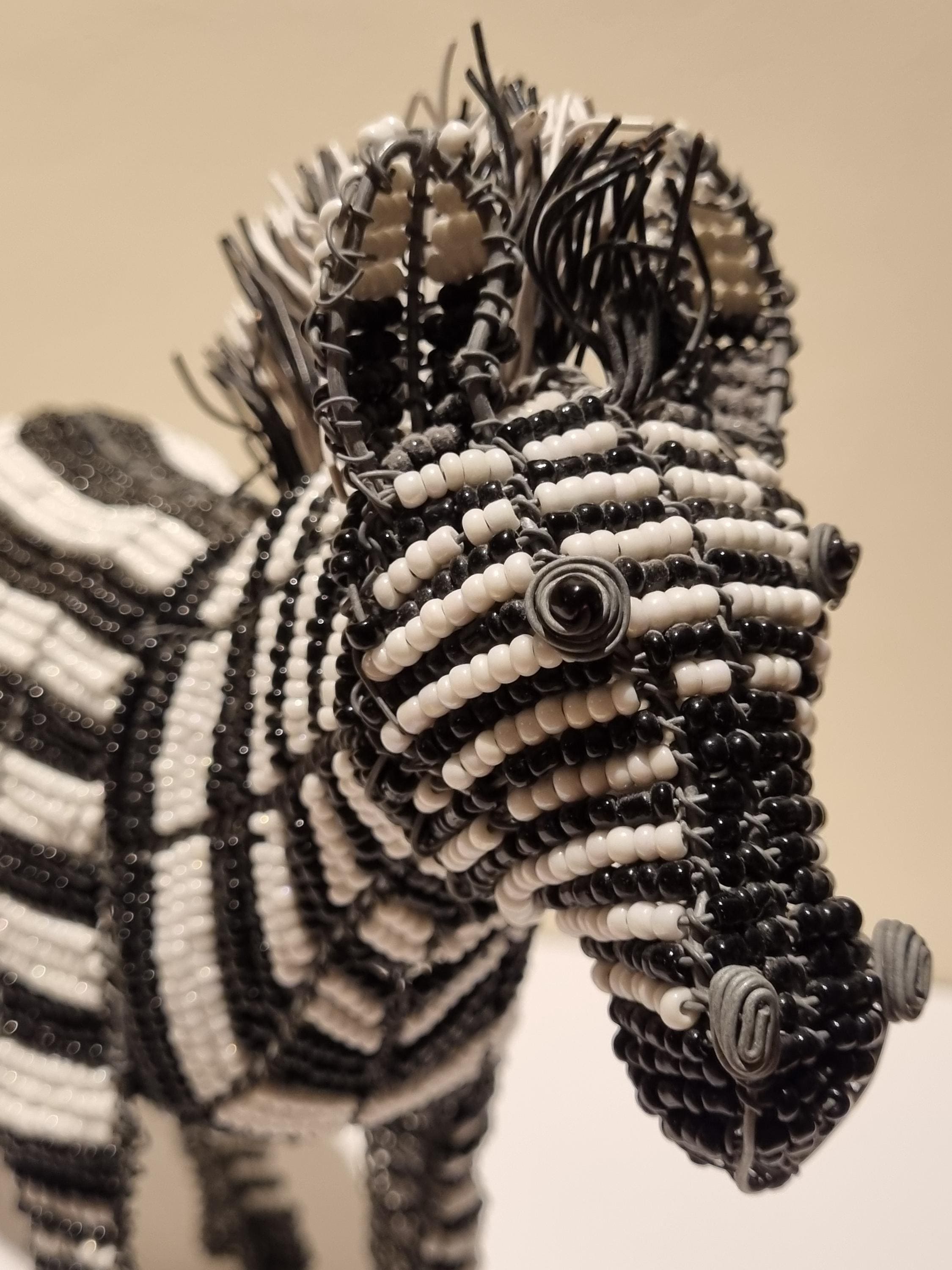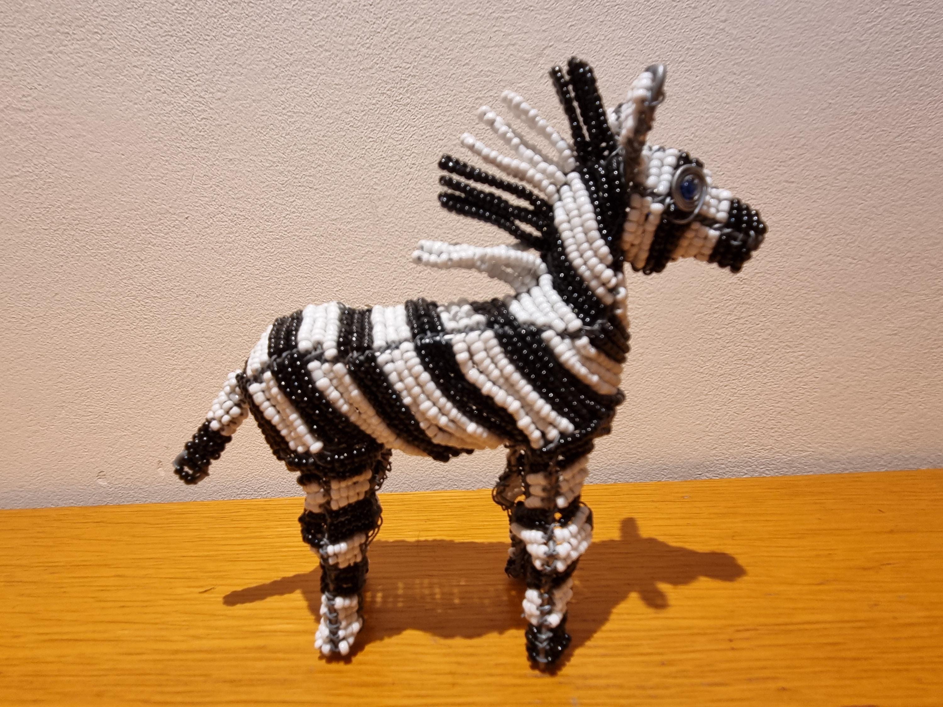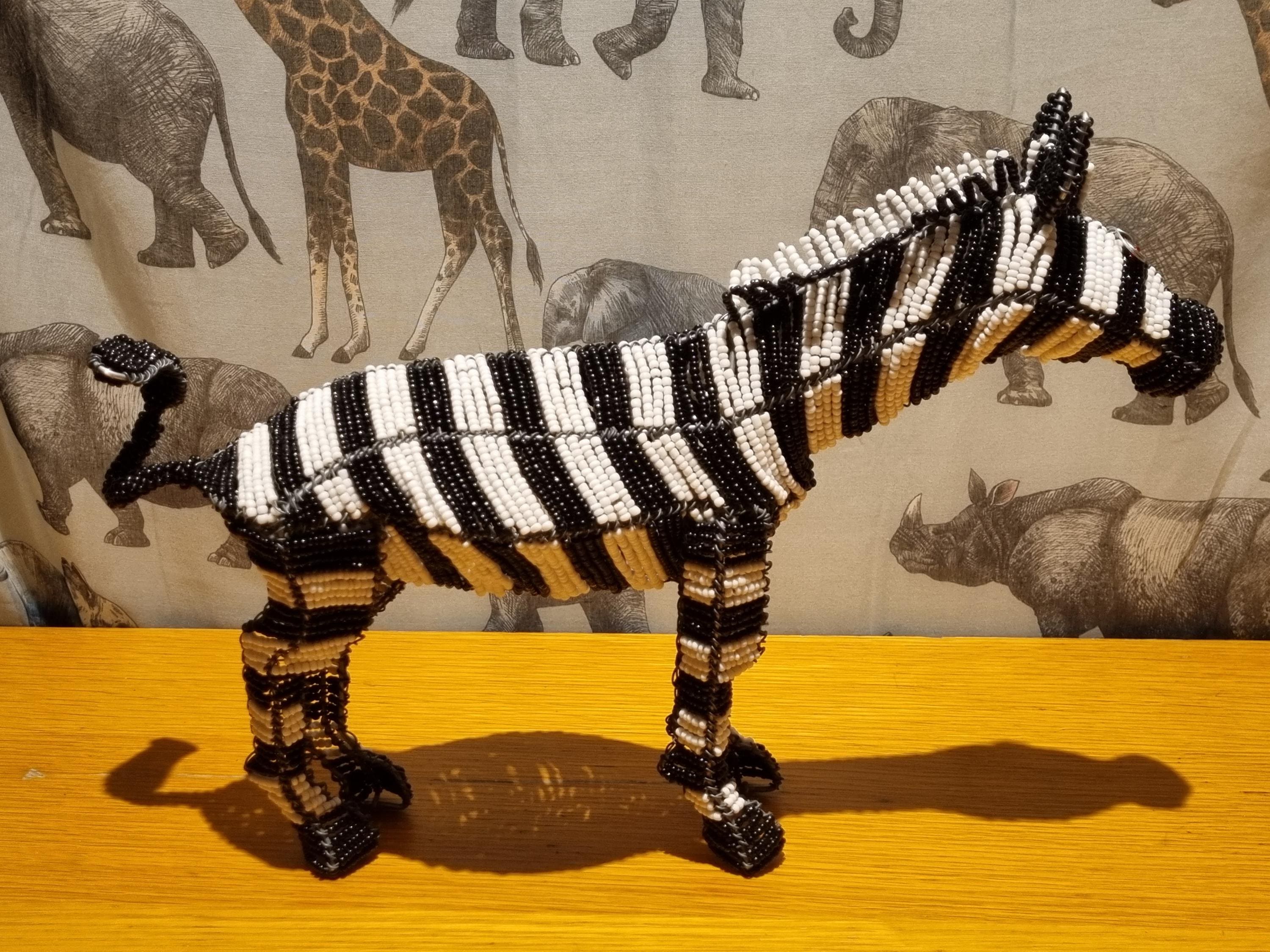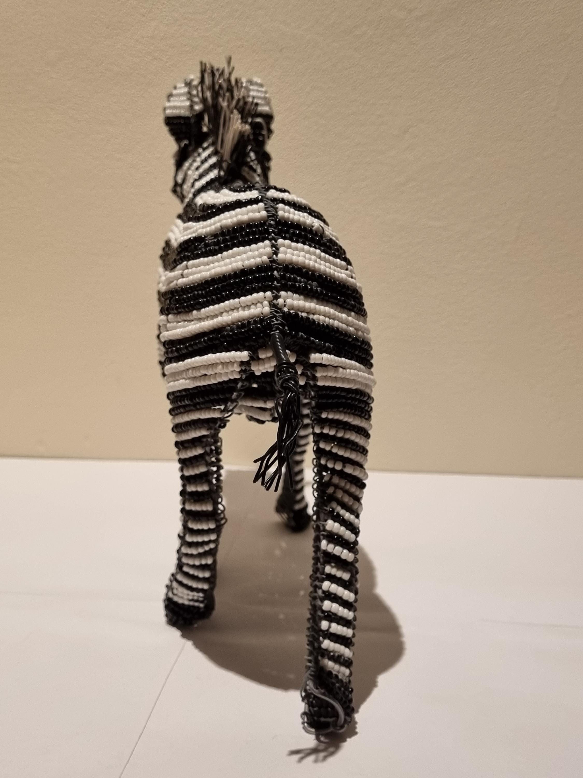 Bring the wild beauty of Africa into your home with this handcrafted zebra sculpture – a stunning fusion of tradition, artistry, and modern decor. Made in South Africa by skilled artisans using galvanized wire and premium black & white glass beads, this zebra is a true celebration of craftsmanship.