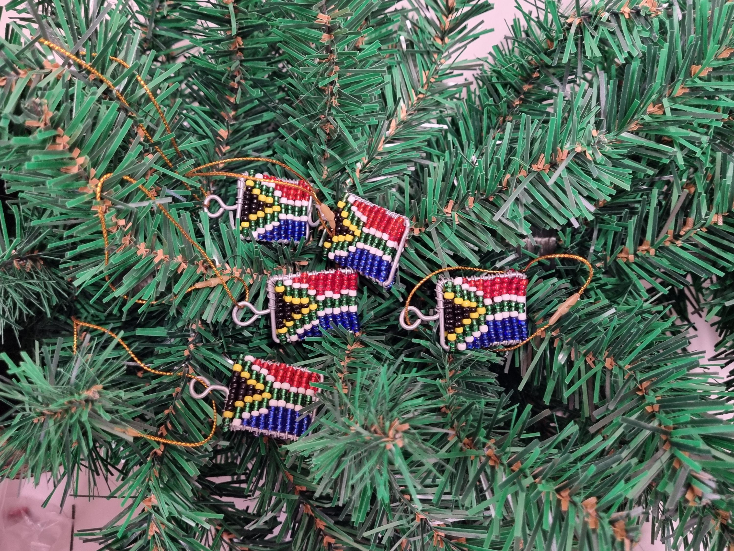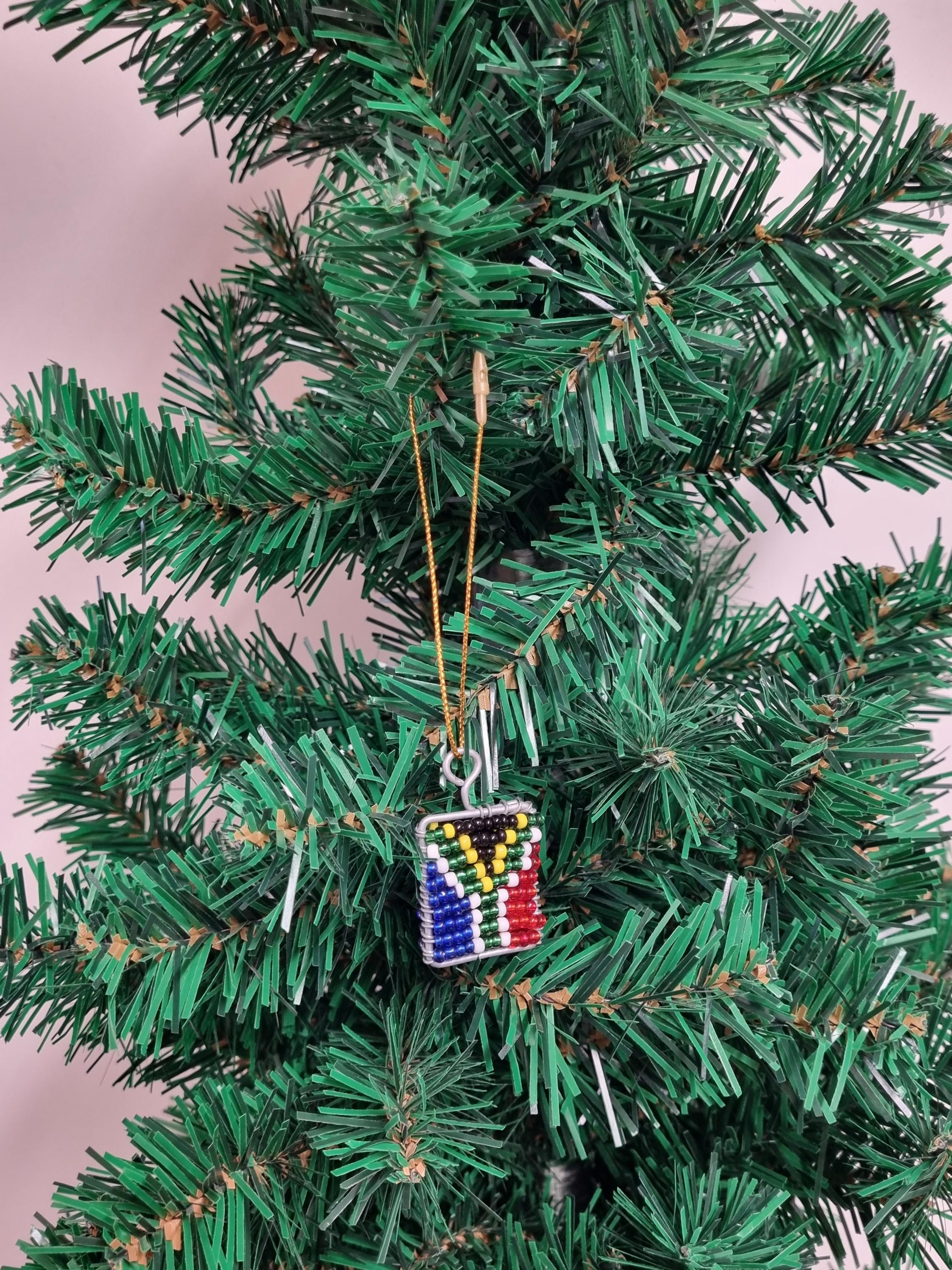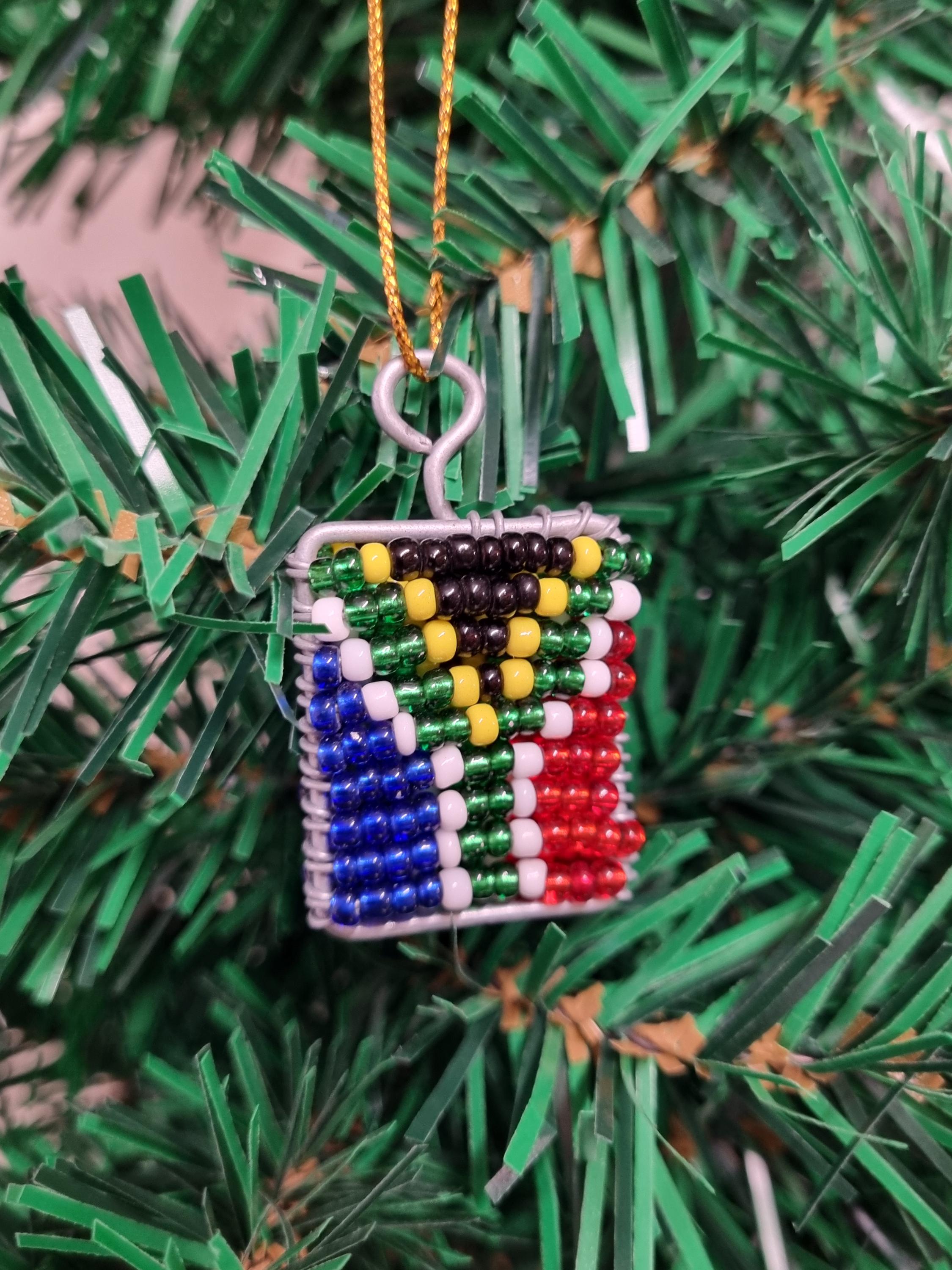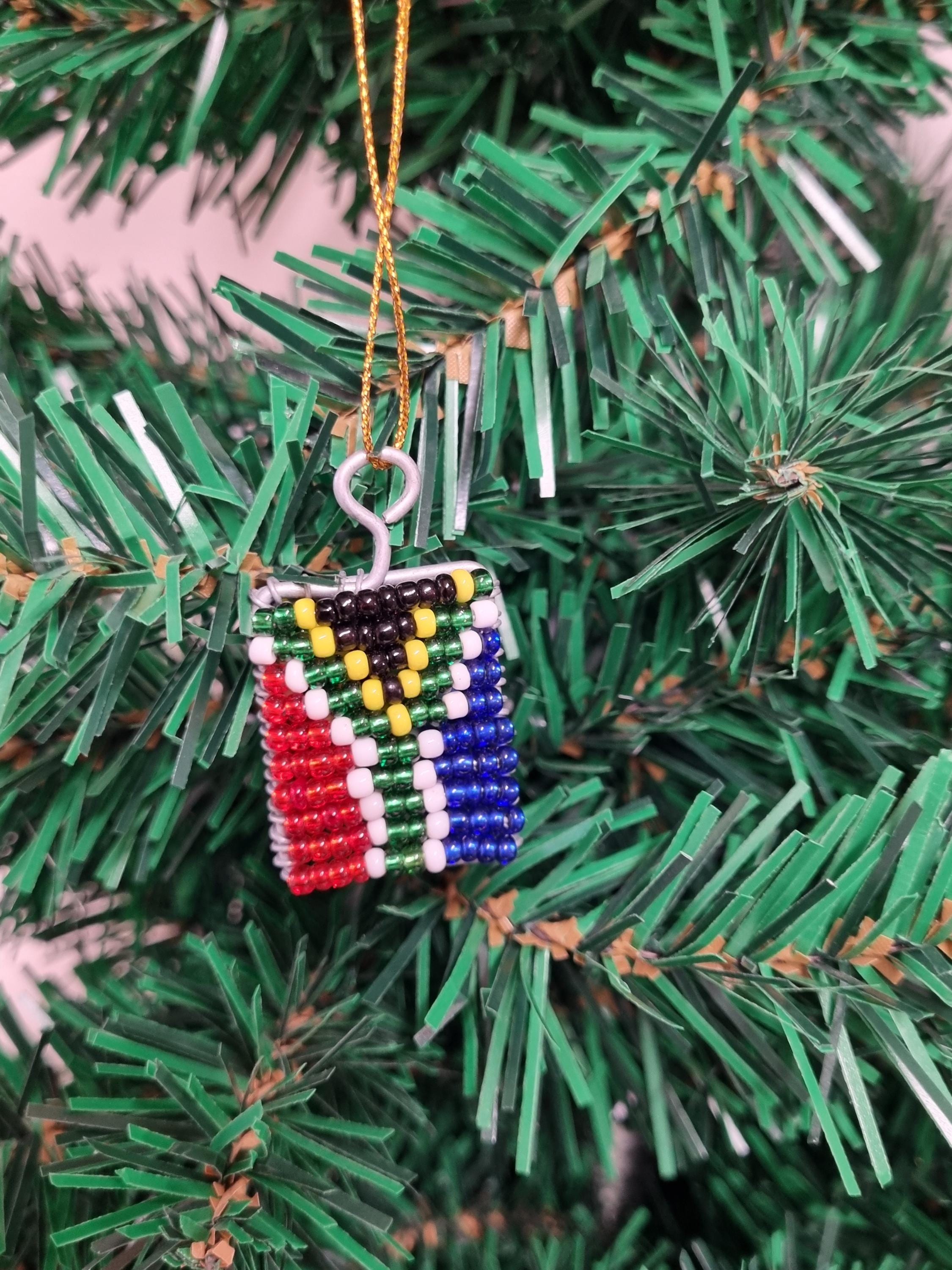 Christmas Tree Decoration - Unique Beaded South African Flag - Handmade in South AfricaEach item is handmade from beads and wire, making every piece unique. This can lead to slight imperfectionsMeasures: 4cm x 3cm x 0.5cm
