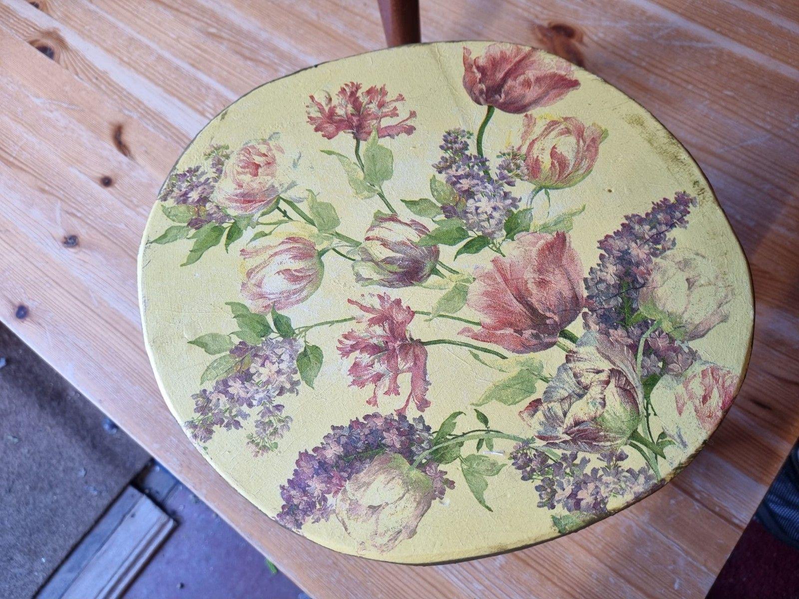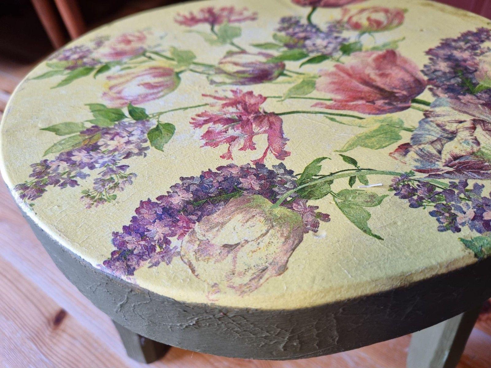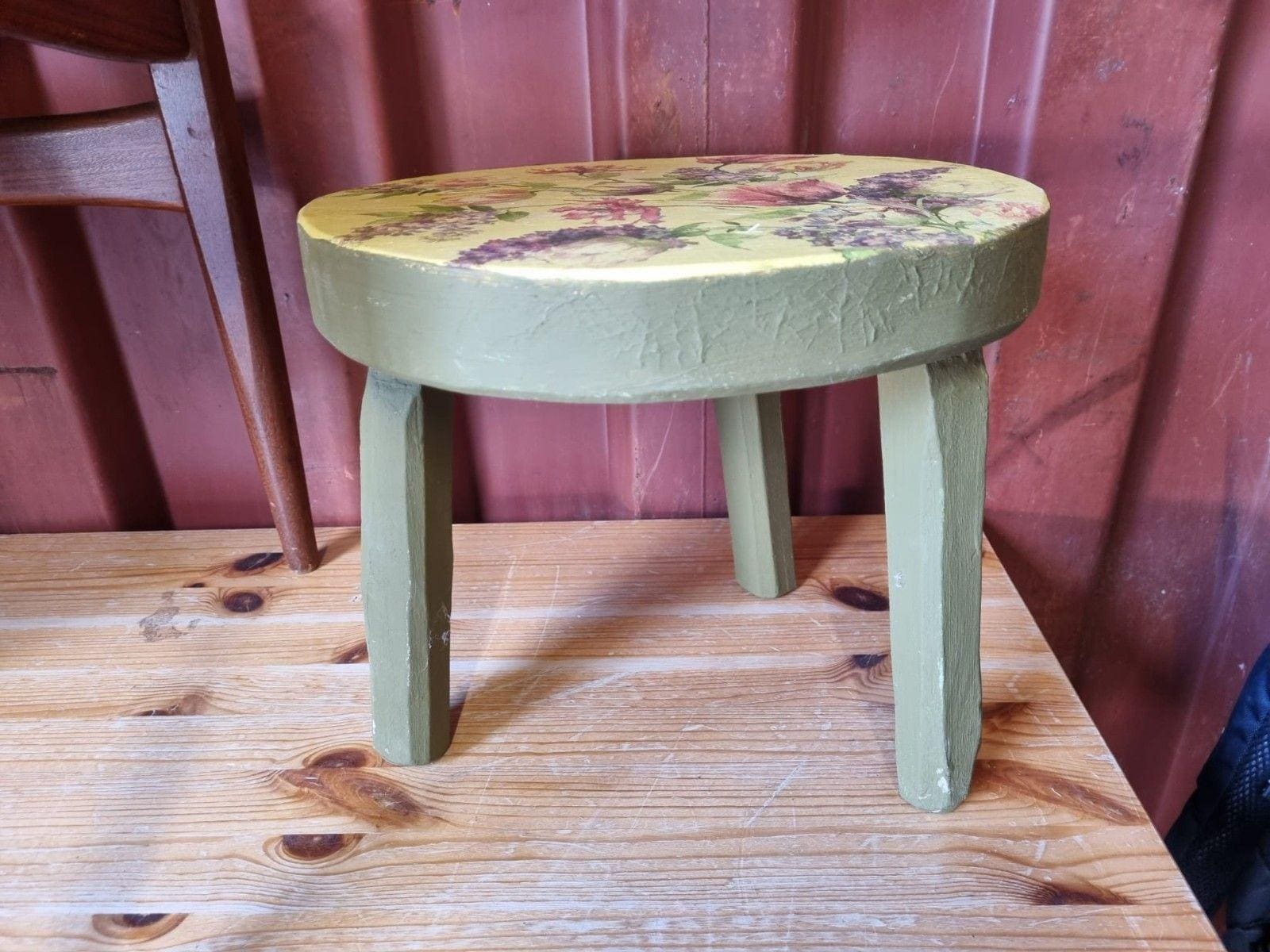 This vintage wood footstool features a round, floral design, perfect for adding a touch of cottage charm to any living space. The retro style and flower theme make it a unique and stylish addition to your home decor. Made from durable wood, this footstool is both functional and stylish, providing a comfortable option for propping up your feet or serving as a decorative piece. Whether used in a living room or bedroom, this footstool brings a touch of nostalgia and a sense of whimsy to your furniture collection.