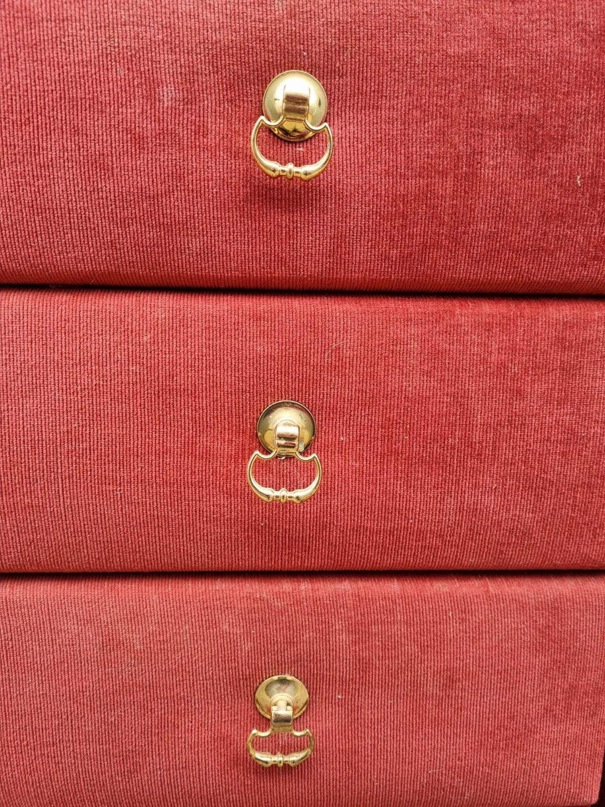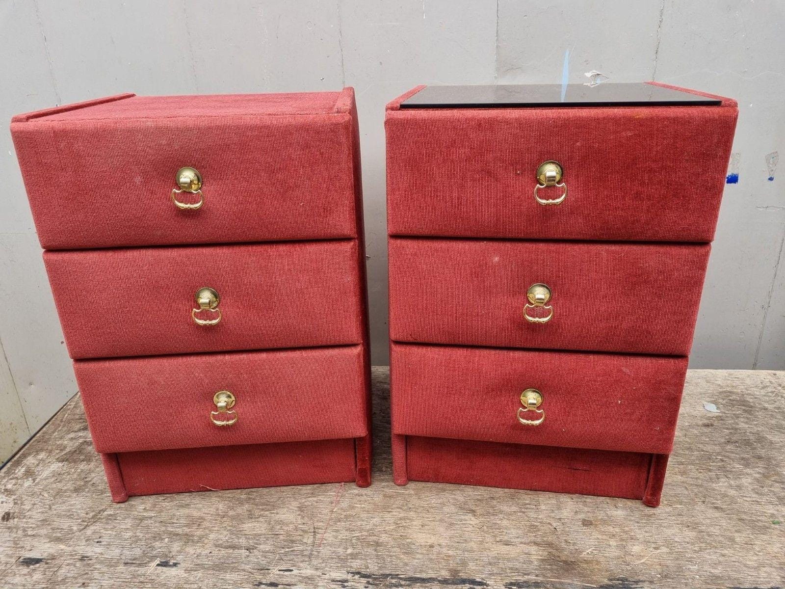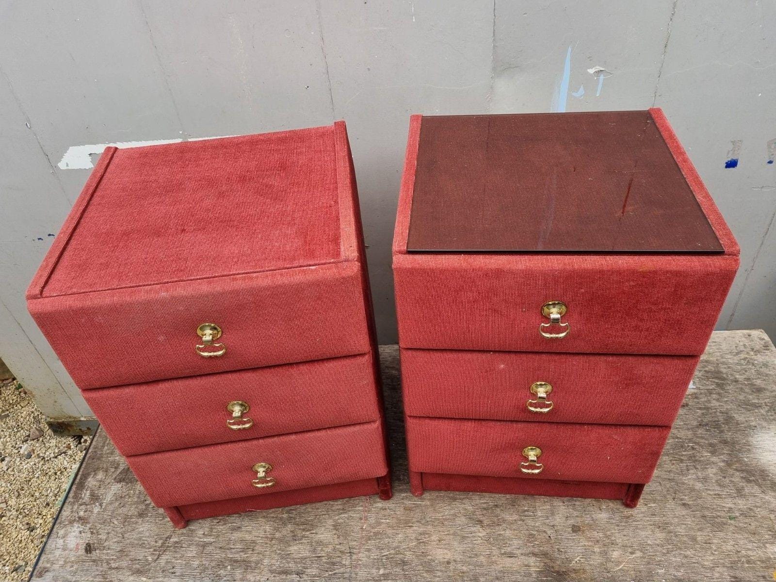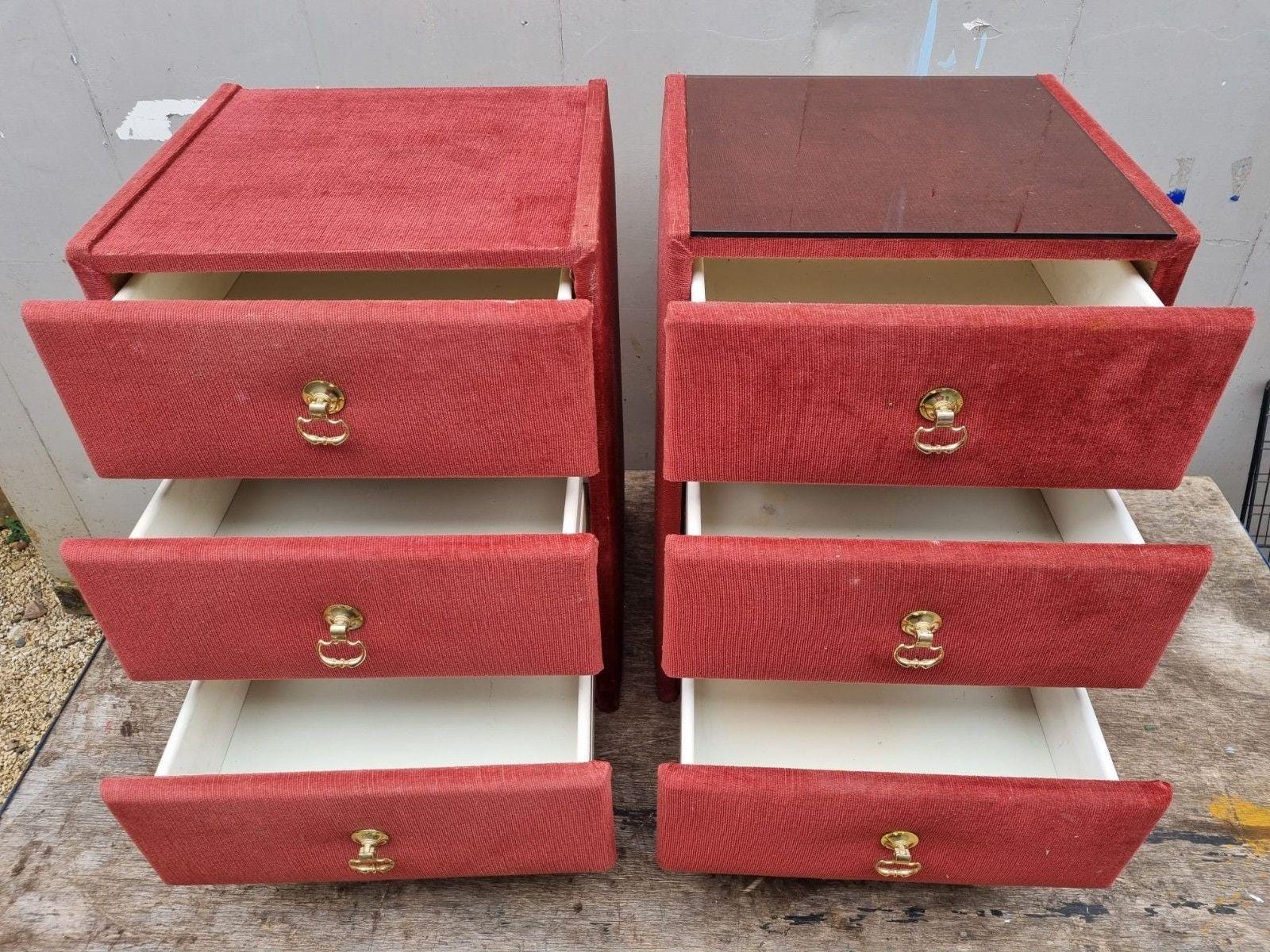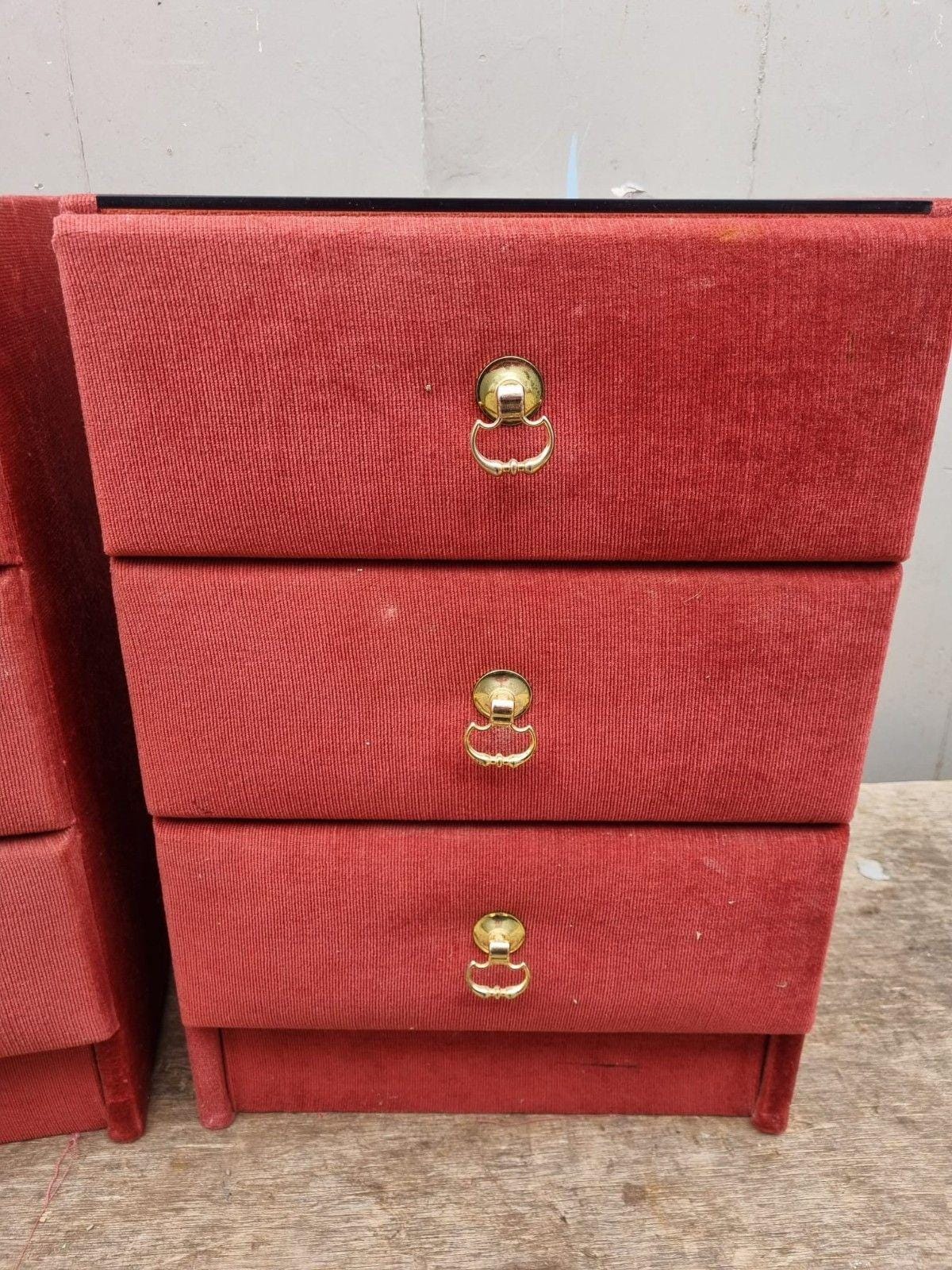 This listing is for a pair of mid-century vintage pink velvet bedside tables with glass tops, featuring an antique brass handle finish. These retro MCM bedside tables are from the 1970s, fully assembled, and have a pull handle design. Each bedside table has 3 drawers and a solid pink colour with a glass tabletop, perfect for adding a touch of vintage charm to any bedroom. Made in the United Kingdom, these stylish and functional bedside tables offer a unique addition to your home decor. Only one of thesaide tables has glass top.