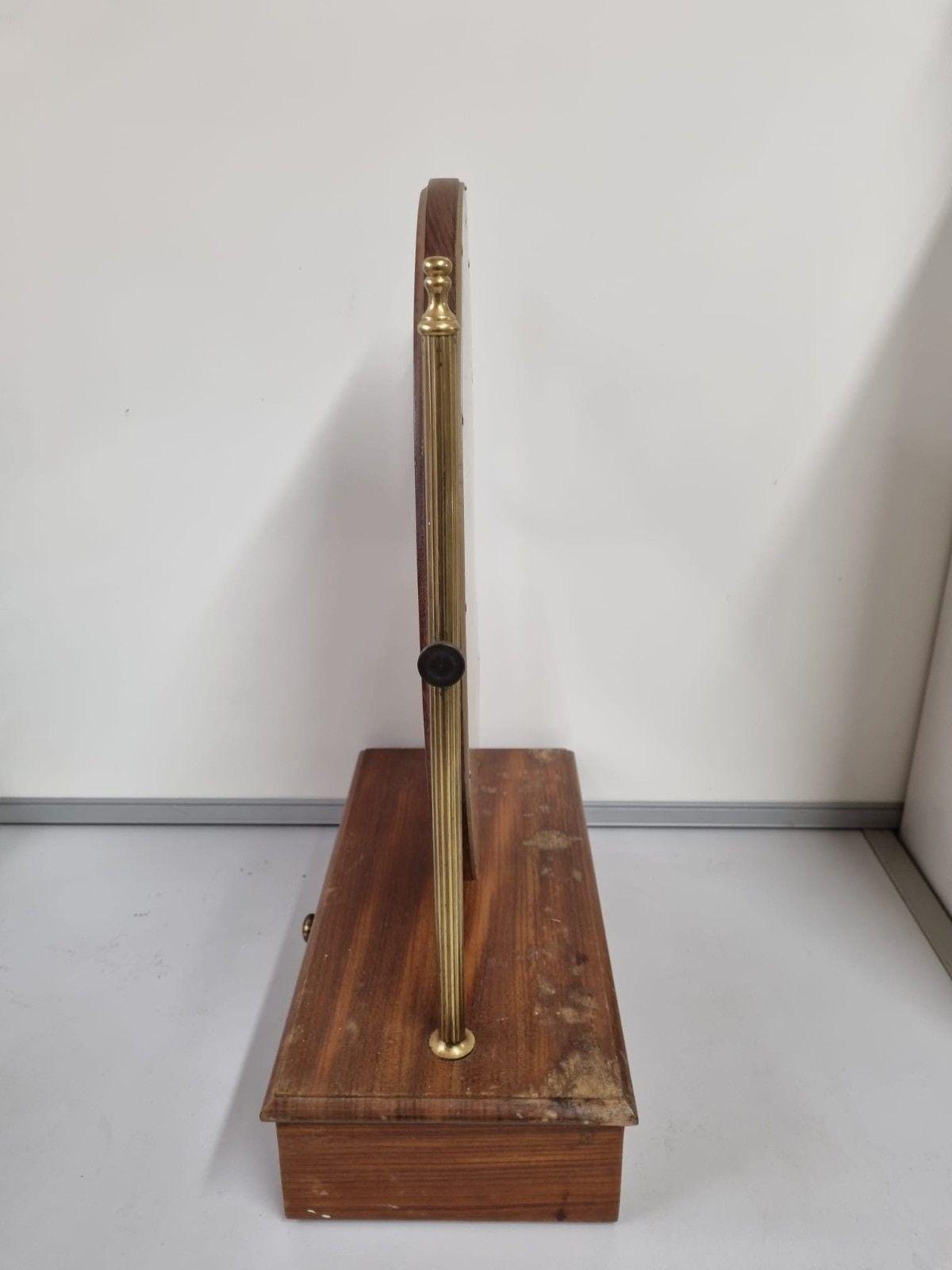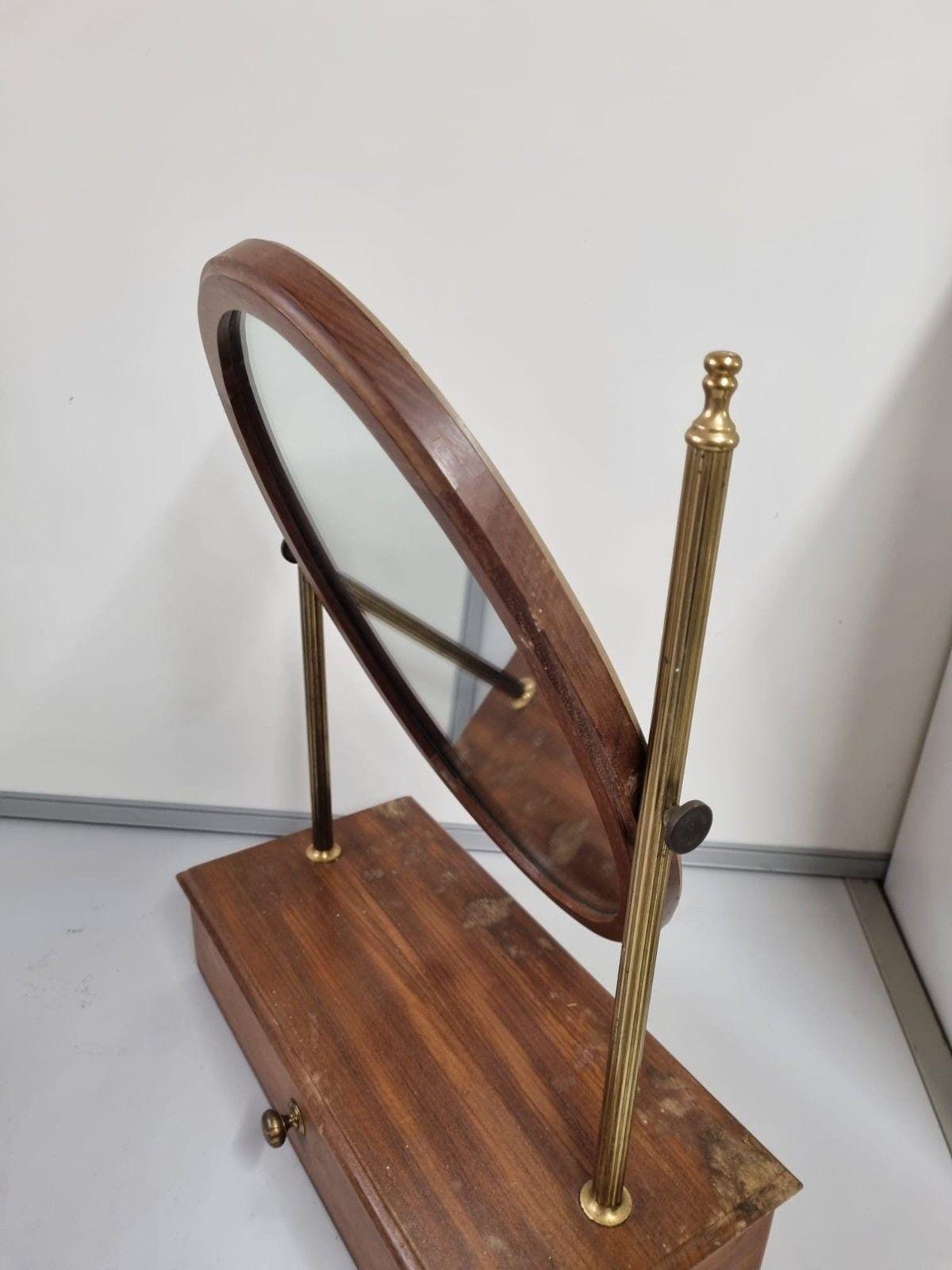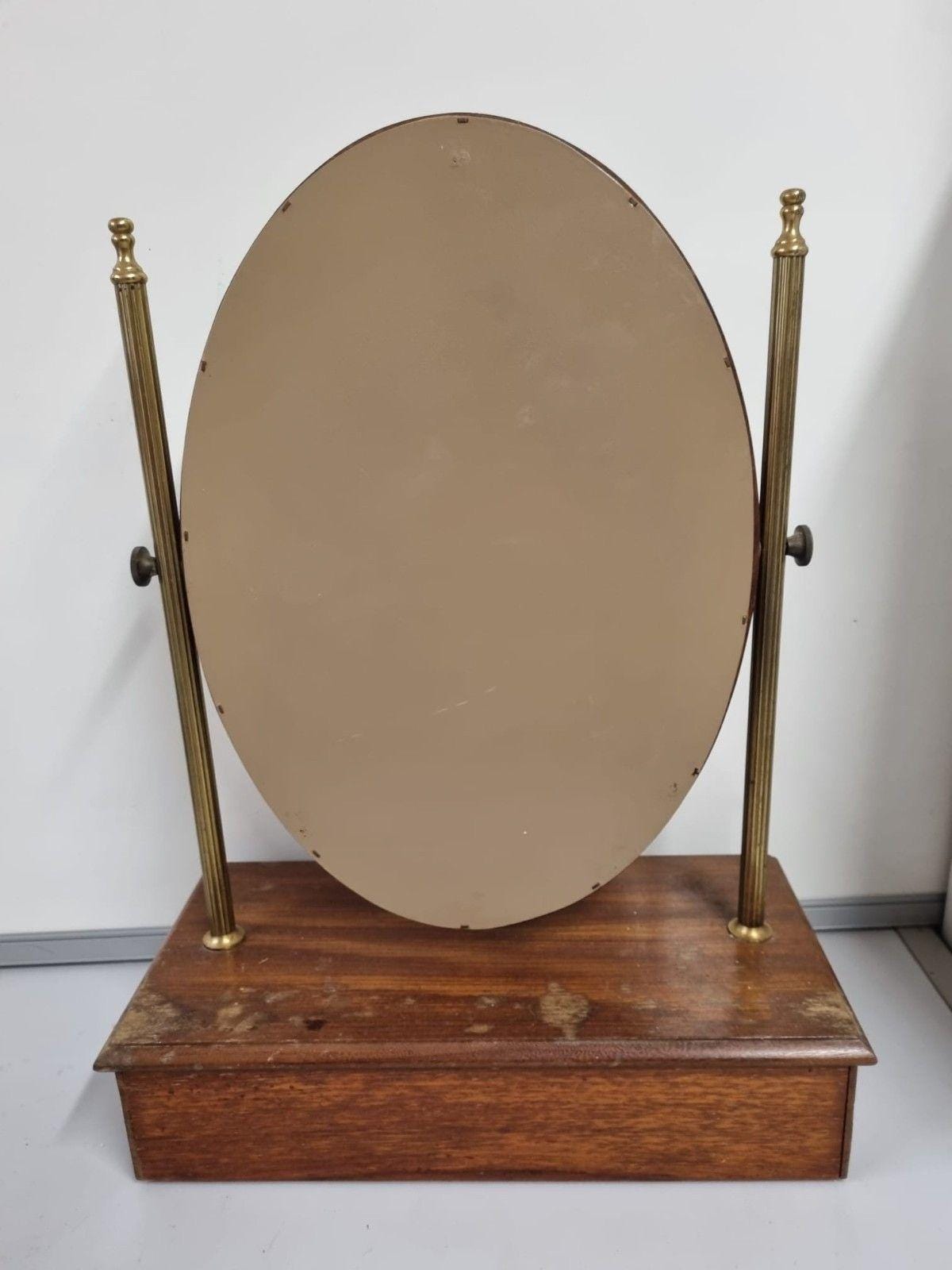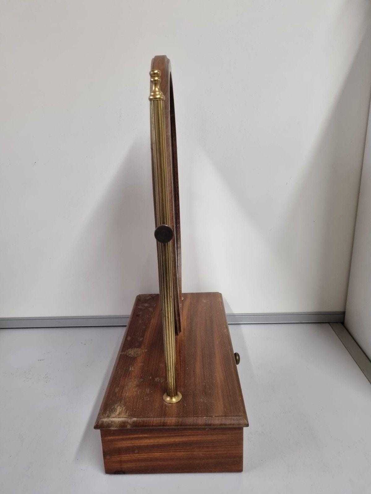This stunning brass and wood counter-top and drawer 1920s swing mirror features an oval shape with a mirrored frame finish, exuding a gold colour in the Art Nouveau style. Made in the United Kingdom during the early 20th century, this antique standing mirror has a freestanding mounting and a height of 36cm, making it a unique and elegant piece for any room in your home.