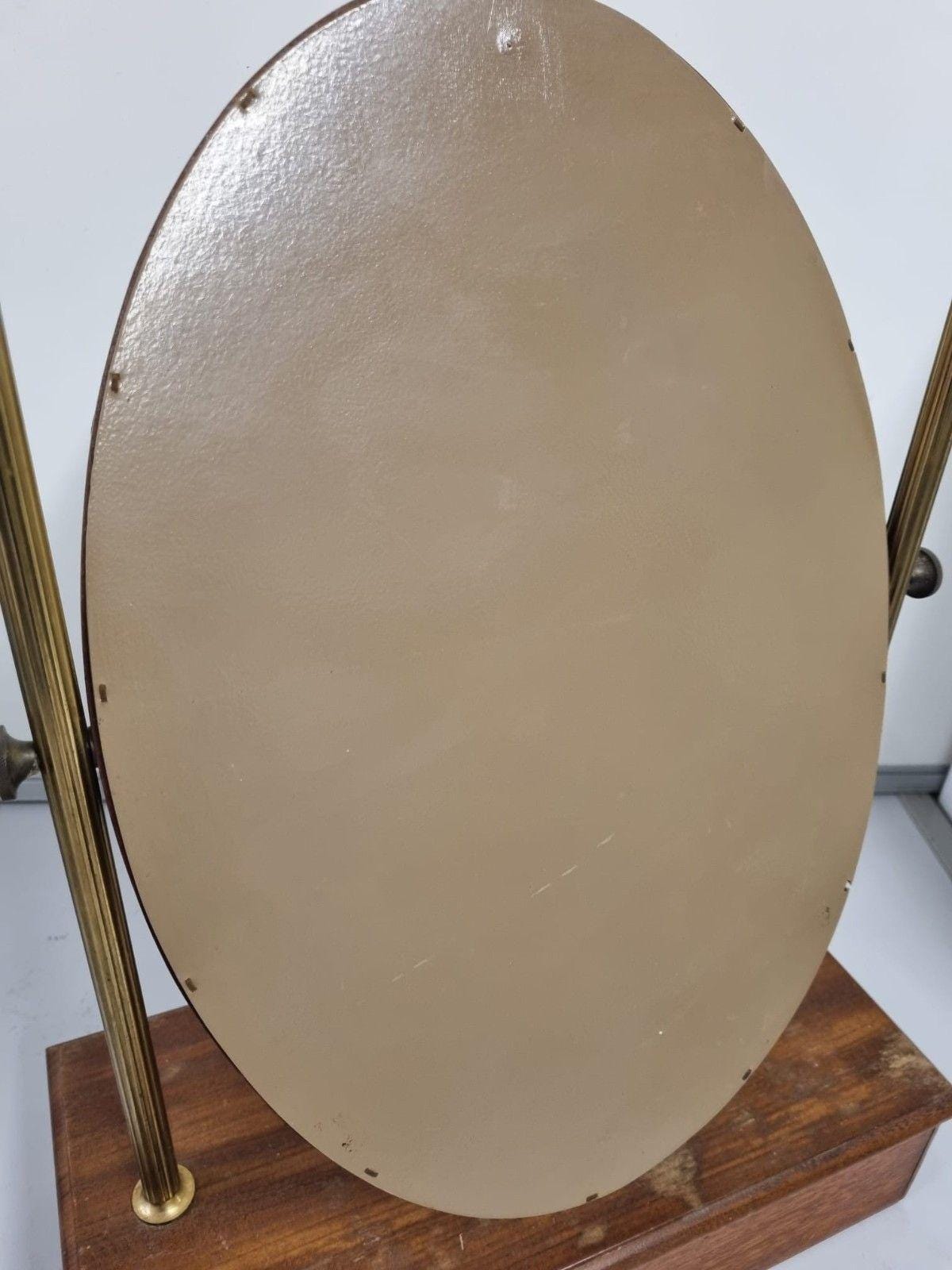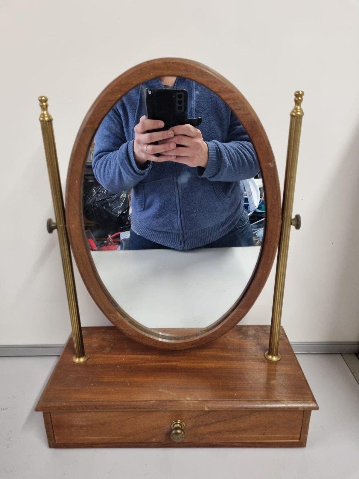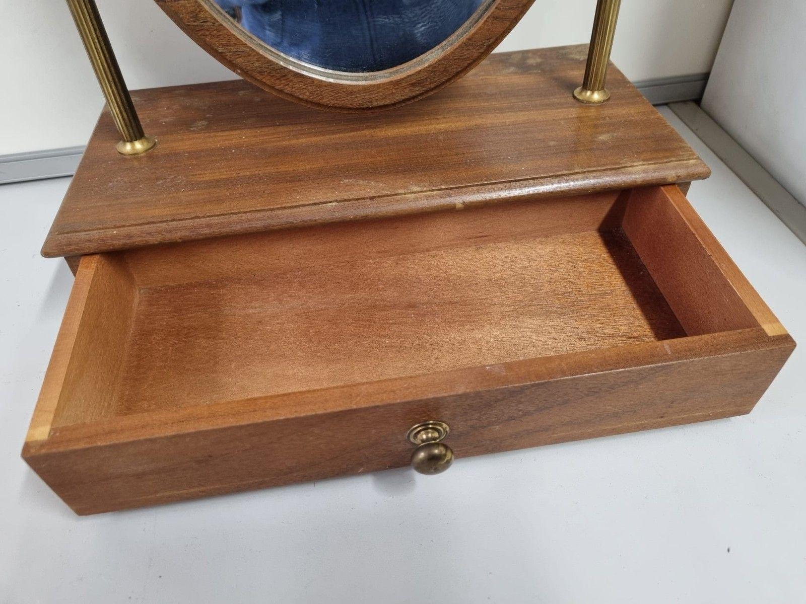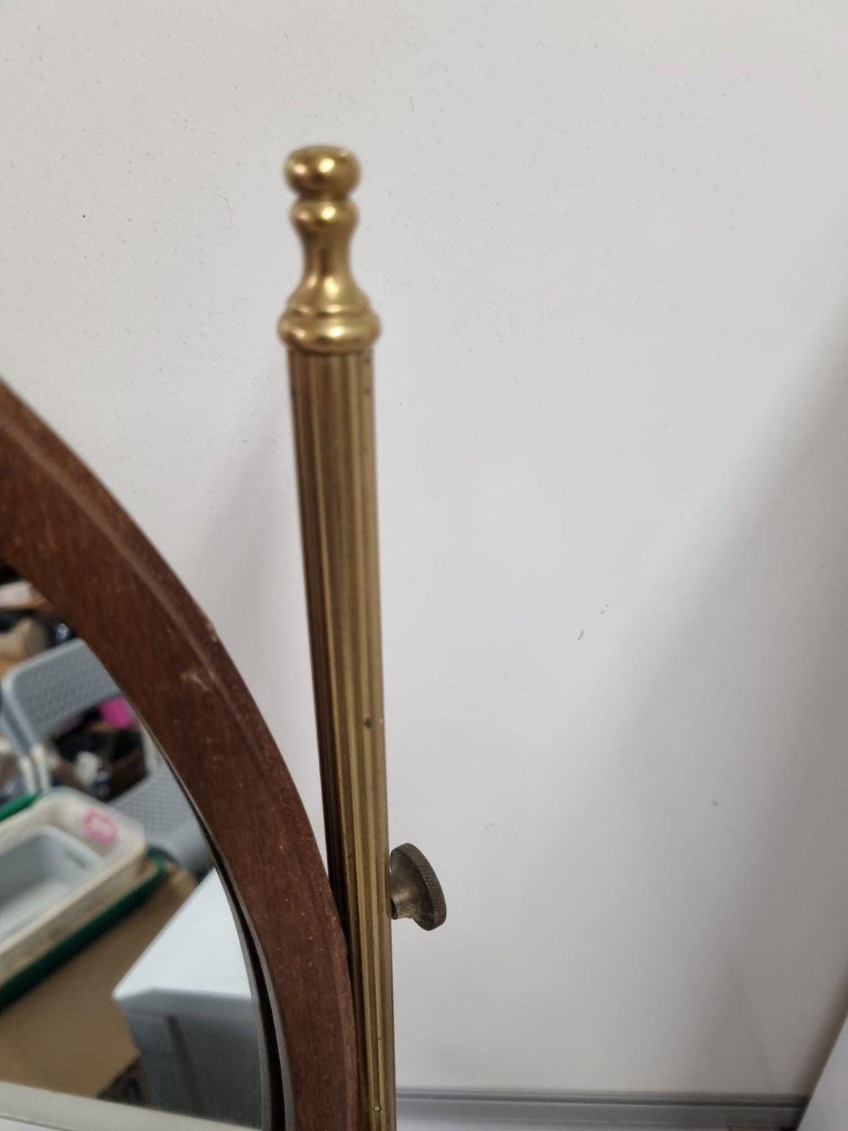 This stunning brass and wood counter-top and drawer 1920s swing mirror features an oval shape with a mirrored frame finish, exuding a gold colour in the Art Nouveau style. Made in the United Kingdom during the early 20th century, this antique standing mirror has a freestanding mounting and a height of 36cm, making it a unique and elegant piece for any room in your home.