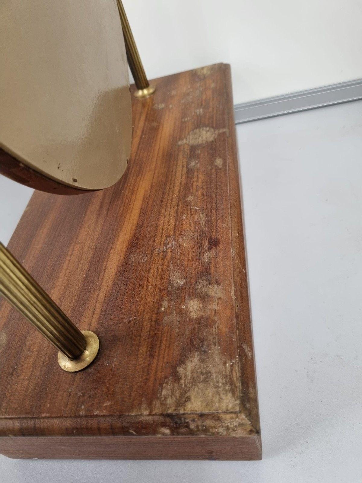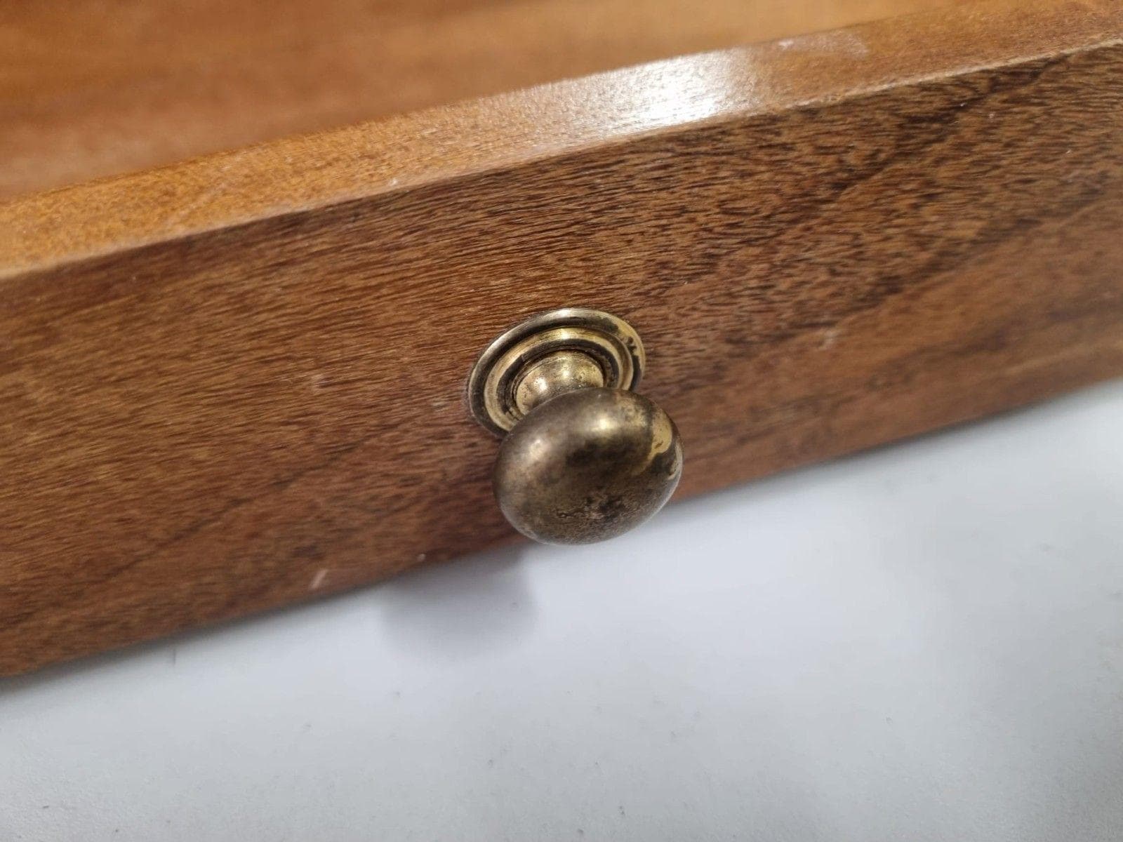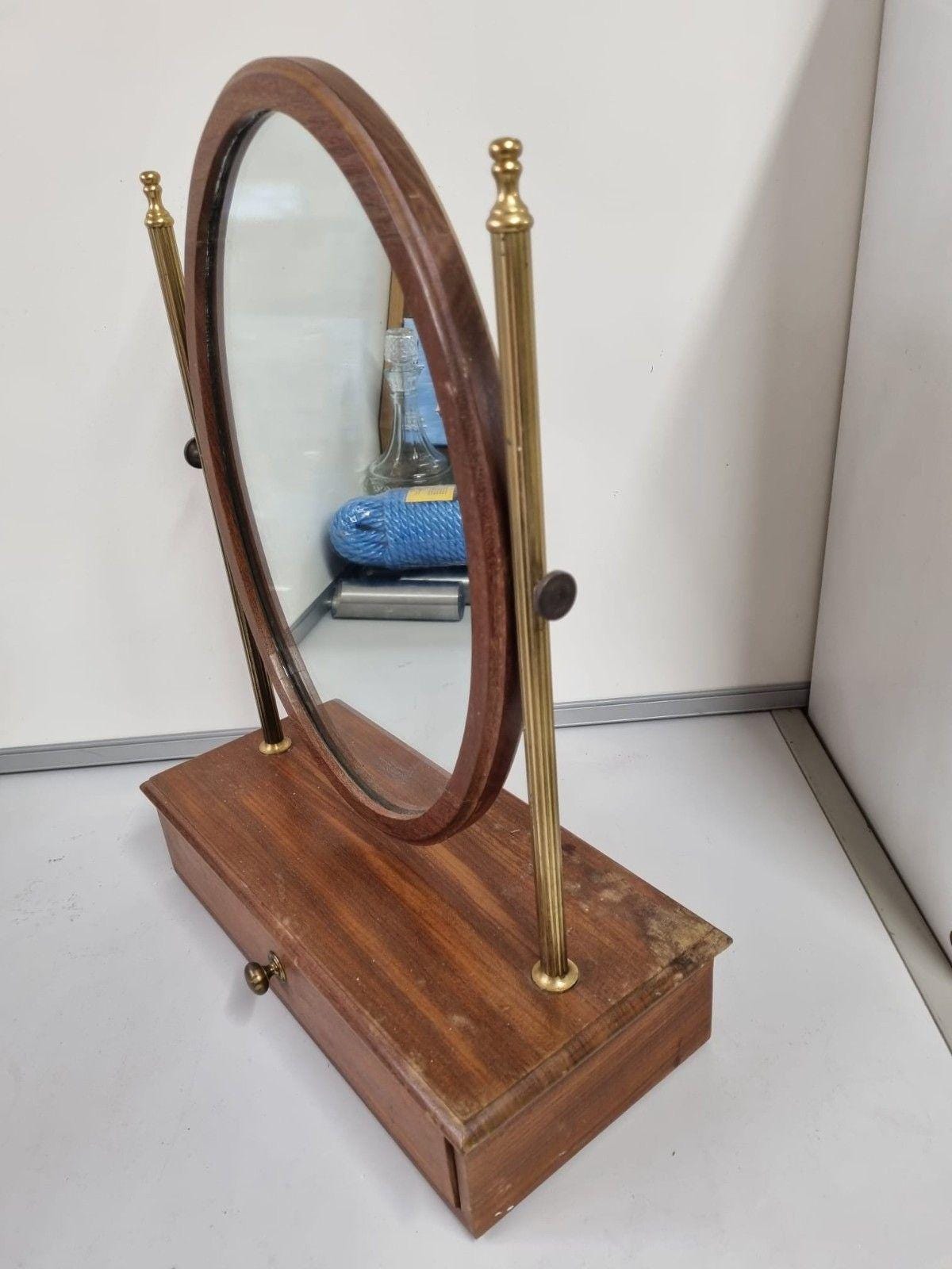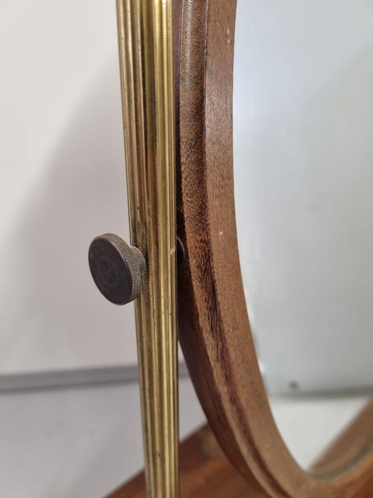 This stunning brass and wood counter-top and drawer 1920s swing mirror features an oval shape with a mirrored frame finish, exuding a gold colour in the Art Nouveau style. Made in the United Kingdom during the early 20th century, this antique standing mirror has a freestanding mounting and a height of 36cm, making it a unique and elegant piece for any room in your home.